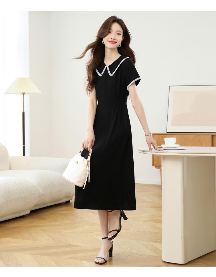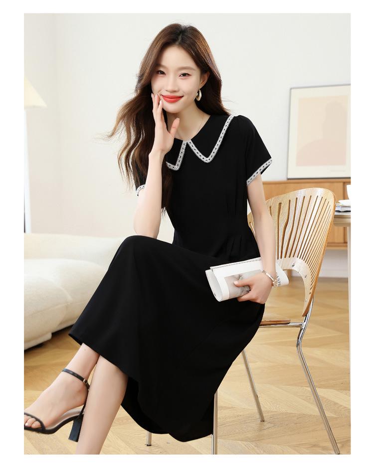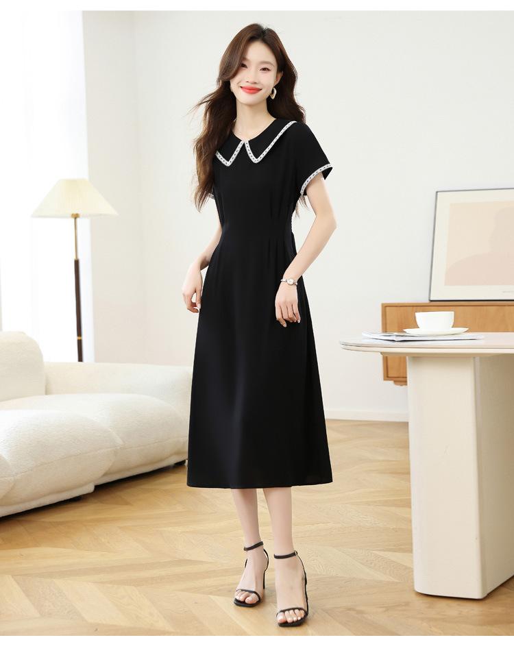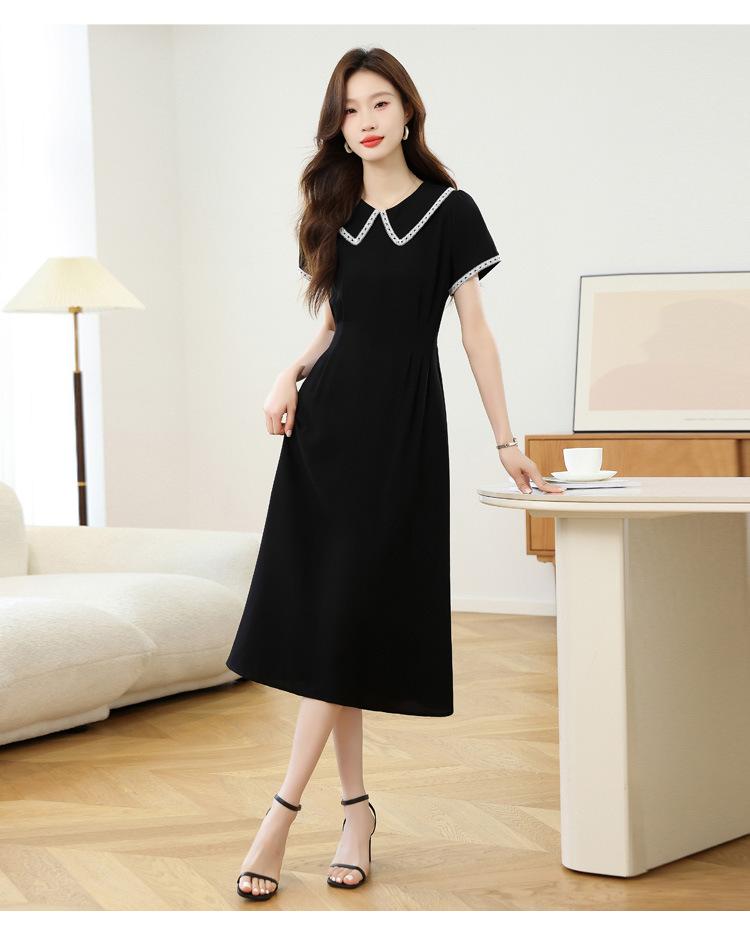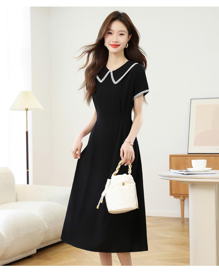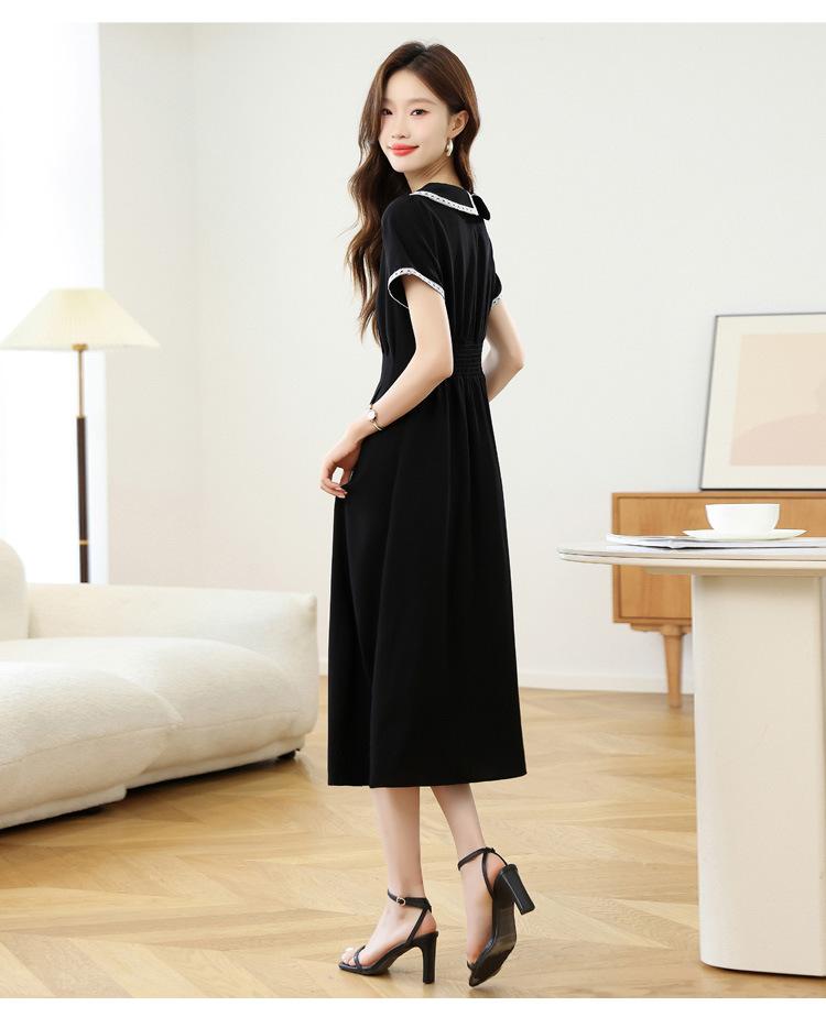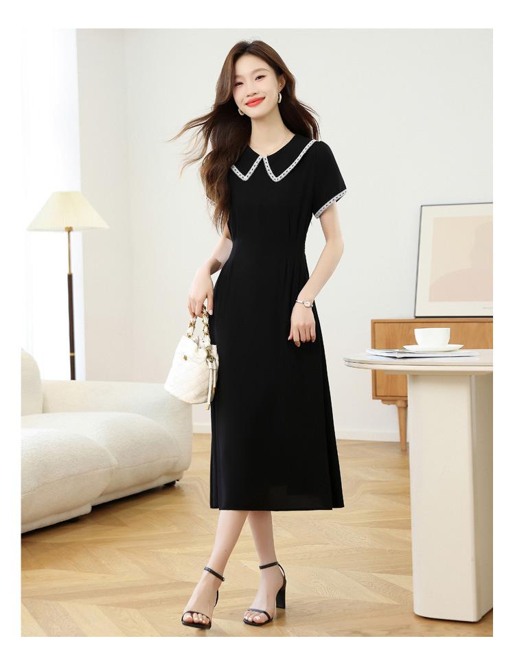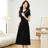 Elegante vestido negro con cuello de muñeca para mujer, verano 2025, nuevo estilo francés, adelgazante, retro, vestido largo con cintura ceñida