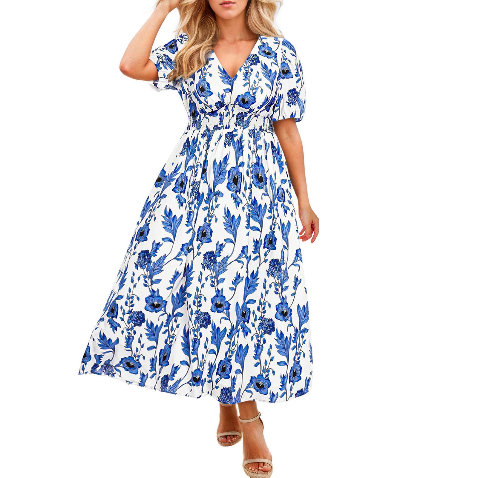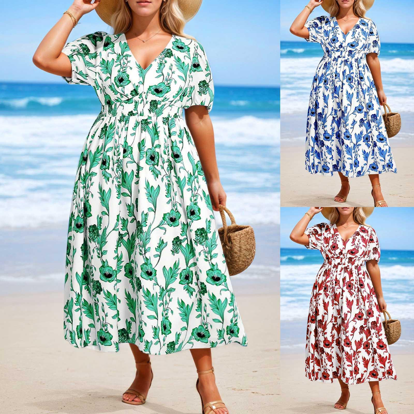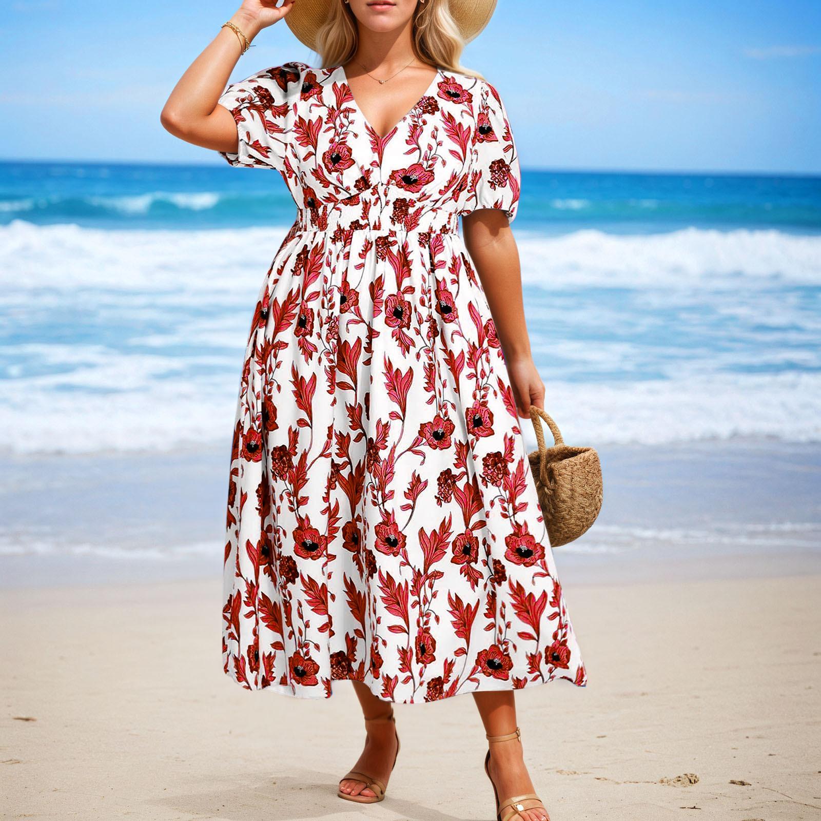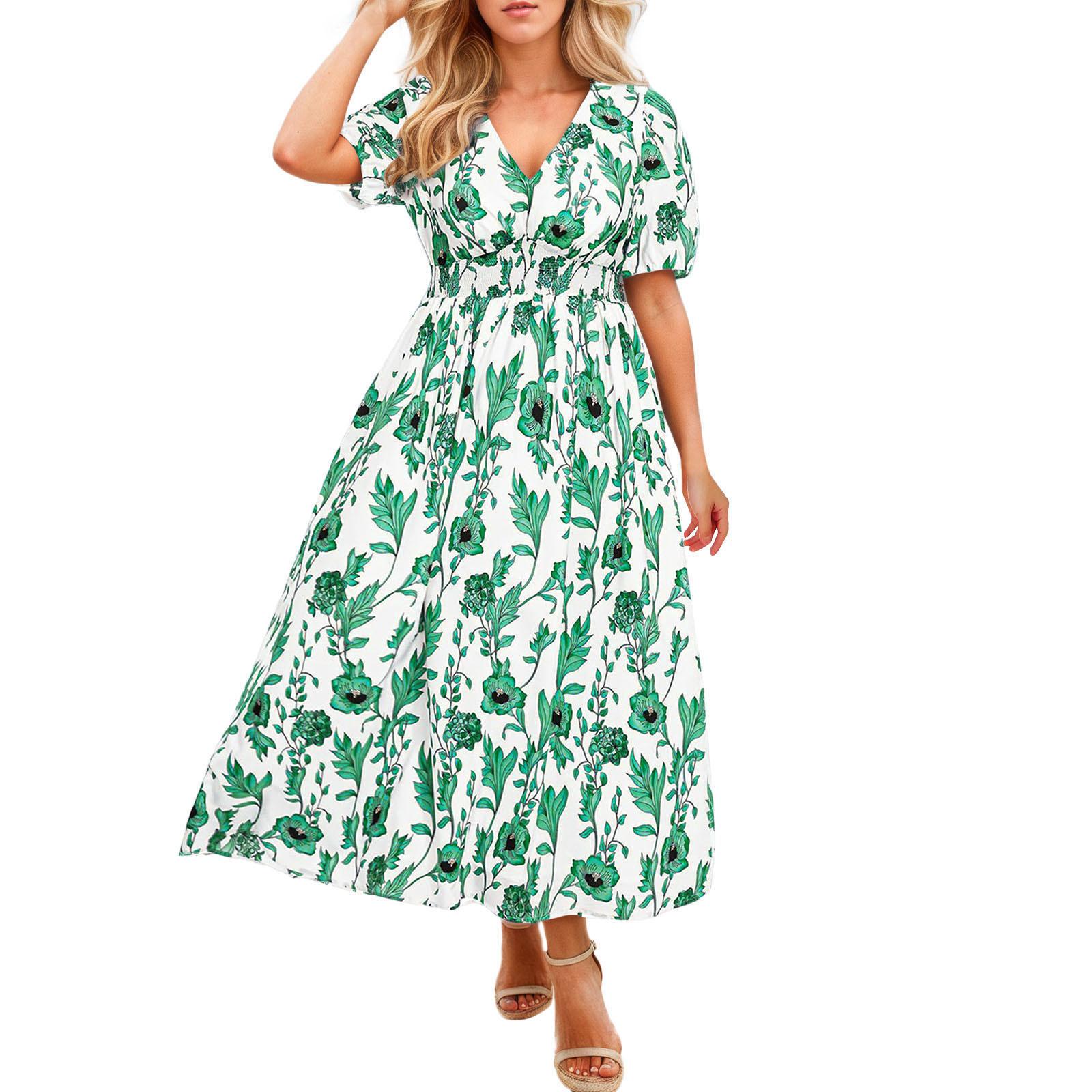 Vestido de línea A con cuello en V para mujer europea y americana de talla grande Cintura alta Adelgazante Manga corta Flor Midi Casual Estampado