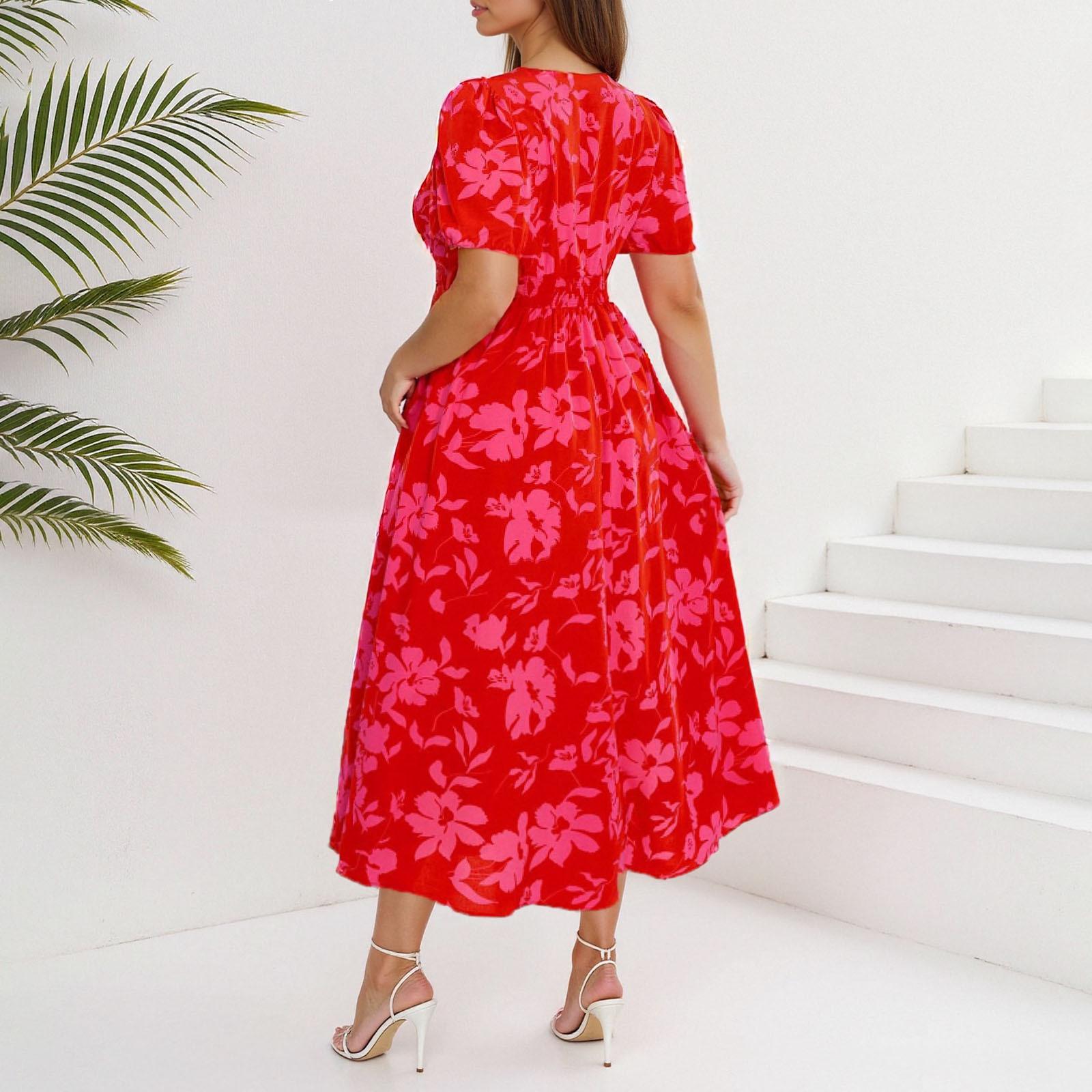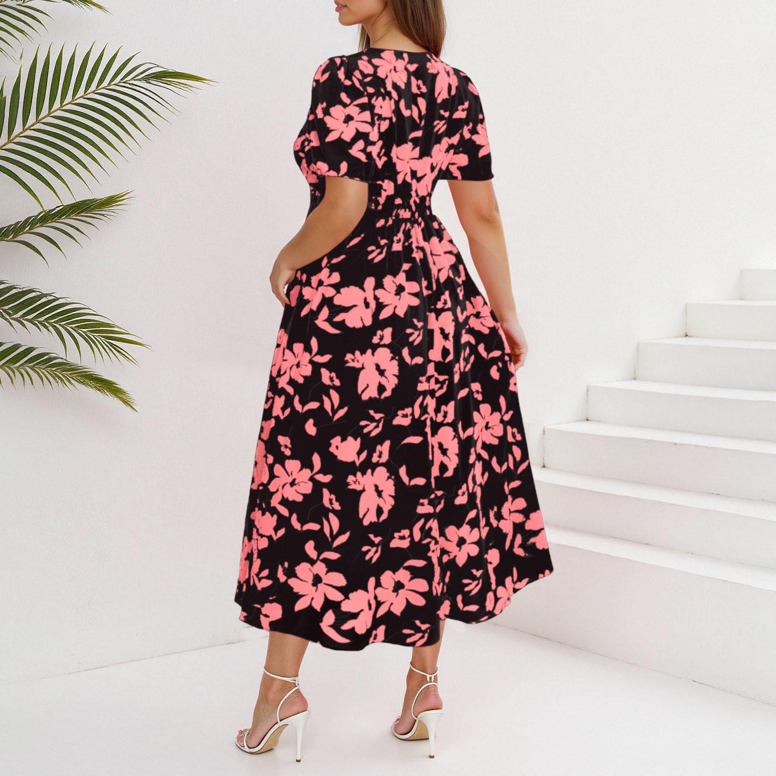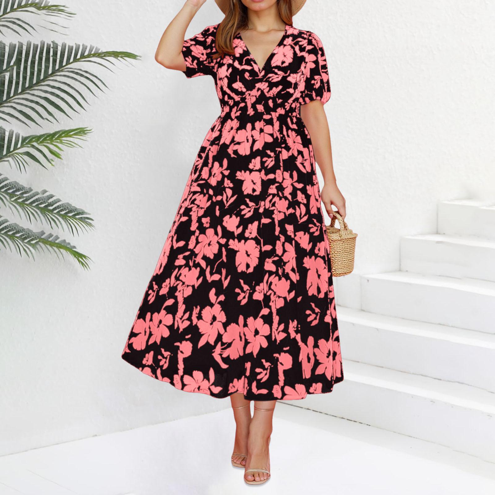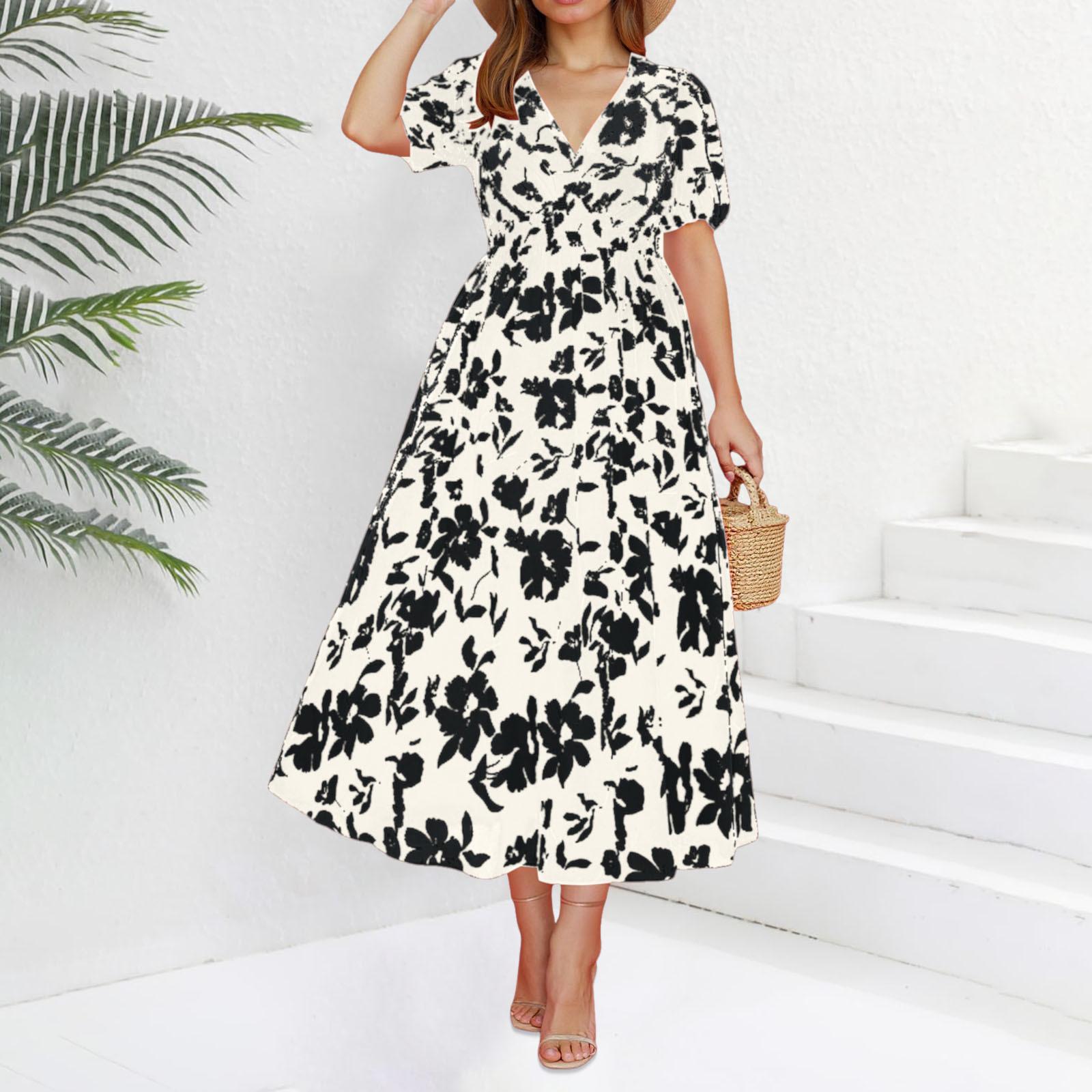 Vestido de línea A con cuello en V para mujer europea y americana de talla grande Cintura alta Adelgazante Manga corta Flor Midi Casual Estampado
