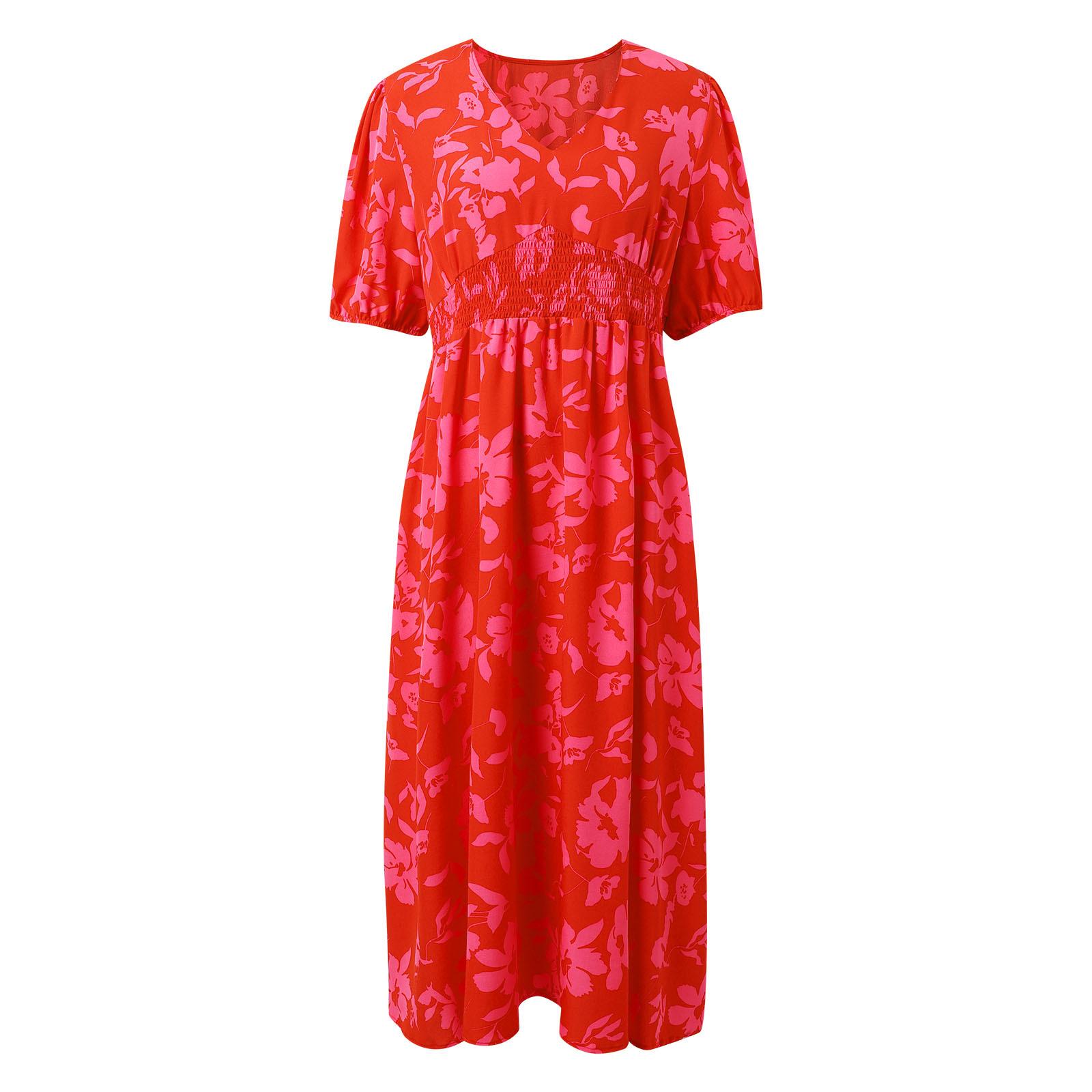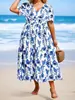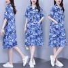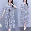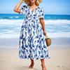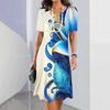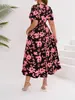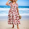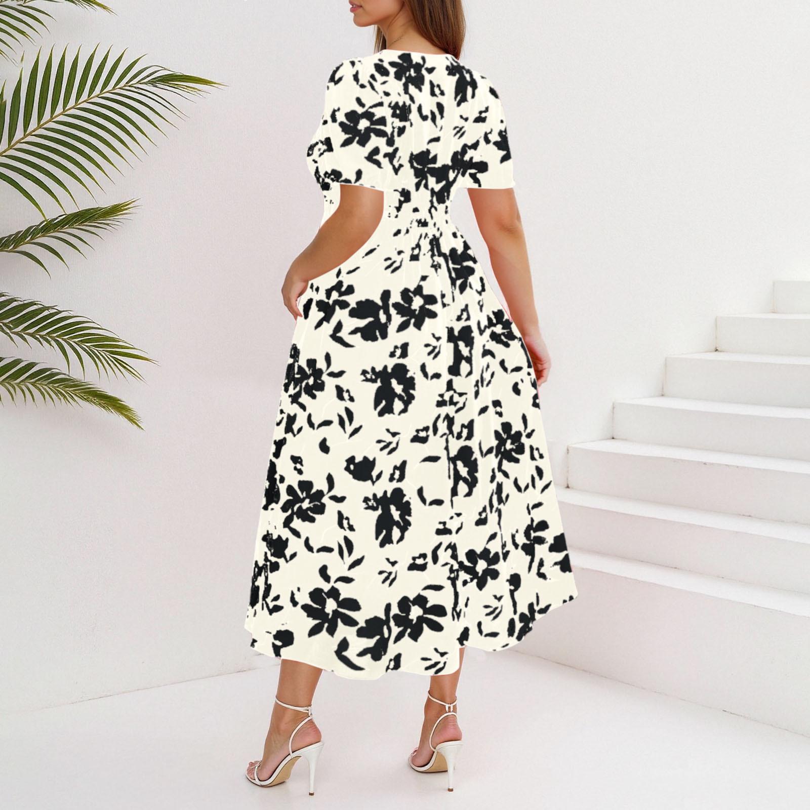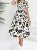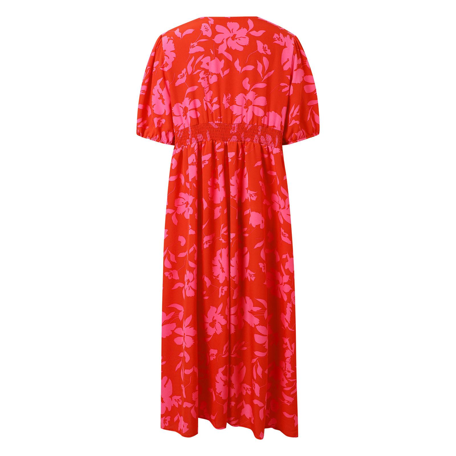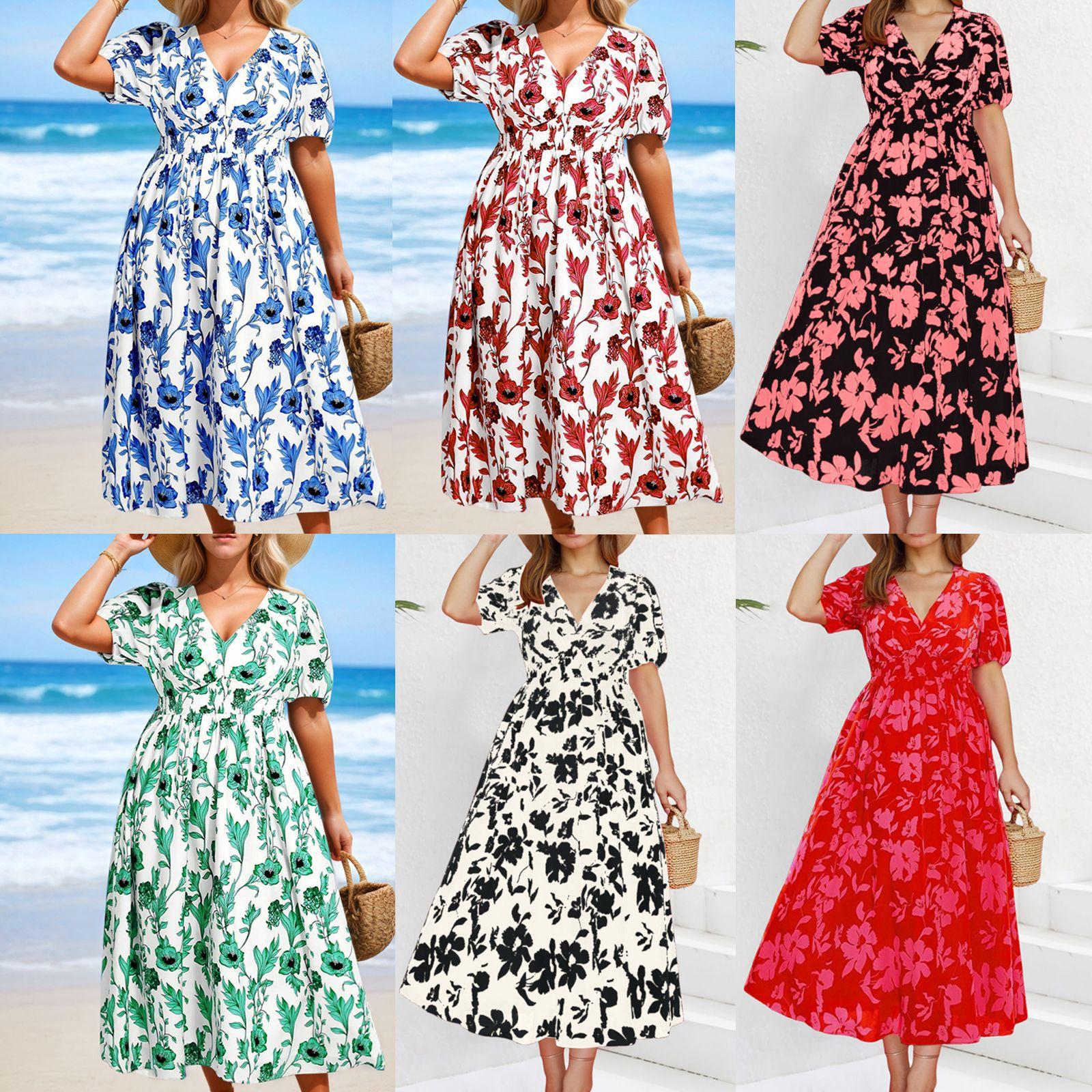Vestido de línea A con cuello en V para mujer europea y americana de talla grande Cintura alta Adelgazante Manga corta Flor Midi Casual Estampado