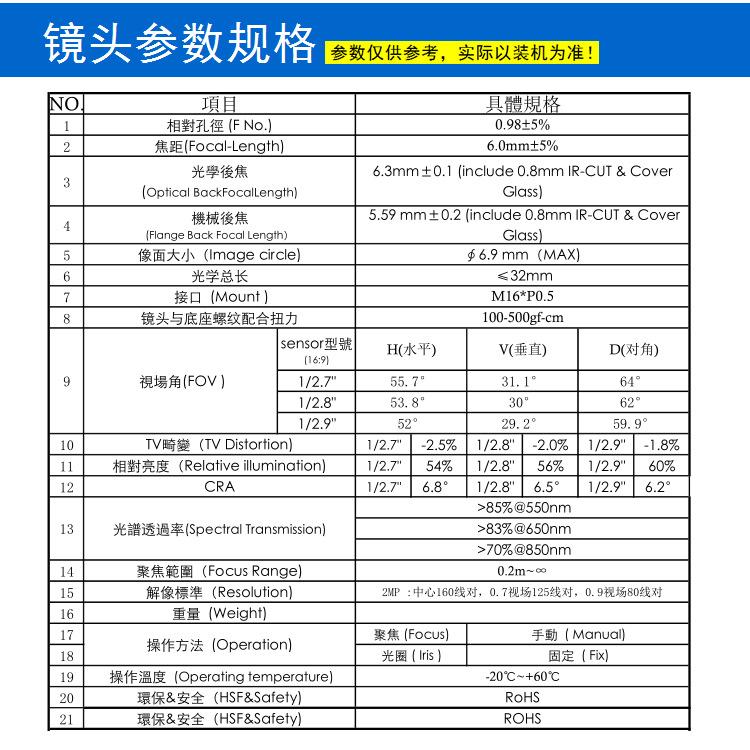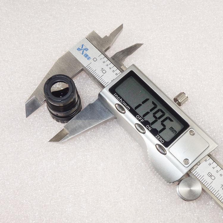 【1】La lente es frágil. No la deje caer, golpee ni presione. Manténgala alejada de objetos afilados, corrosivos, sucios, húmedos, calientes, polvorientos y otros objetos y entornos de uso. 【2】No frote ni rasque el lente con fuerza ni lo remoje en agua. 【3】Si la rosca se siente incómoda al enroscar durante el enfoque, agregue una pequeña cantidad de lubricante para evitar que la rosca se deslice. 【IV】El enfoque se puede ajustar de lejos a cerca o de cerca a lejos, y girar ligeramente en ambas direcciones para encontrar la mejor posición de imagen. Tenga cuidado de no acercarse demasiado al CCD al girarlo para evitar daños. [Cinco] Si la lente se gira a la posición más interna, se puede enfocar la vista de cerca, pero la distancia que desea no se puede enfocar, significa que el núcleo de la placa de la cámara es demasiado superficial y esta lente no es adecuada para usar. Si el objetivo no se puede enfocar incluso después de girarlo a la posición más externa, puede instalar un teleconvertidor y ajustar gradualmente el enfoque. 3. Parámetros y especificaciones Nombre: Lente de visión nocturna de alta definición de baja iluminación super estrella M16 especificación distancia focal 6mm Interfaz: M16x0.5 Longitud focal óptica: 6mm Transmisión: F0.98 Campo de visión: aproximadamente 64 grados Superficie del sensor: 1/2.7" Longitud física: 26.6mm Longitud óptica total: 32 mm