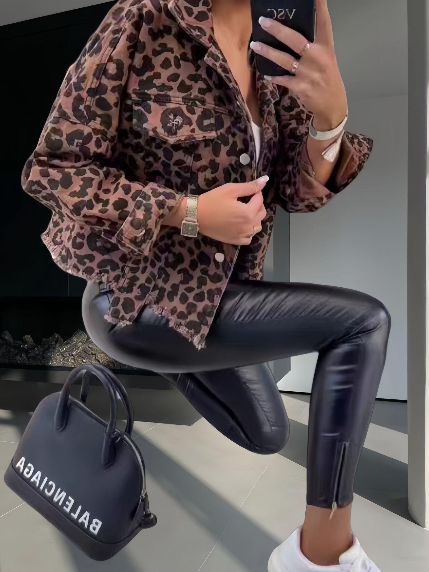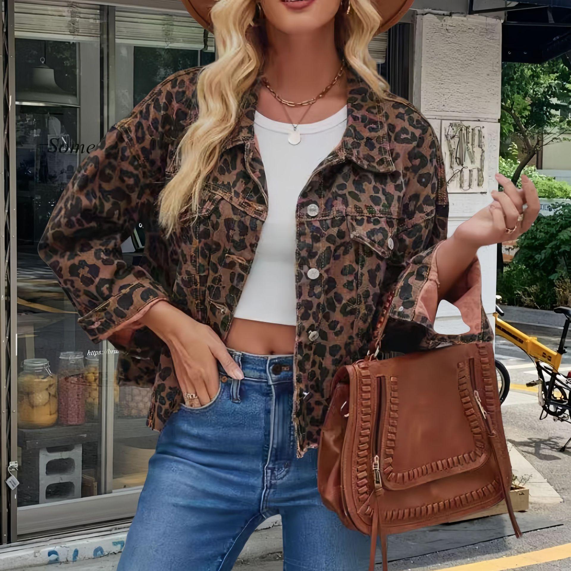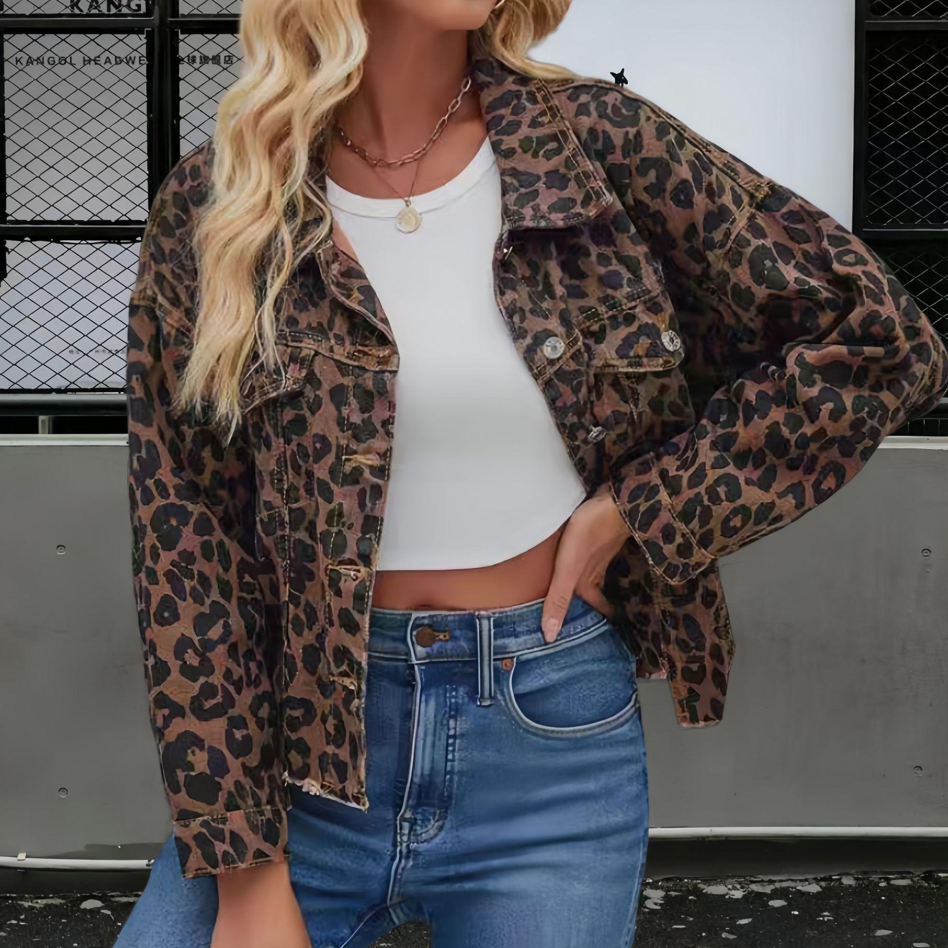 Europa y Estados Unidos transfronterizo nuevo otoño 2024 abrigo de mezclilla estampado de leopardo manga larga corto suelto casual abrigo de moda mujer