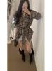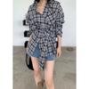 Chaqueta Camisera de Cuadros Estilo Hong Kong para Mujer, Camisa de Manga Larga Estilo Coreano para Primavera y Otoño con Diseño Único, Top Nicho y Distintivo con Lazada en la Cintura