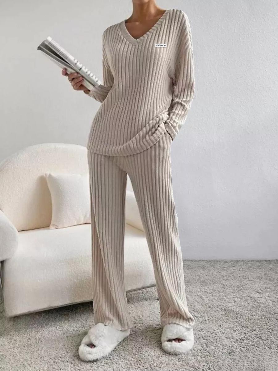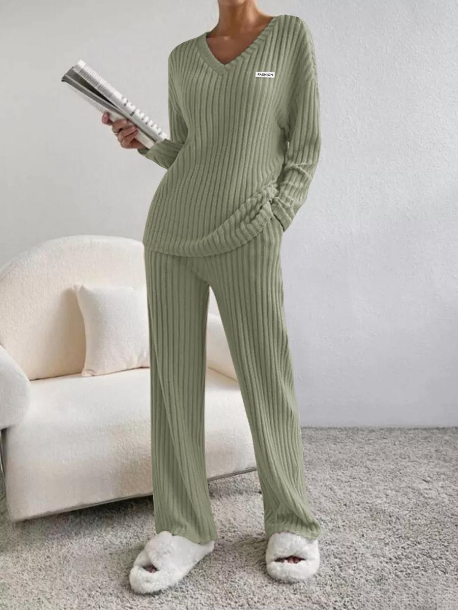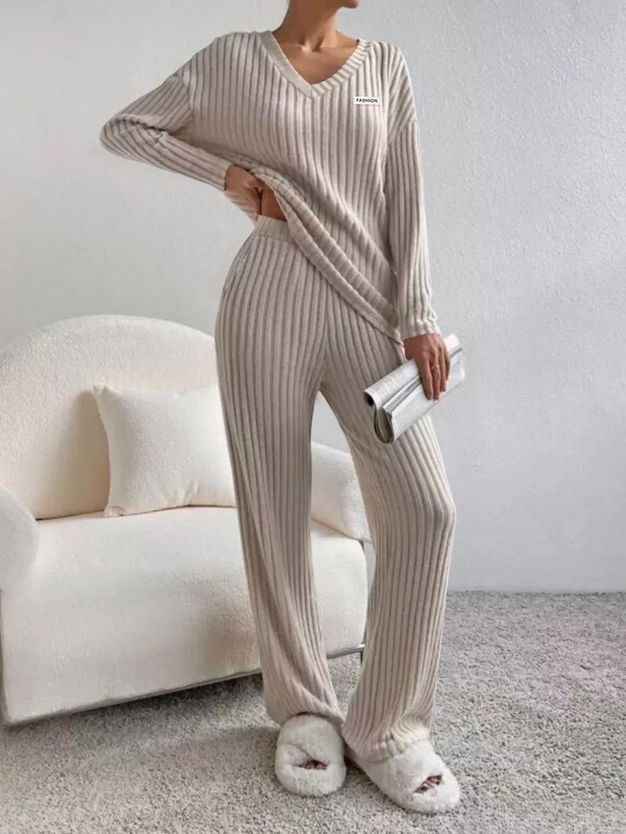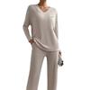 Traje de punto de canalé elegante con cuello en V para mujer, otoño 2025, nueva moda casual, pantalones rectos, de dos piezas transfronterizo