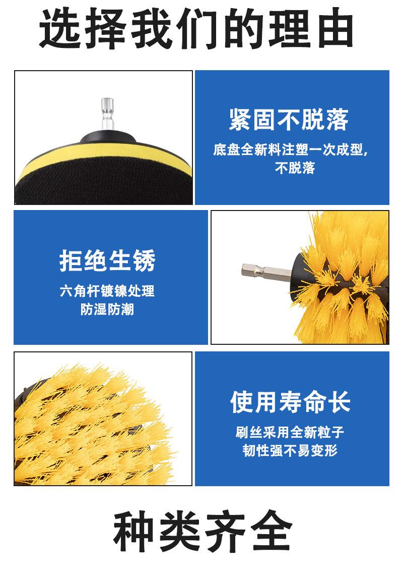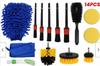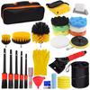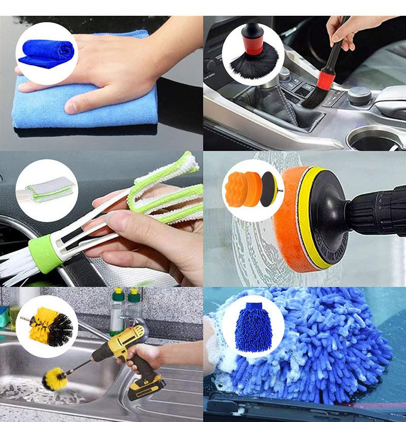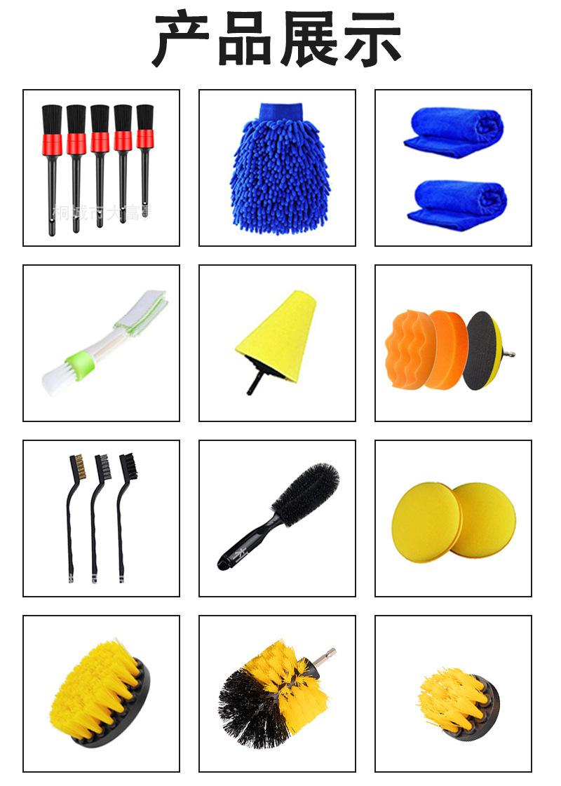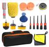 El juego principal de 16 piezas incluye:Cepillo de taladro negro de 2 pulgadas + cepillo de taladro amarillo de 3.5 pulgadas + cepillo de taladro amarillo de 4 pulgadas + cepillo de taladro blanco de 4 pulgadas + esponja plana naranja de 4 pulgadas + esponja curva naranja de 4 pulgadas + disco adhesivo amarillo de 4 pulgadas + juego de 5 piezas de cepillo para detalles de coche + guantes de chenilla + cepillo para salida de aire acondicionado de coche + toalla azul * 2. Peso de un juego: aproximadamente 640g
