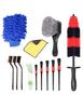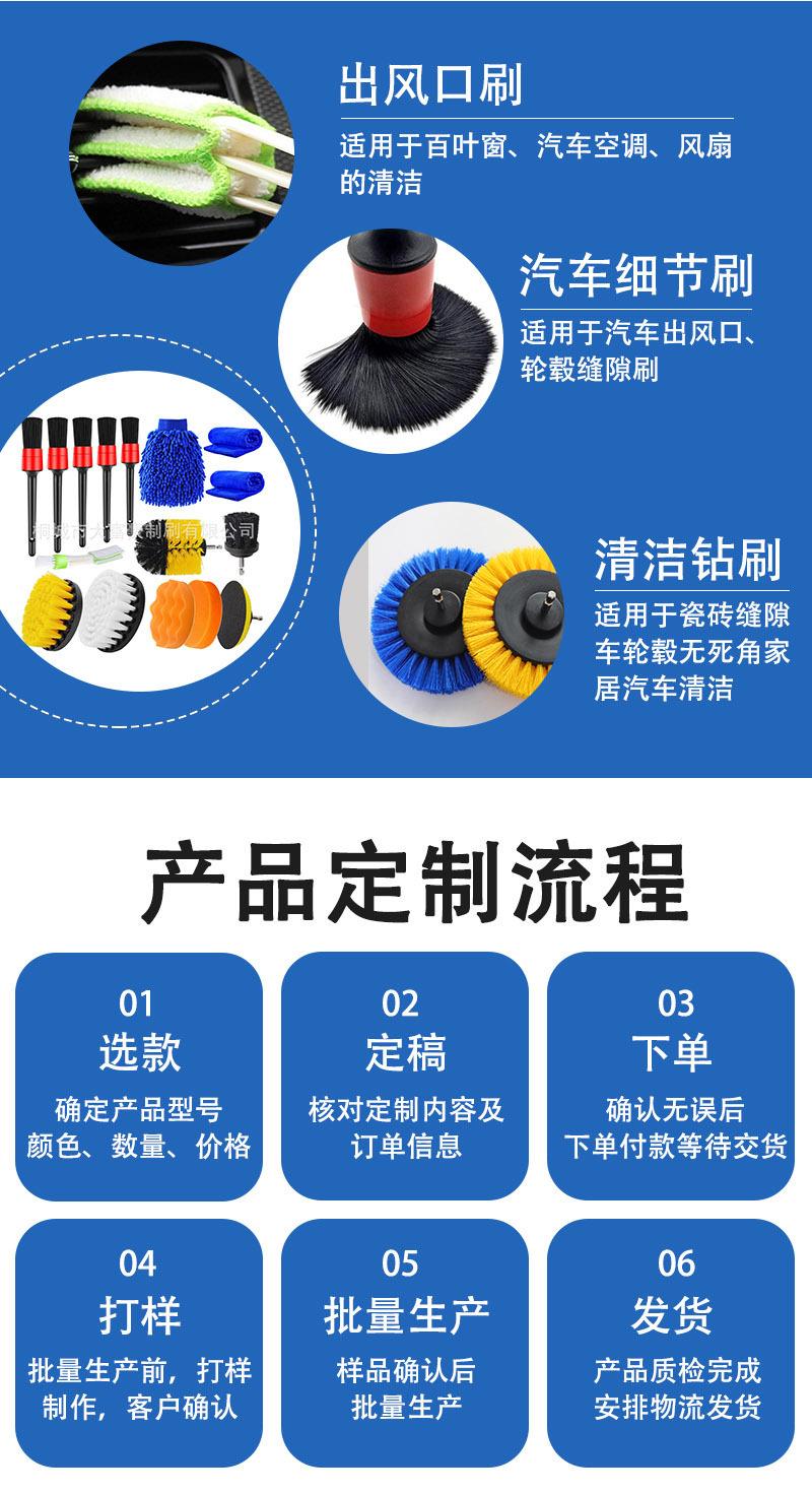 El juego principal de tres piezas de 15 piezas incluye:Set de 5 cepillos para detalles de coche + set de 3 cepillos de alambre de acero + cepillo para llantas de coche + esponja amarilla*2 + cepillo azul para rejillas de ventilación del aire acondicionado + guante de chenilla + toalla azul*2. Peso del set: aproximadamente 460g
