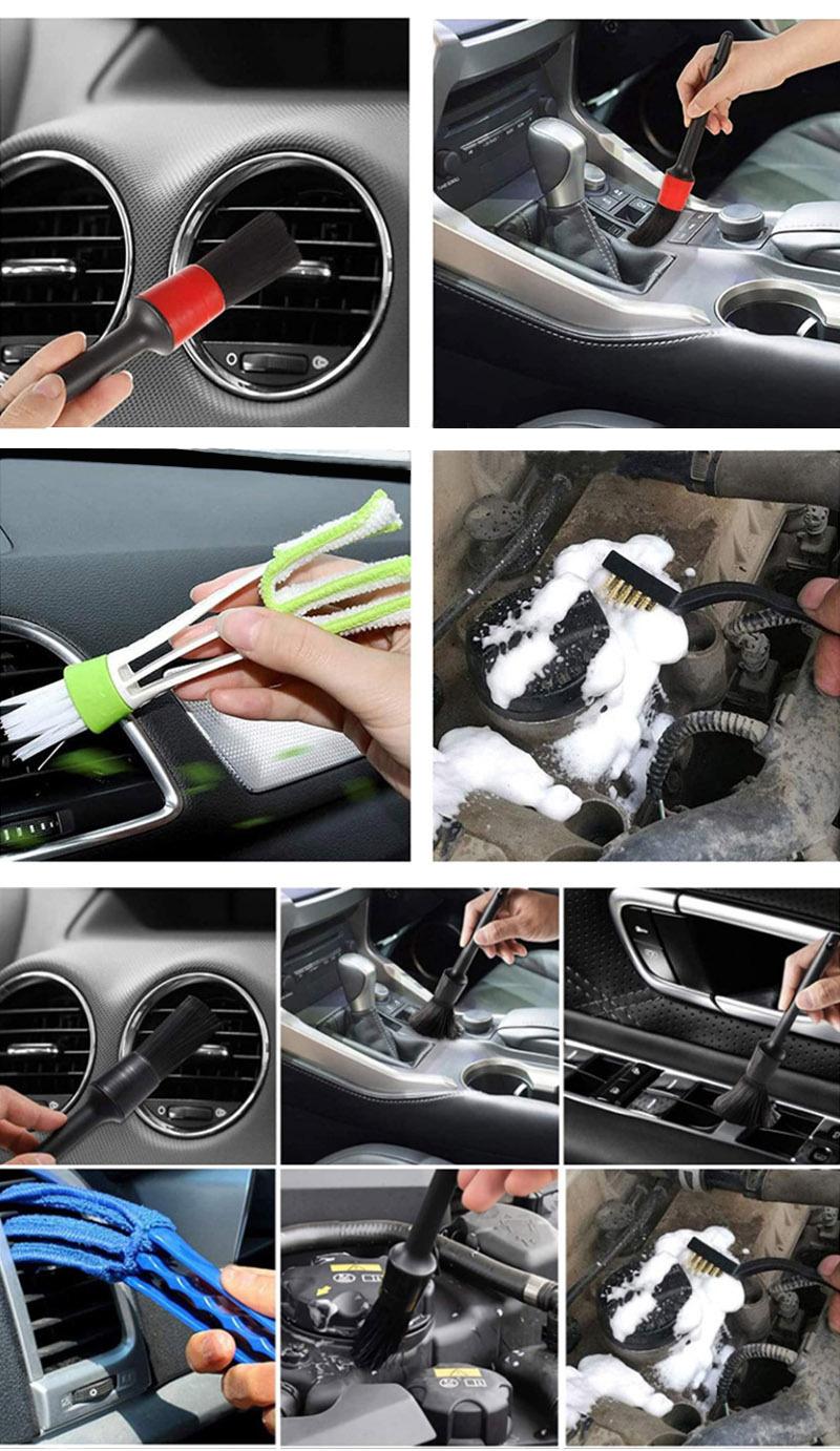 El juego principal de cinco piezas de 9 piezas incluye:Juego de 5 cepillos para detalles de coche + juego de 3 cepillos de alambre + cepillo azul para salida de aire acondicionado de coche. Peso de un juego: alrededor de 255 g