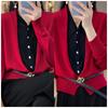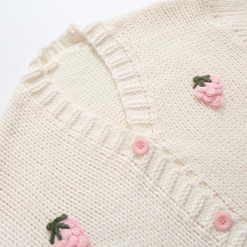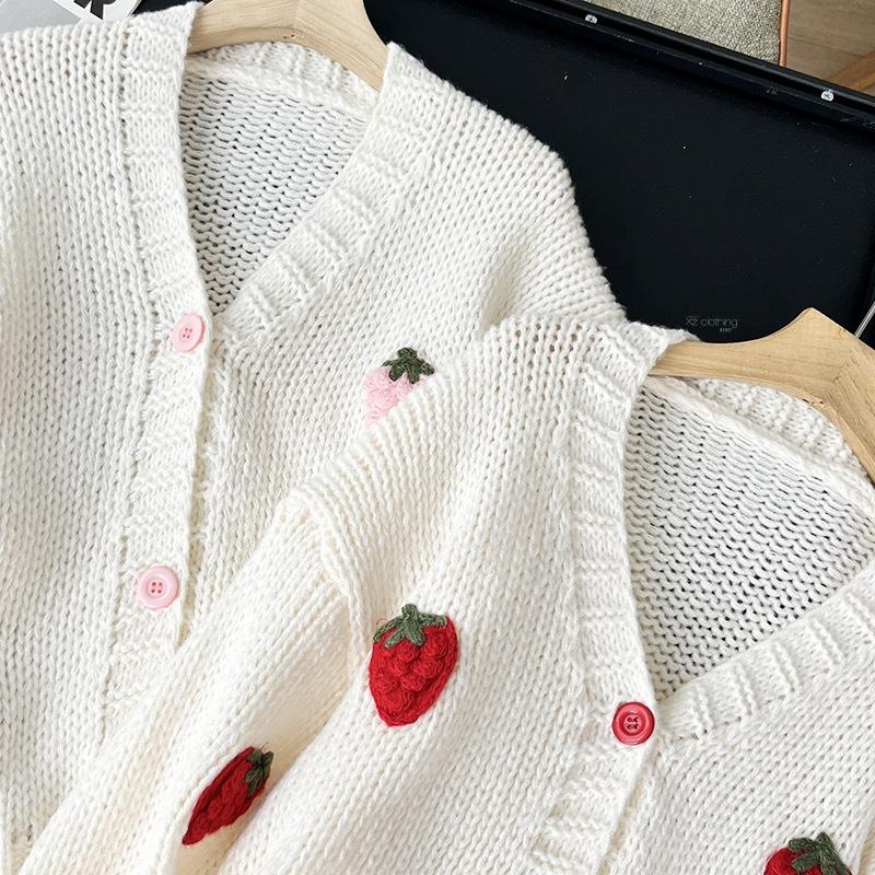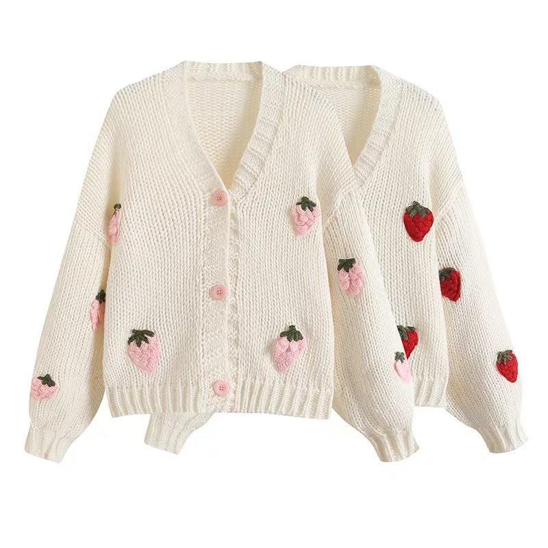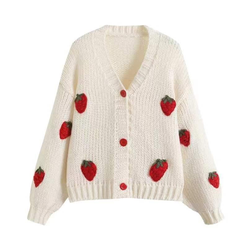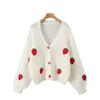 Cárdigan de Punto Jacquard de Fresa Bordado Estéreo Reductor de Edad de Moda Nuevo Otoño e Invierno Europeo y Americano Suéter de Cuello en V Suave y Ceroso Amigable con la Piel