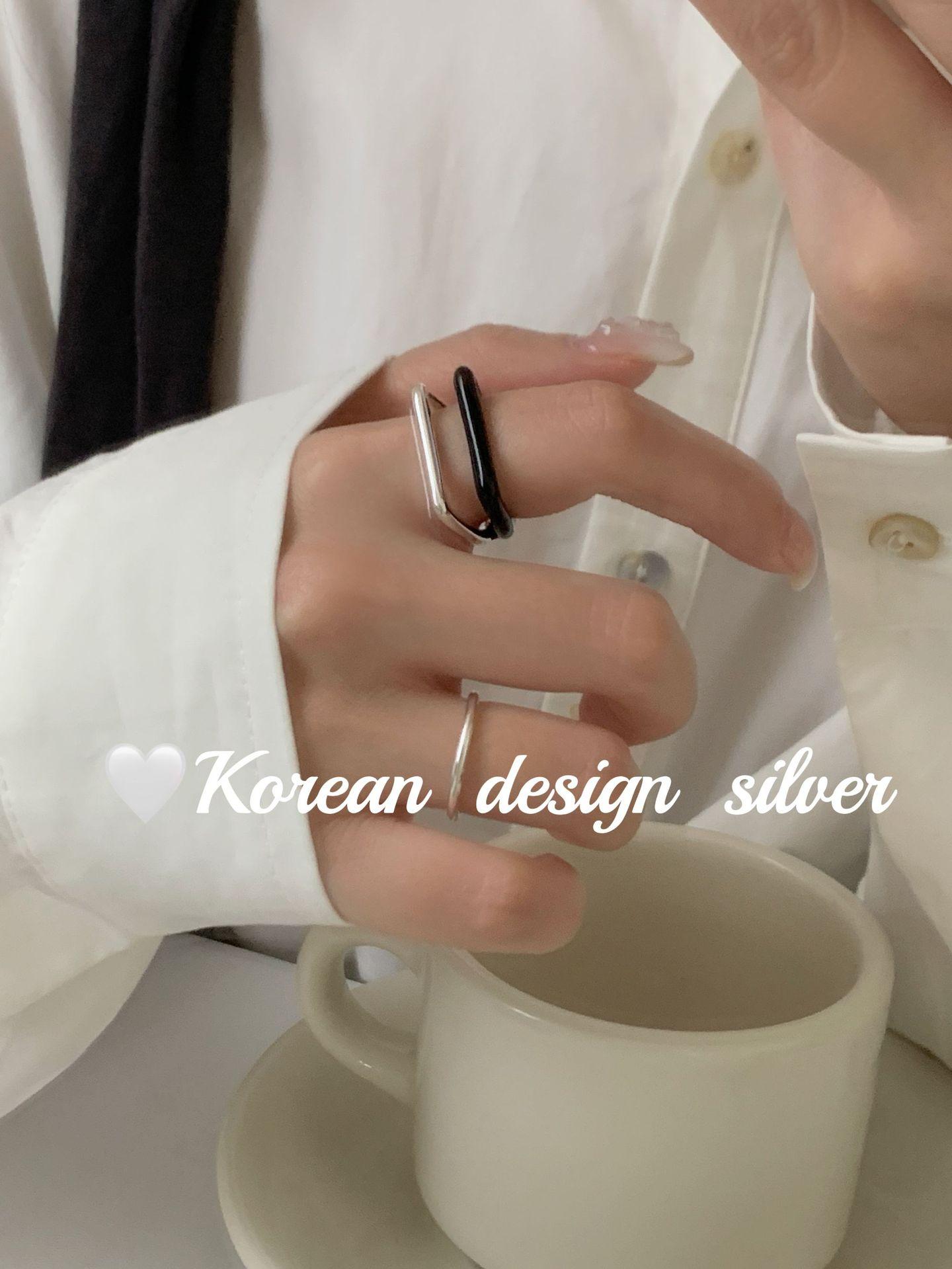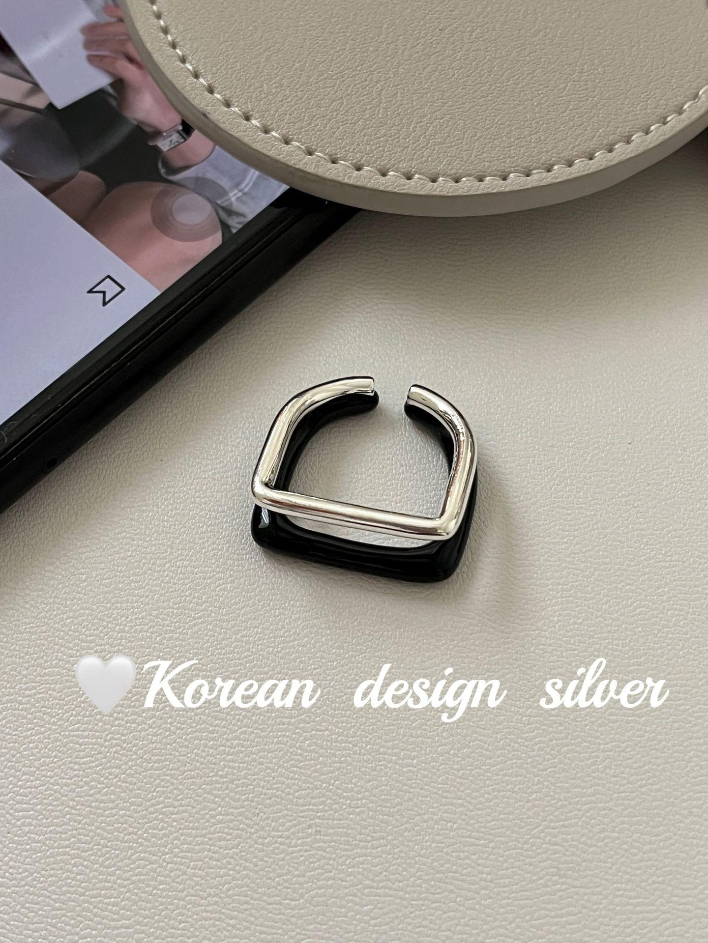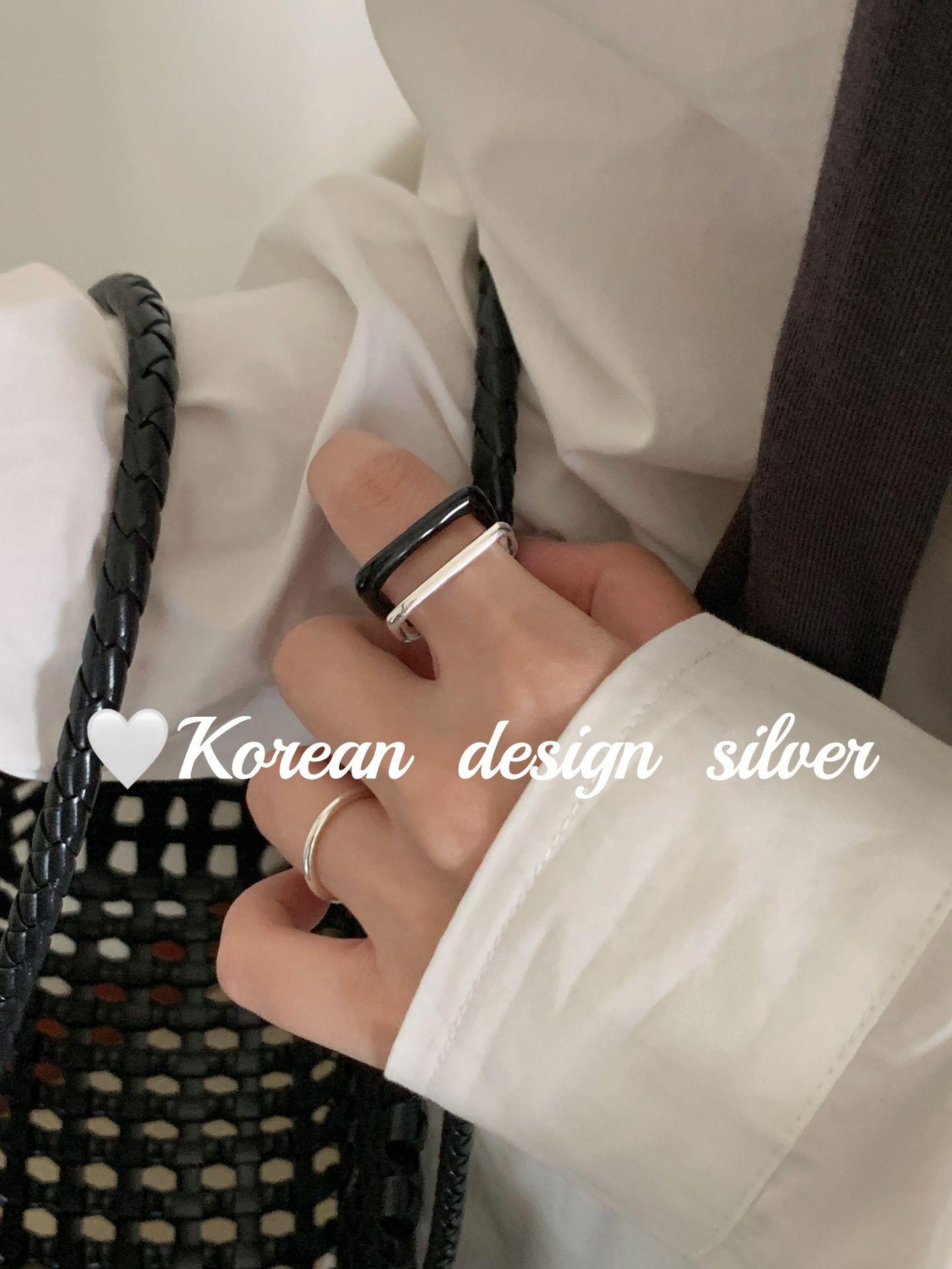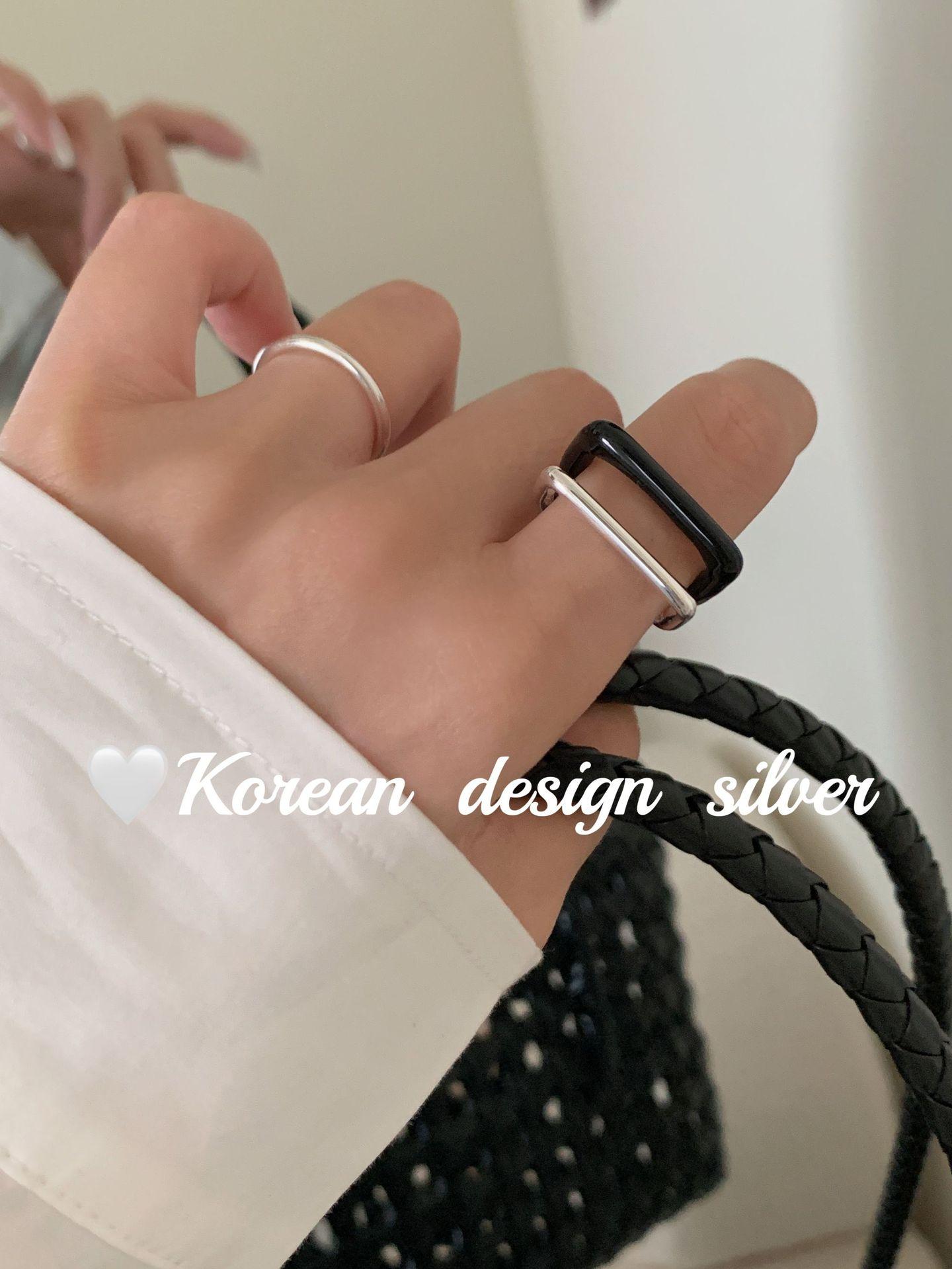 Anillo de Diseño Nicho estilo ins Japonés y Coreano Plata Esterlina S925 Doble Capa Anillo con Gota de Pegamento Negro Apilado con Abertura