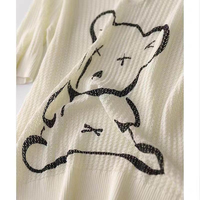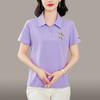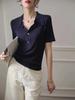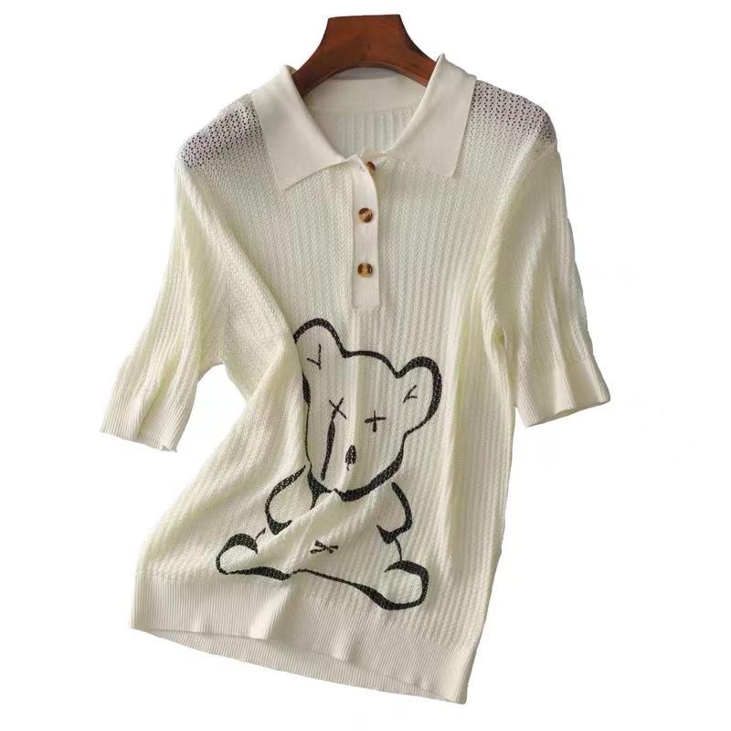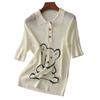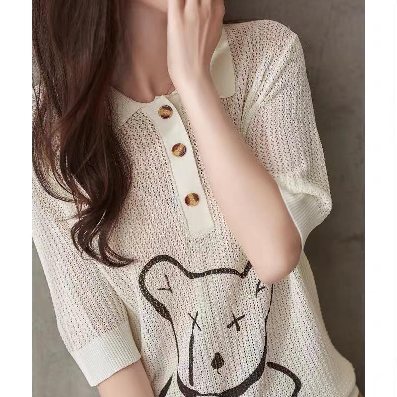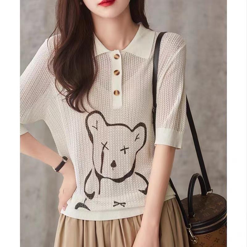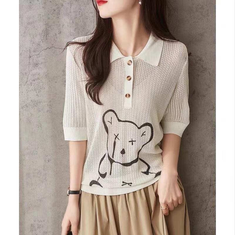 2025 Camiseta de Punto Calado con Solapa Estampada Top Verano Polo Cuello Reductor de Edad Combinación Total Ajustada Manga Corta Camiseta Básica