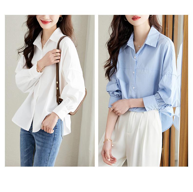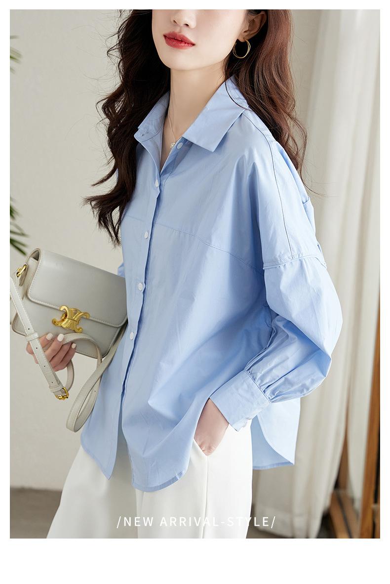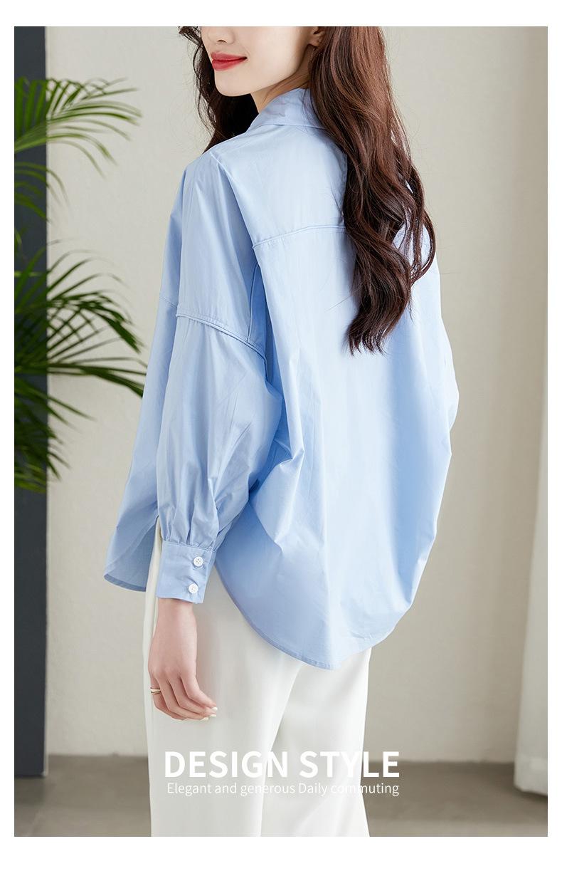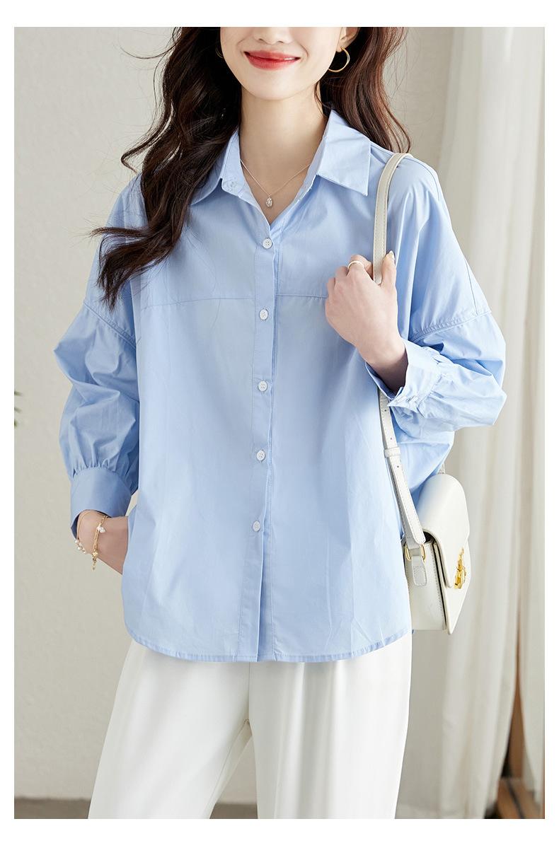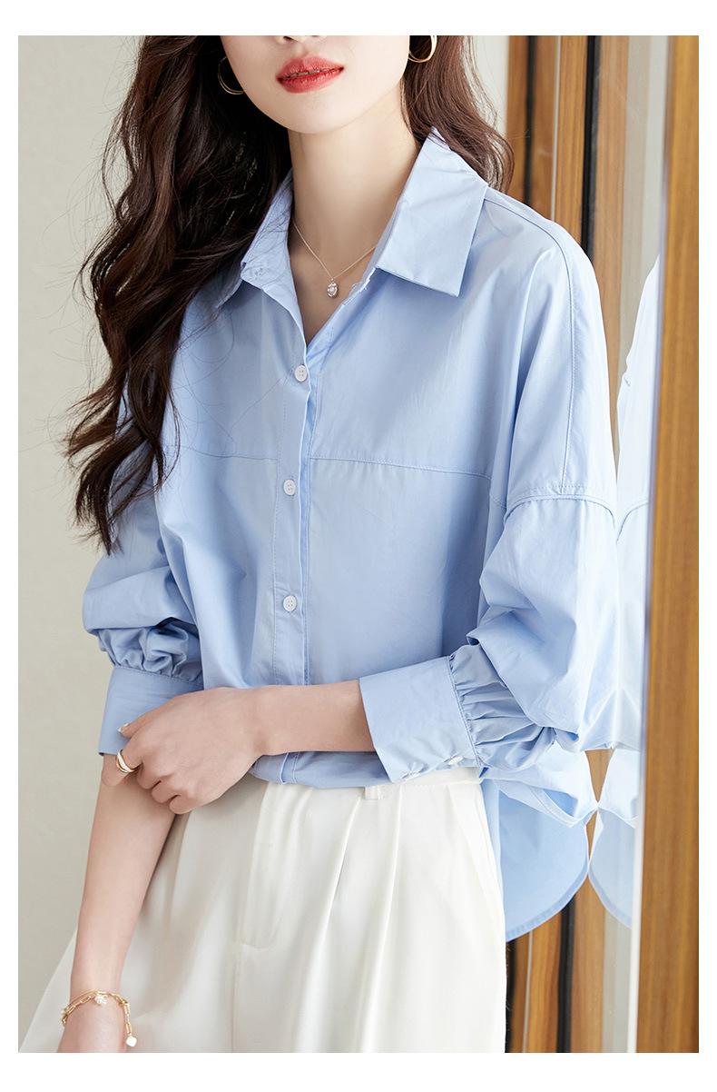 [Personalizado] Camisa de Diseño de Manga Farol Azul para Mujer Manga Larga Holgada Casual Top Camisa Chic de Moda