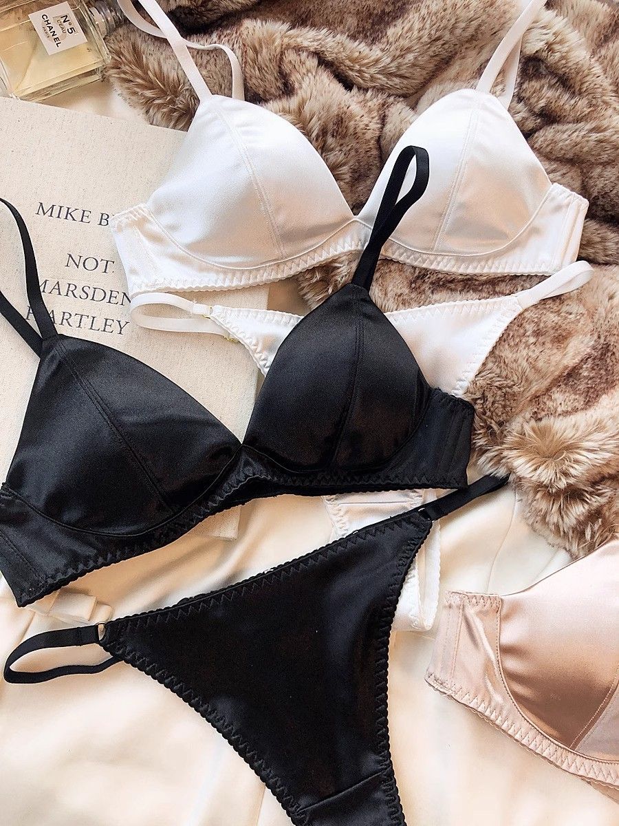 Estilo Francés Sexy Copa Triángulo Ropa Interior de Mujer Delgada Push-up Anticaída Sin Aros Cómodo Sin Marcas Satén Conjunto de Sostén