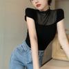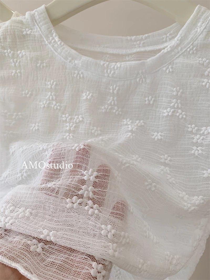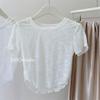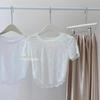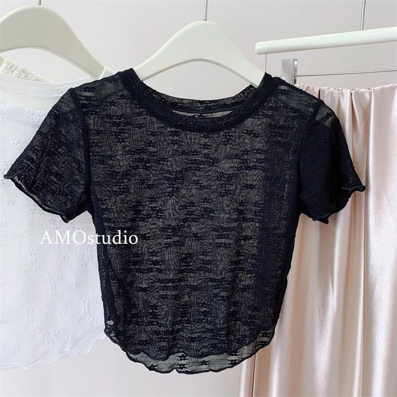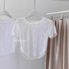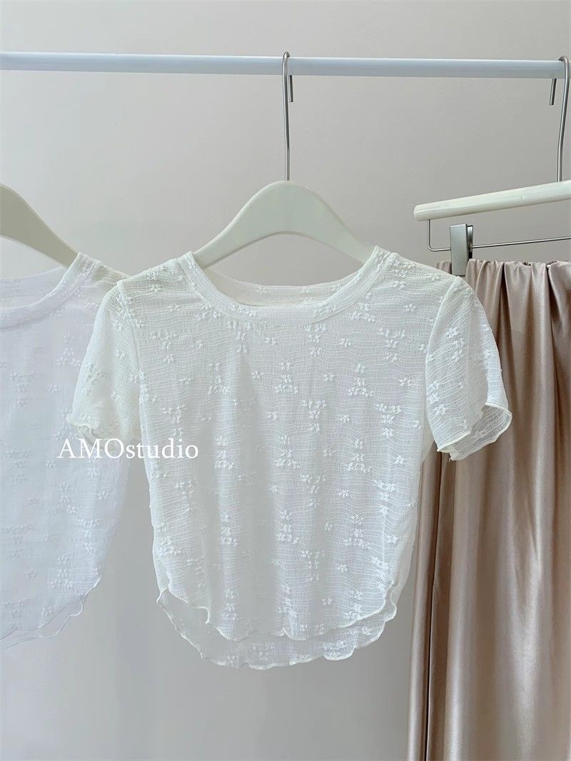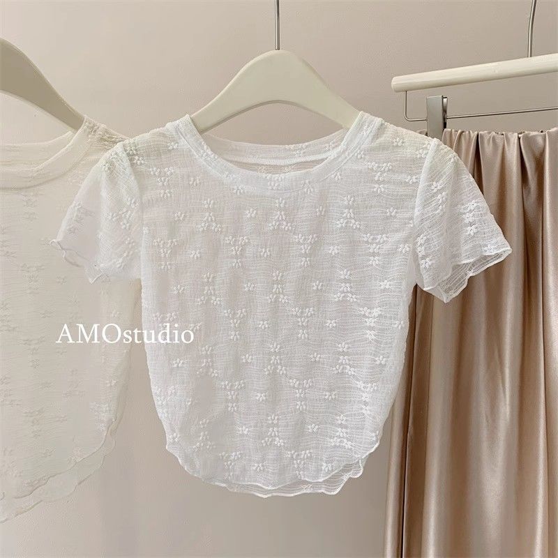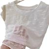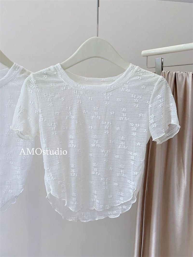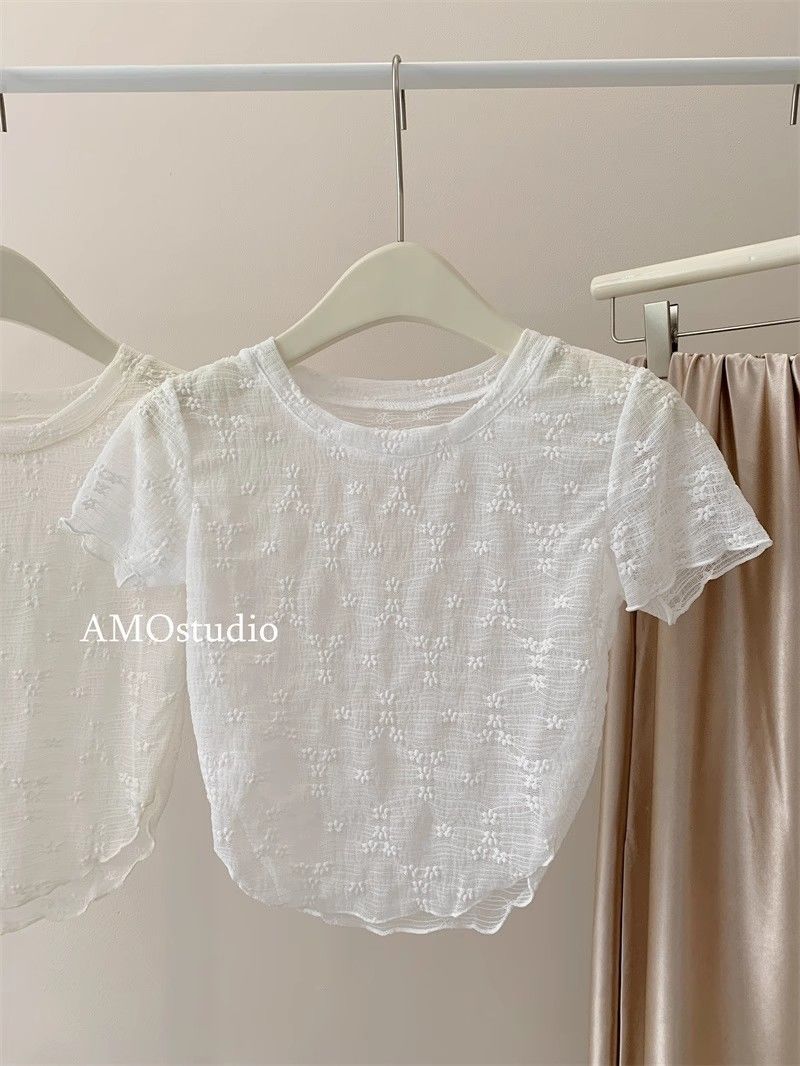 Camiseta Blanca de Encaje de Manga Corta para Mujer, Falda de Tirantes con Malla, Cuello Redondo, Top Corto con Bajo Curvo