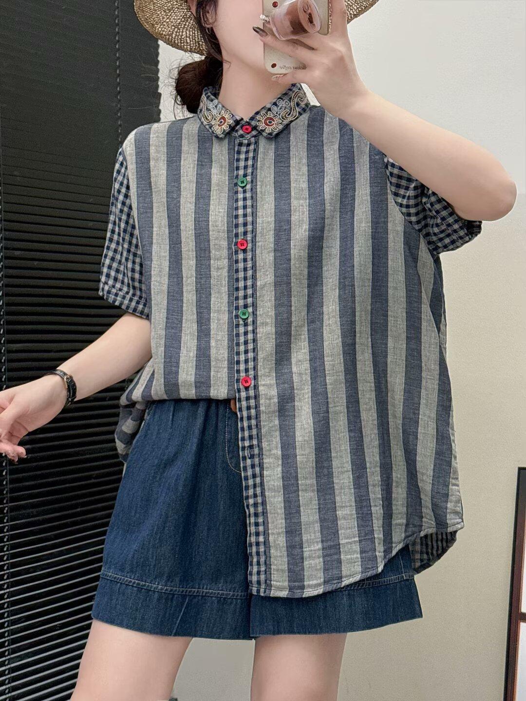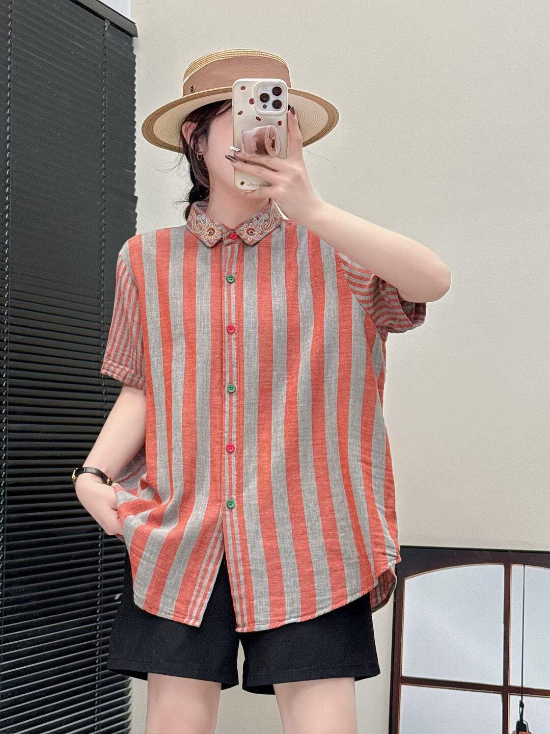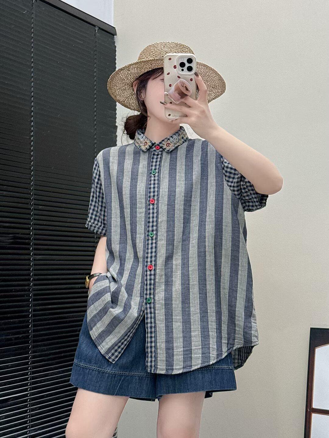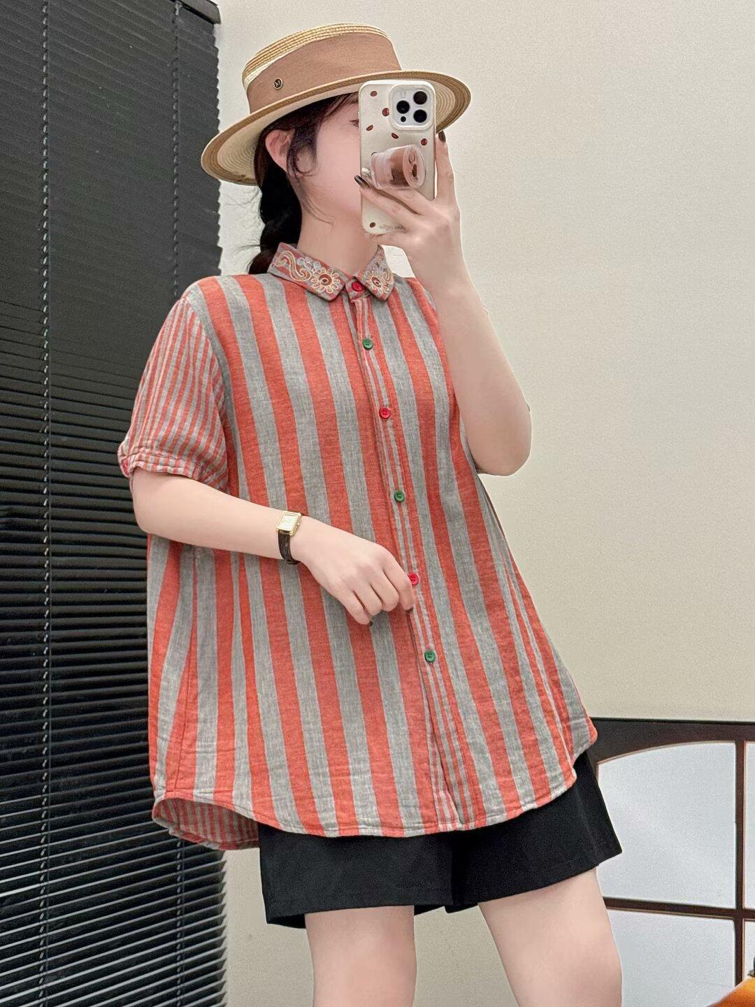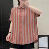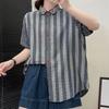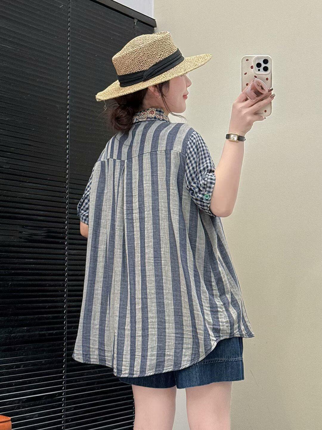 Camisa Casual Retro de Manga Corta de Gasa de Algodón de Doble Capa Nueva 2025 Verano Diseño a Rayas Suelto Camisa Slim para Mujer