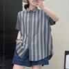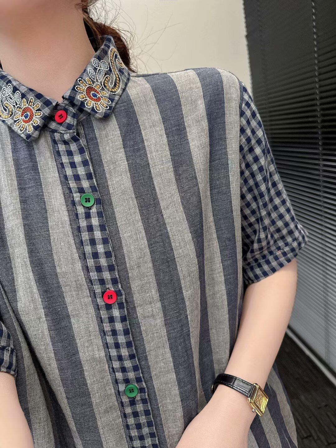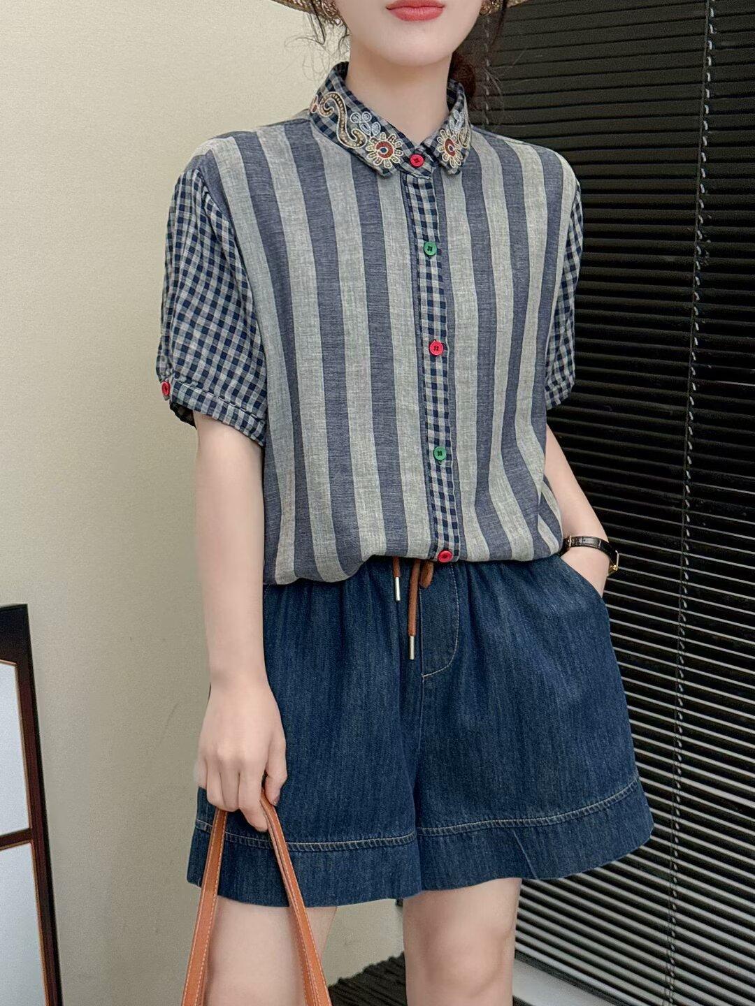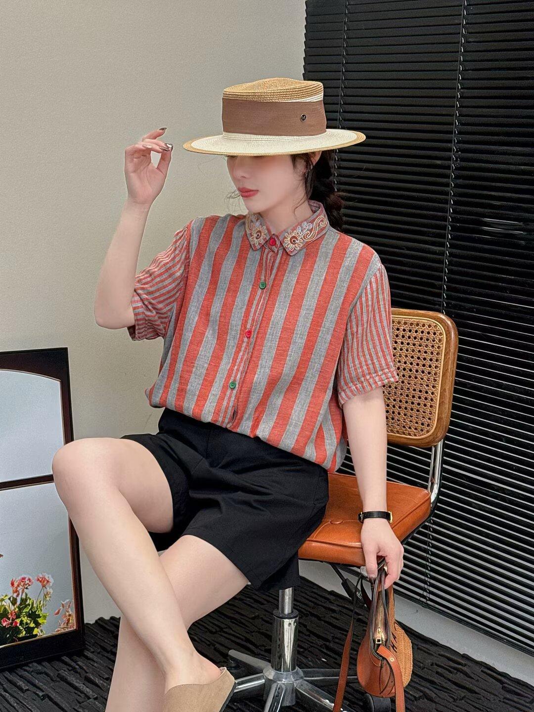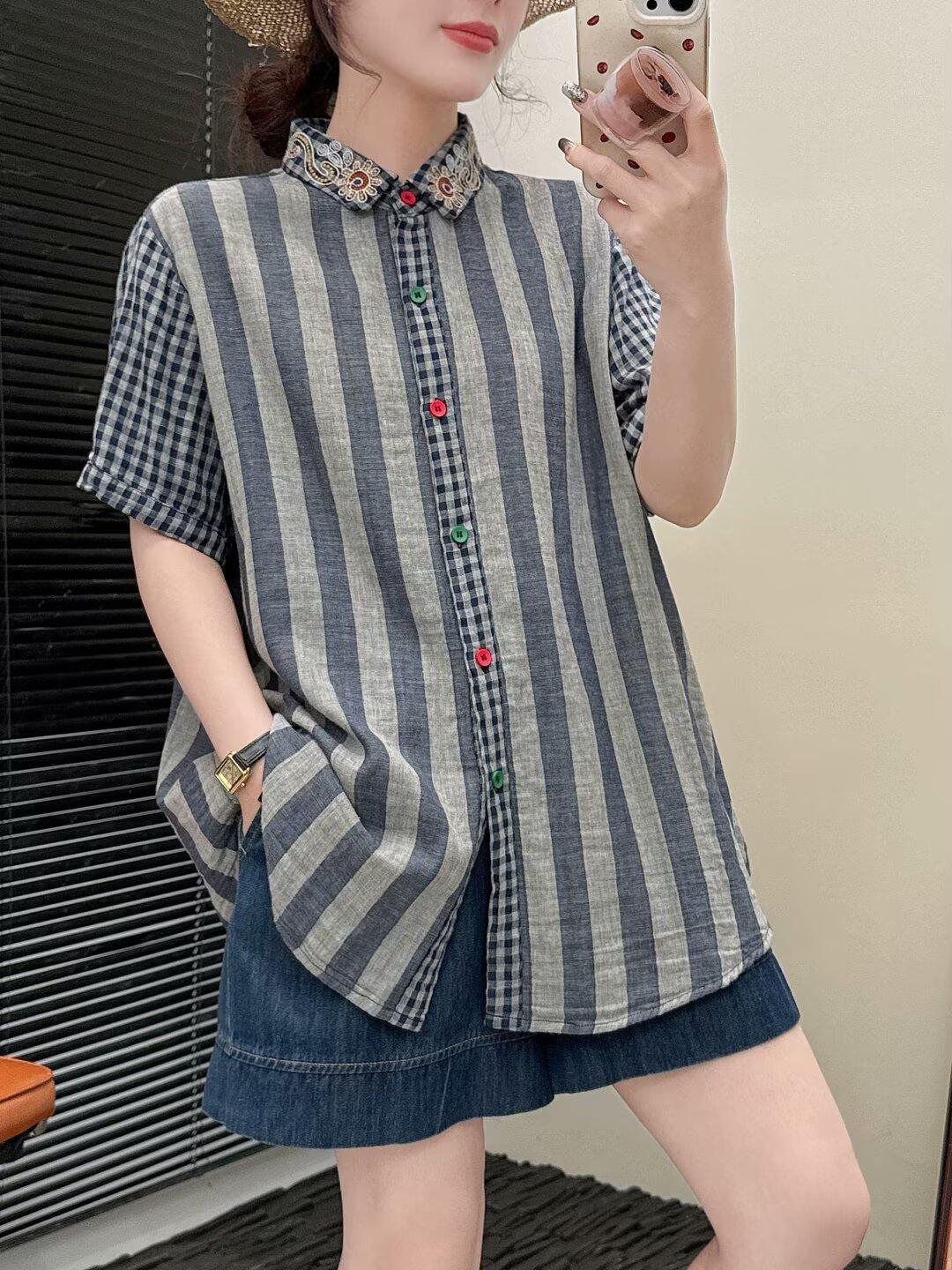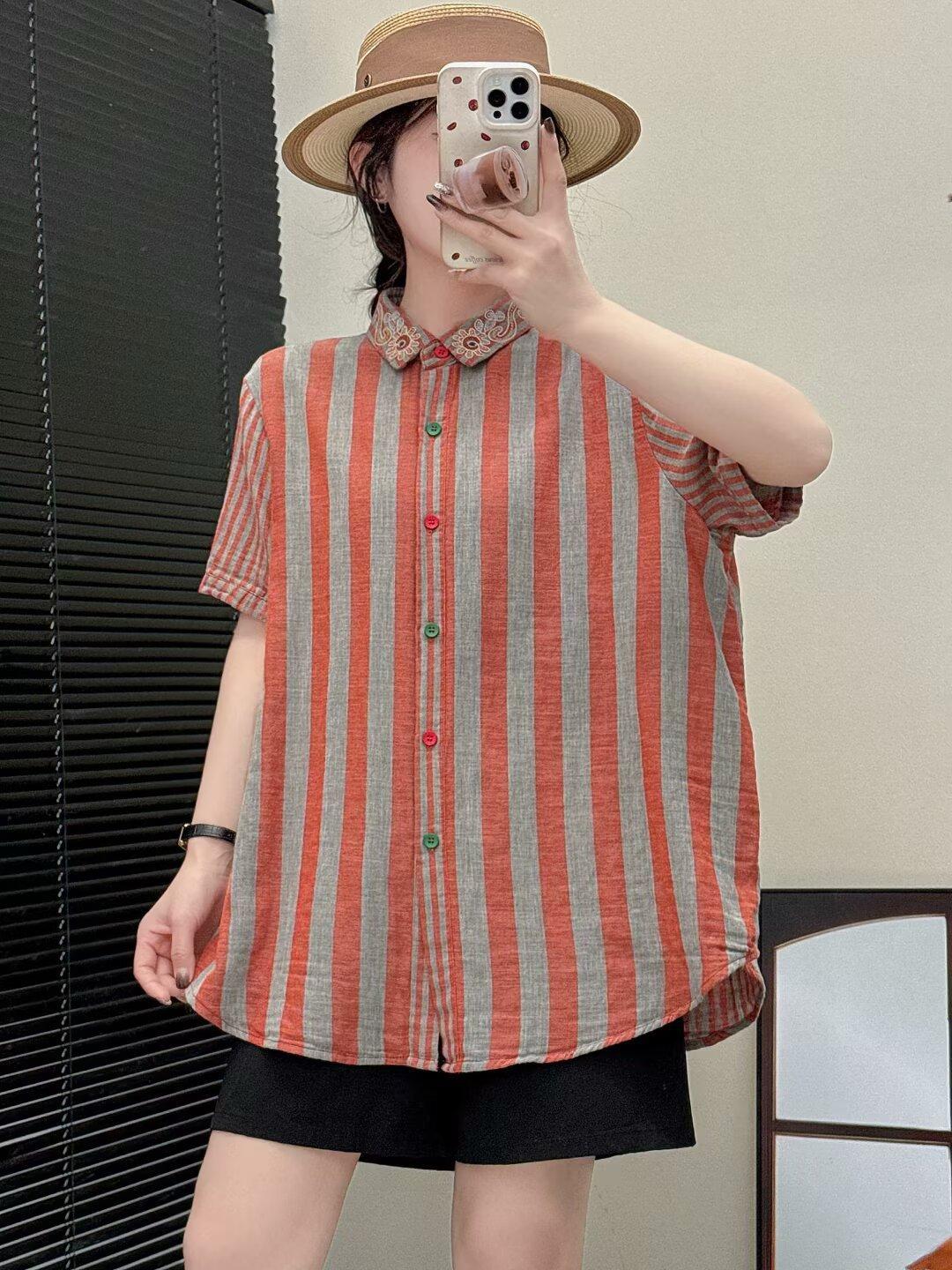 Camisa Casual Retro de Manga Corta de Gasa de Algodón de Doble Capa Nueva 2025 Verano Diseño a Rayas Suelto Camisa Slim para Mujer