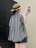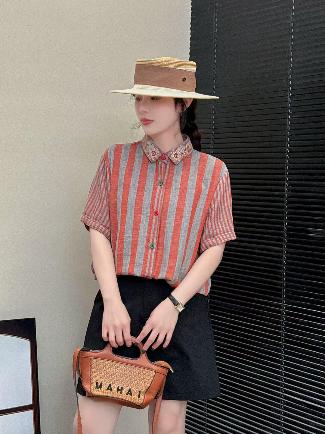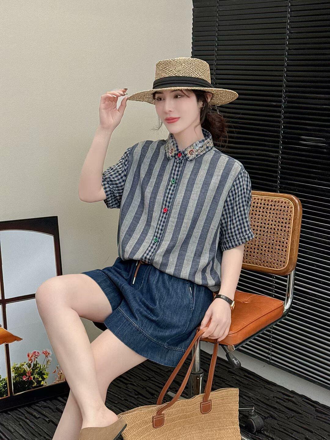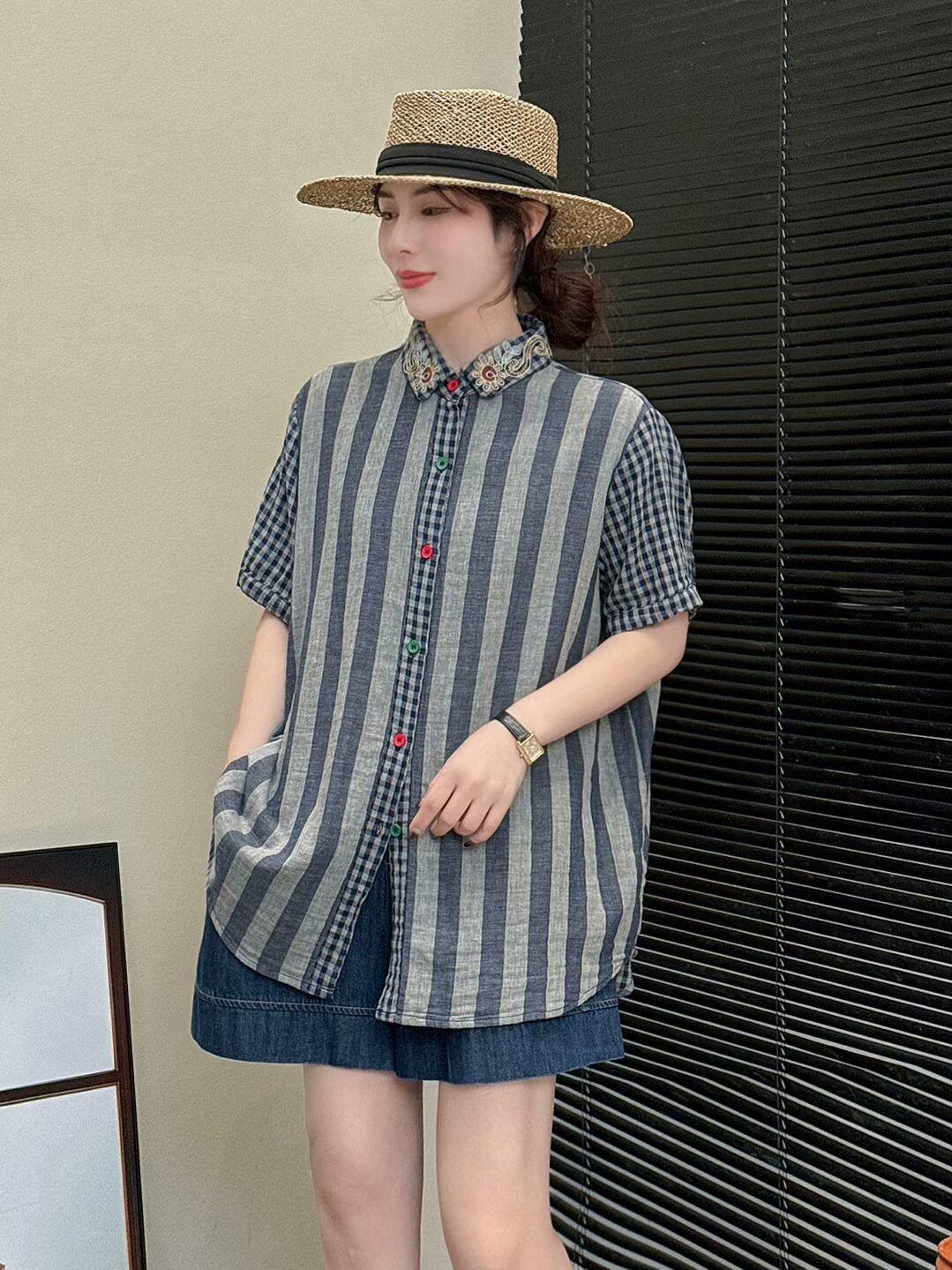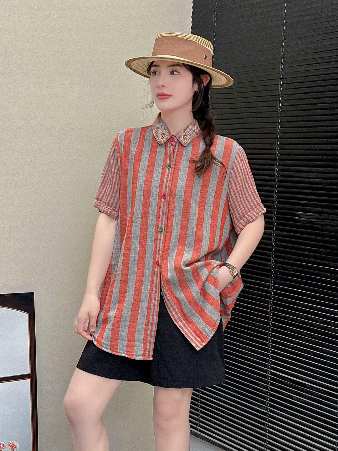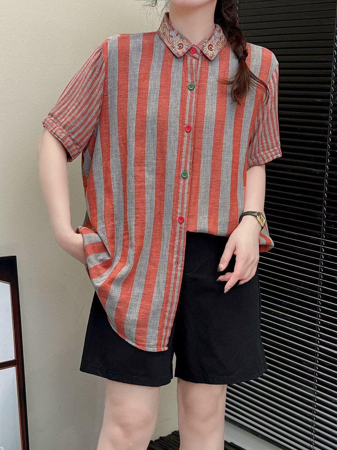 Camisa Casual Retro de Manga Corta de Gasa de Algodón de Doble Capa Nueva 2025 Verano Diseño a Rayas Suelto Camisa Slim para Mujer