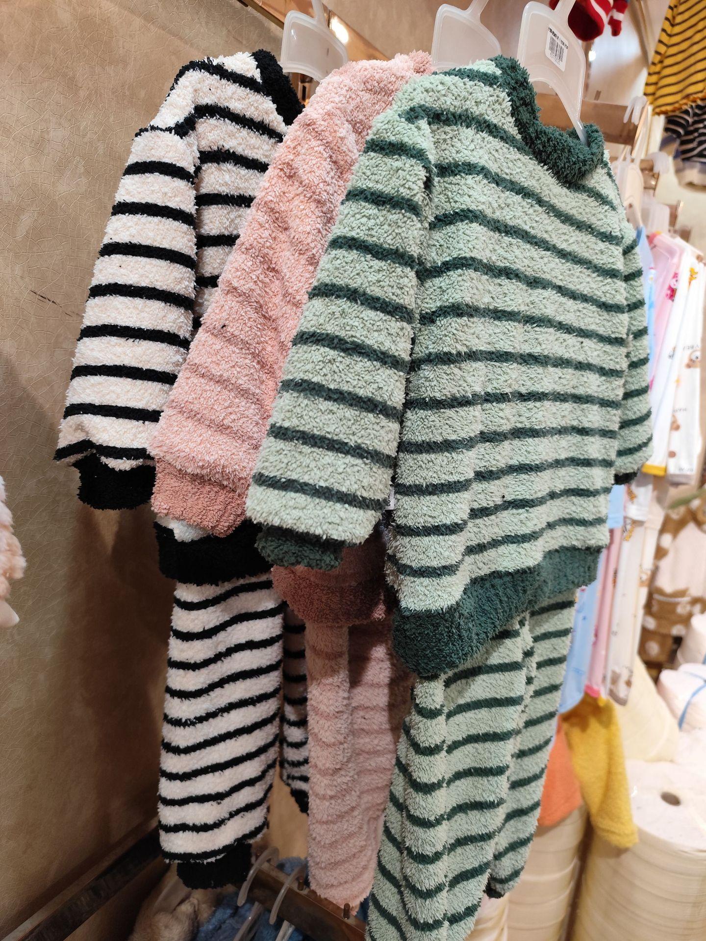 Pink striped warm velvet suit, Black and white striped warm velvet suit, Green striped warm velvet suit