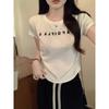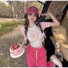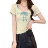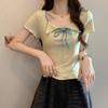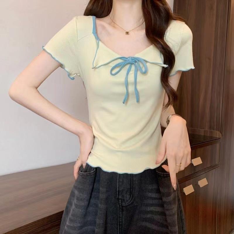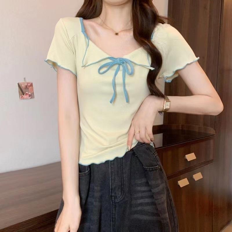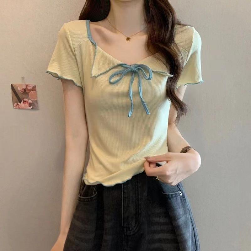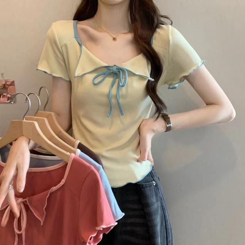 Playera de Manga Corta con Cuello Cuadrado y Contraste de Color Dulce y Picante para Mujer, Diseño de Nicho, Verano, Corte Ajustado Corto, Top de Contraste de Color