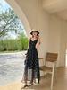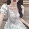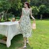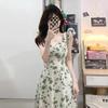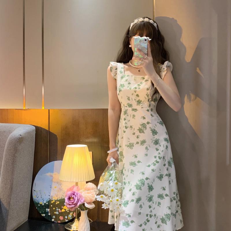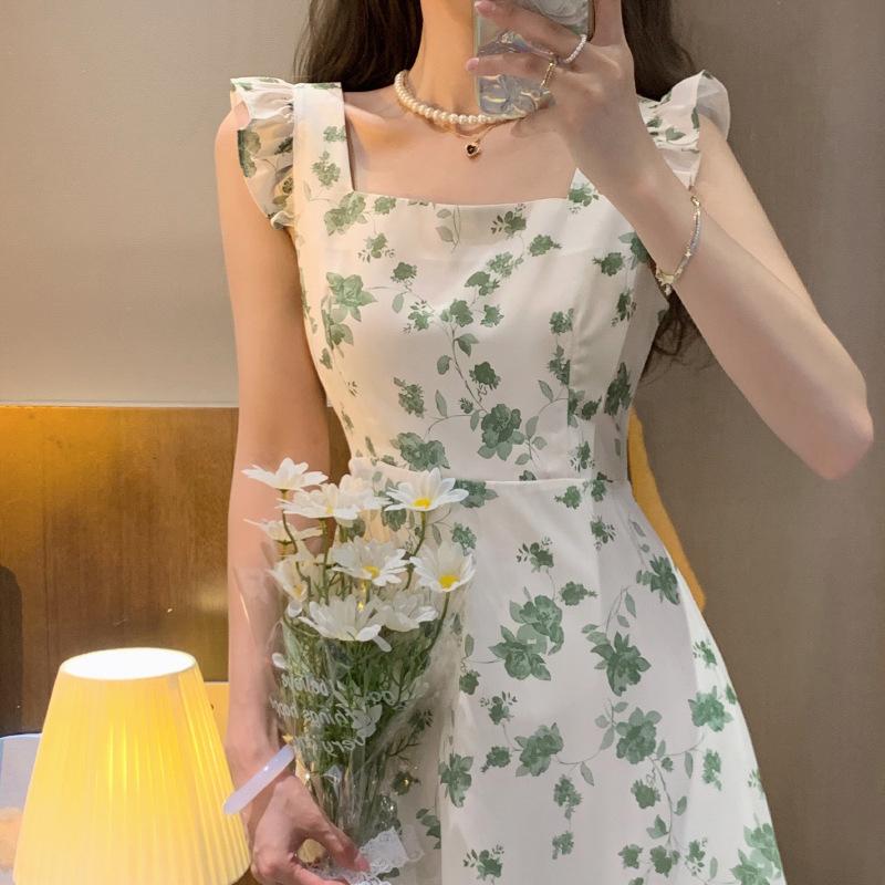 Gordo mm Descanso para el Té Francés Falda Floral Fresca Pequeña Mangas Volantes Adelgazante de Cintura Look Elegante Dulce Vestido Verde con Tirantes
