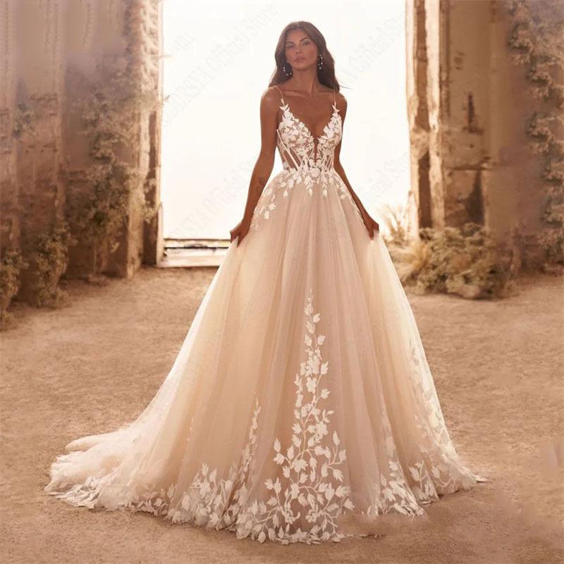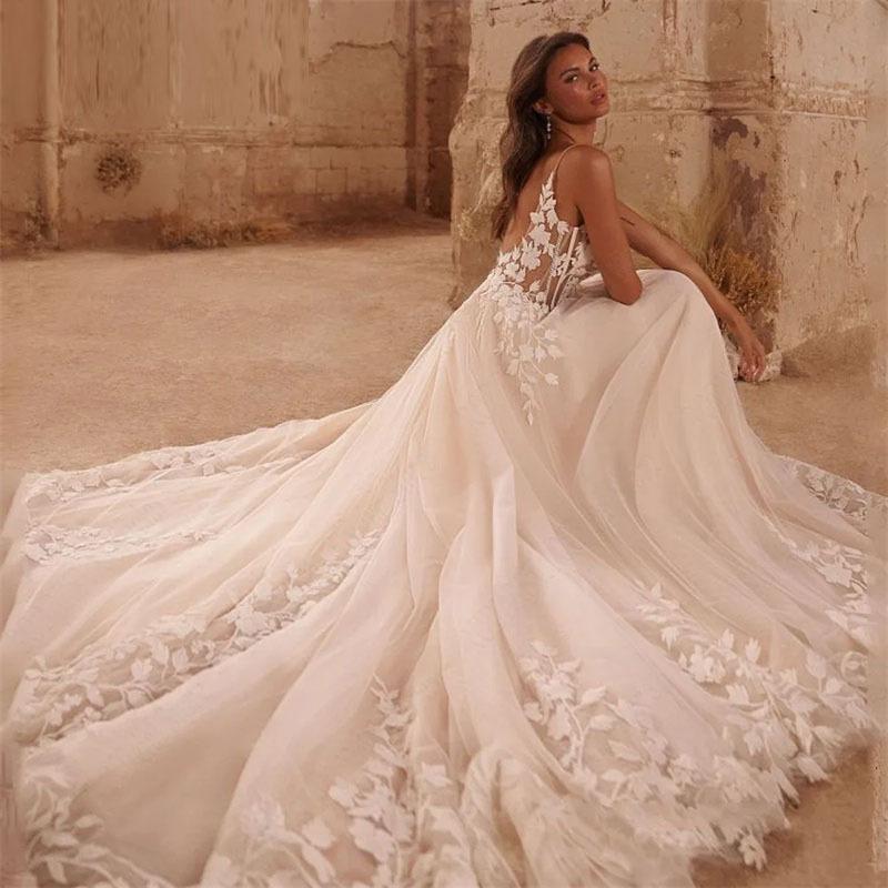 Vestido de Novia Principal Transfronterizo 2025 Verano Nuevo Estilo Sexy Escote en V Espalda Descubierta Ajustado Aplicación Encaje Vestido Elegante Banquete Mujeres