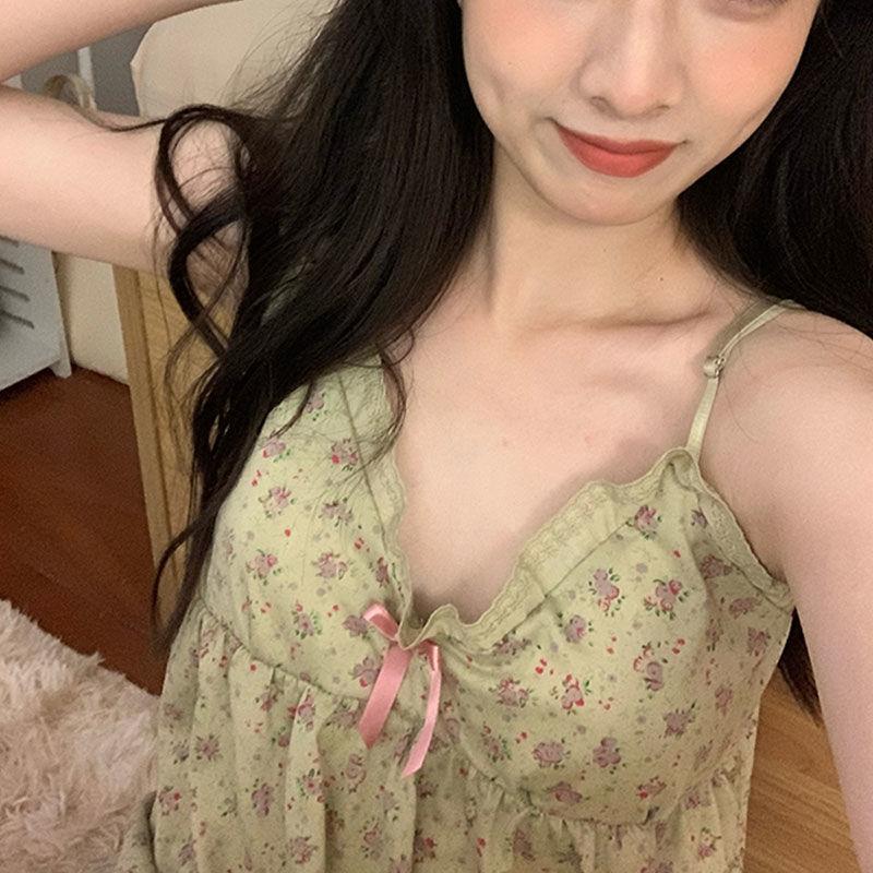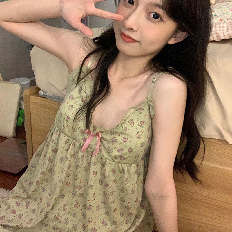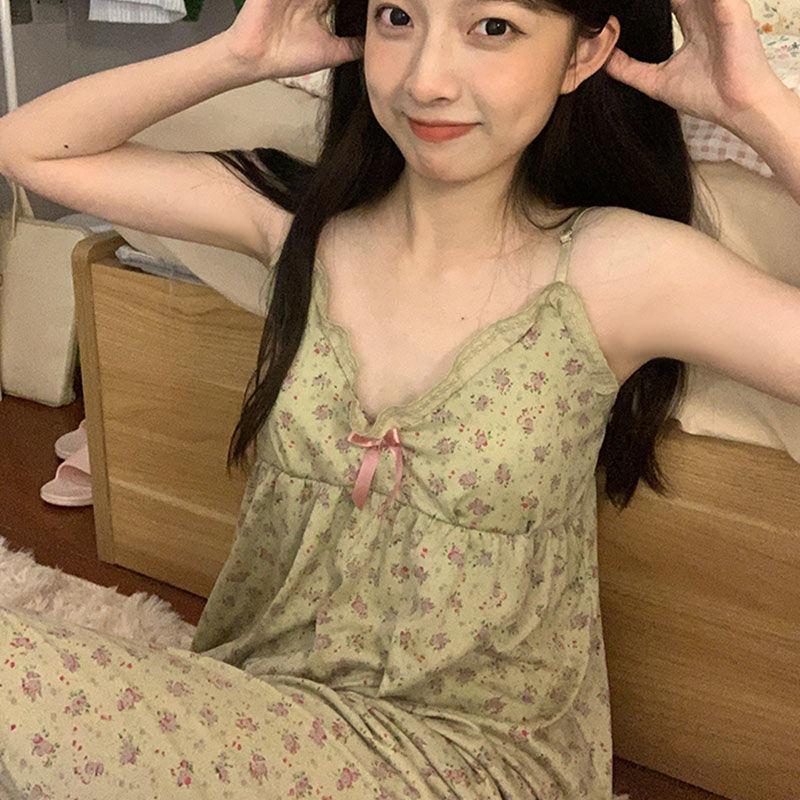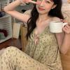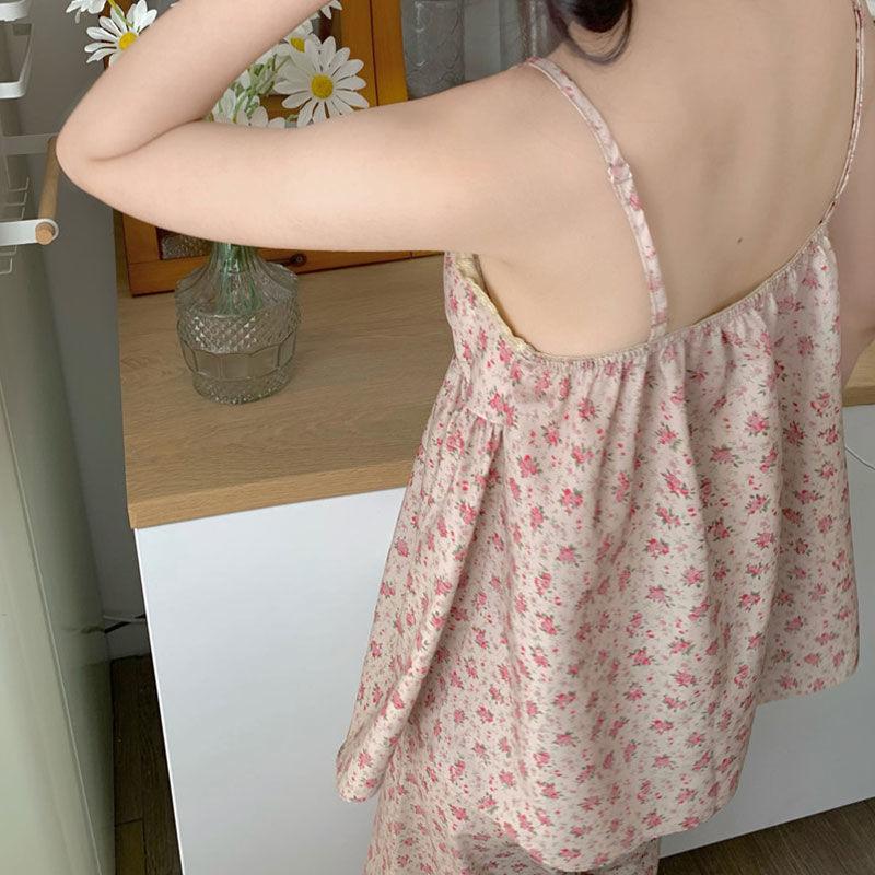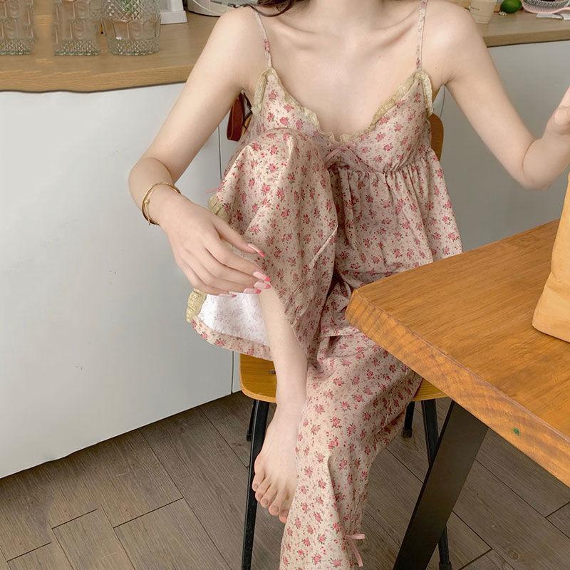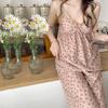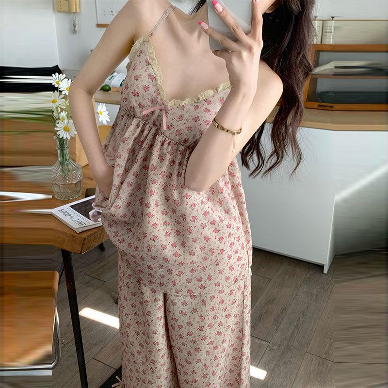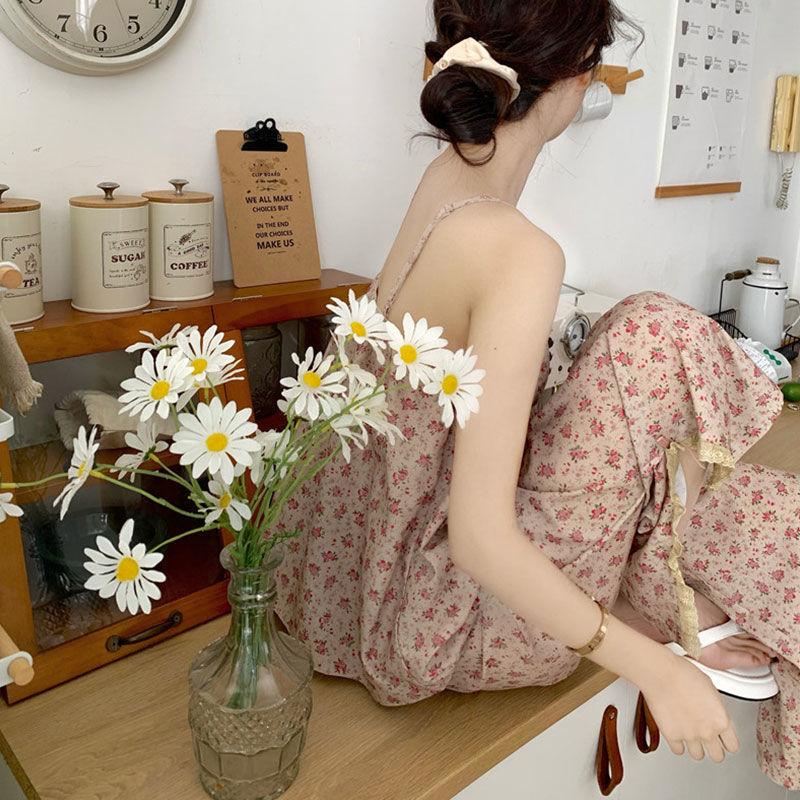 Pijama Japonés con Almohadillas para el Busto para Mujer, Estilo Pure Lust, Dulce Floral sin Mangas Tirantes Pantalones, Conjunto para el Hogar