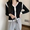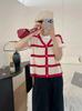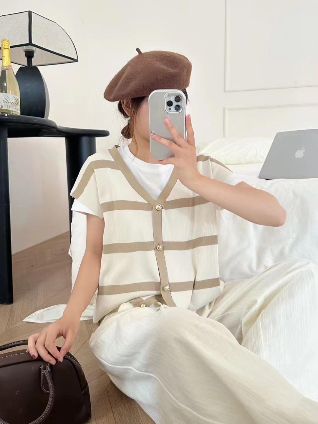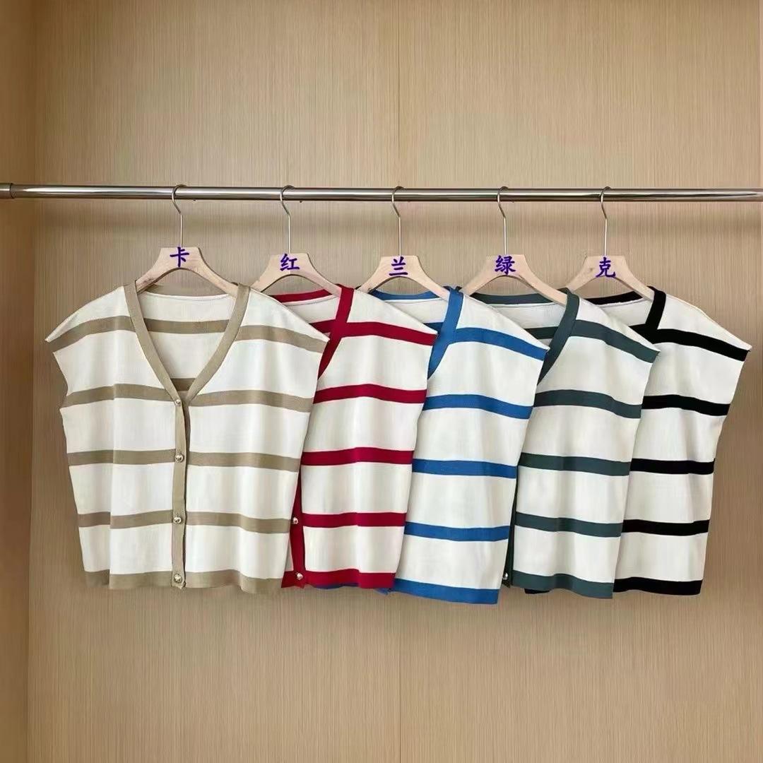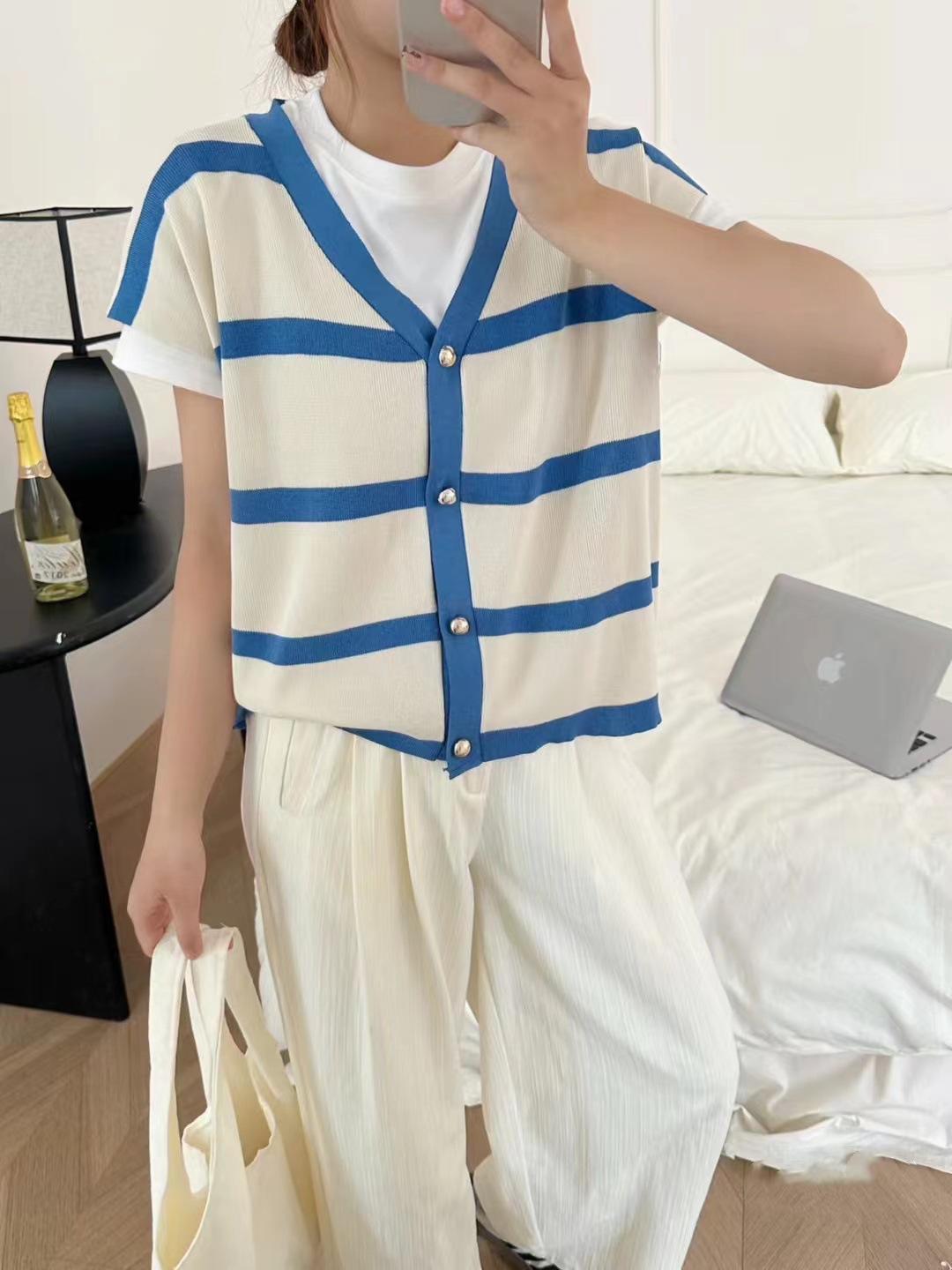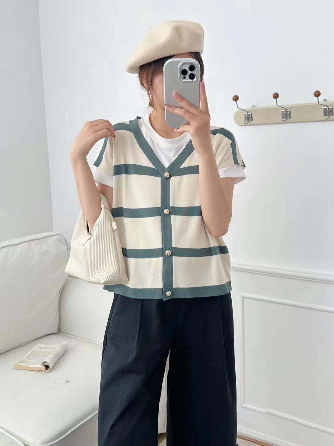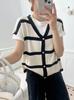 Cárdigan de punto de rayas con cuello en V estilo extranjero, suéter de manga corta para mujer, verano, nuevo diseño, nicho, top ajustado moderno