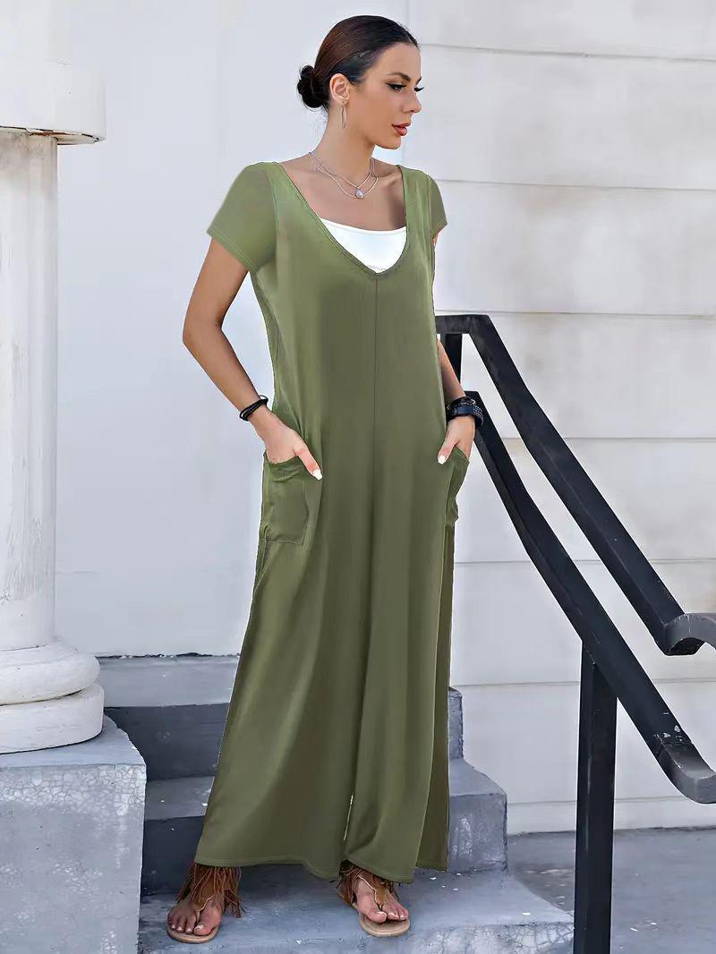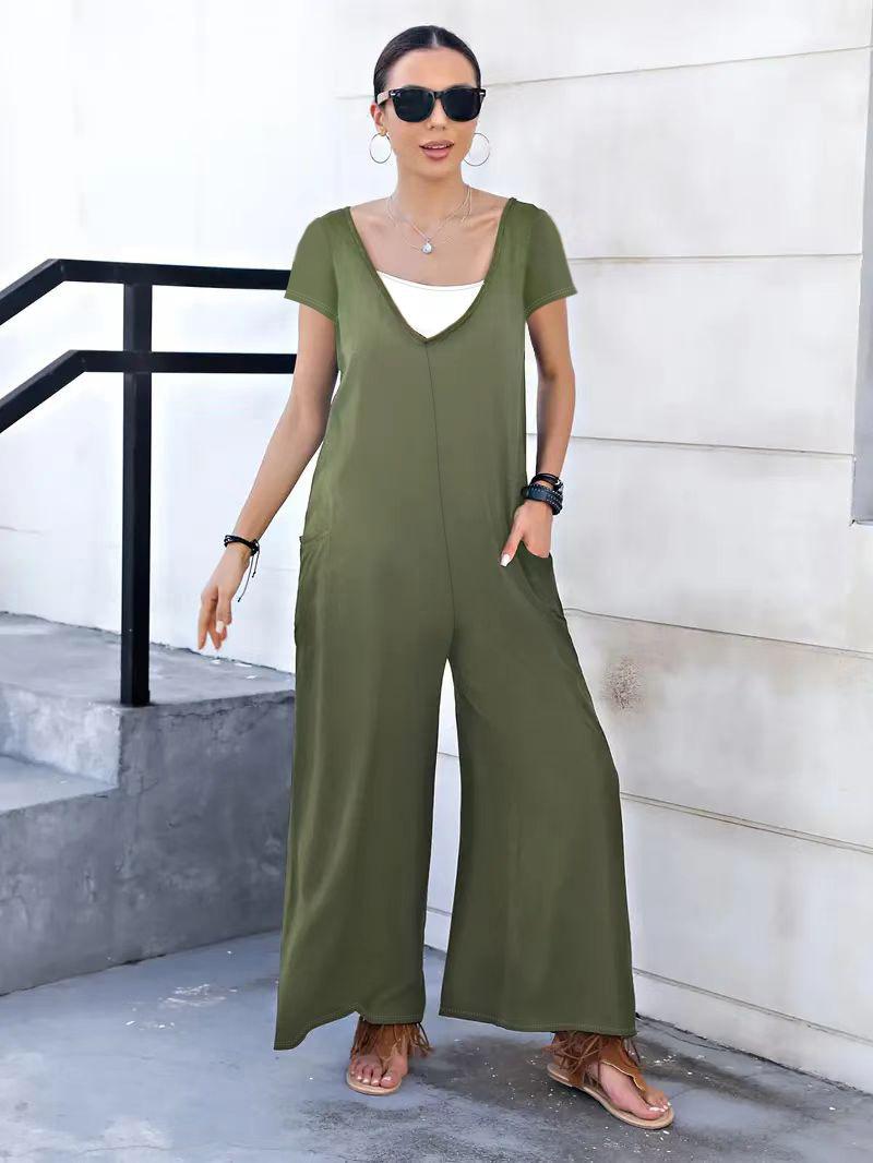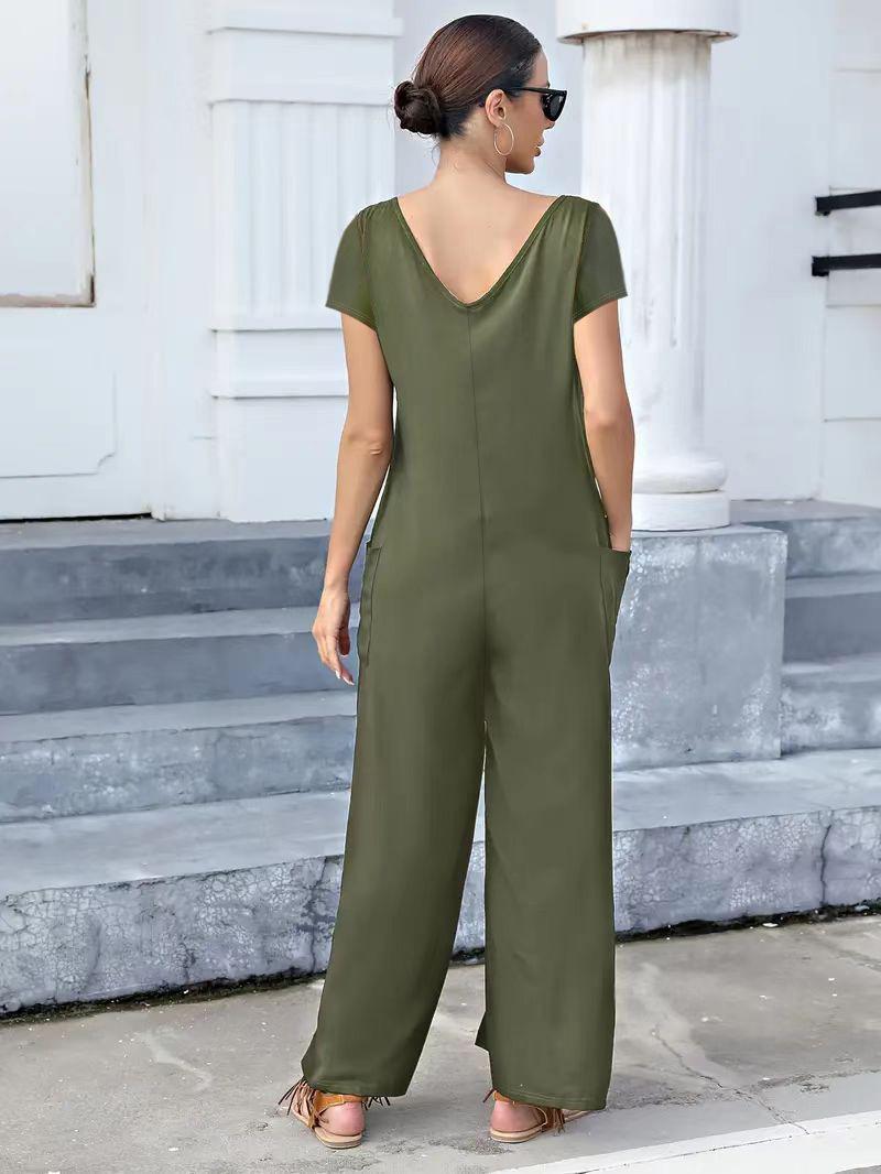 Creativo 2024 Primavera y Verano Nuevo Mono de Moda con Bolsillos de Parche de Color Sólido, Tirantes con Cuello en V, Pierna Ancha, Pantalón Recto