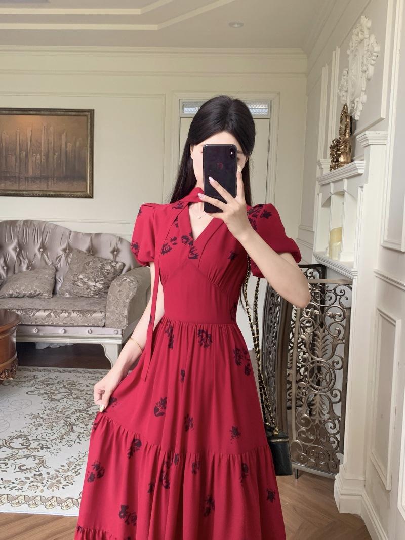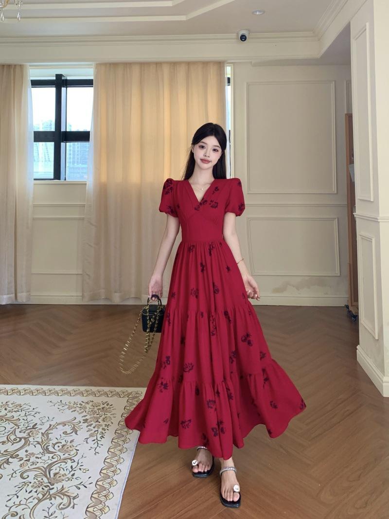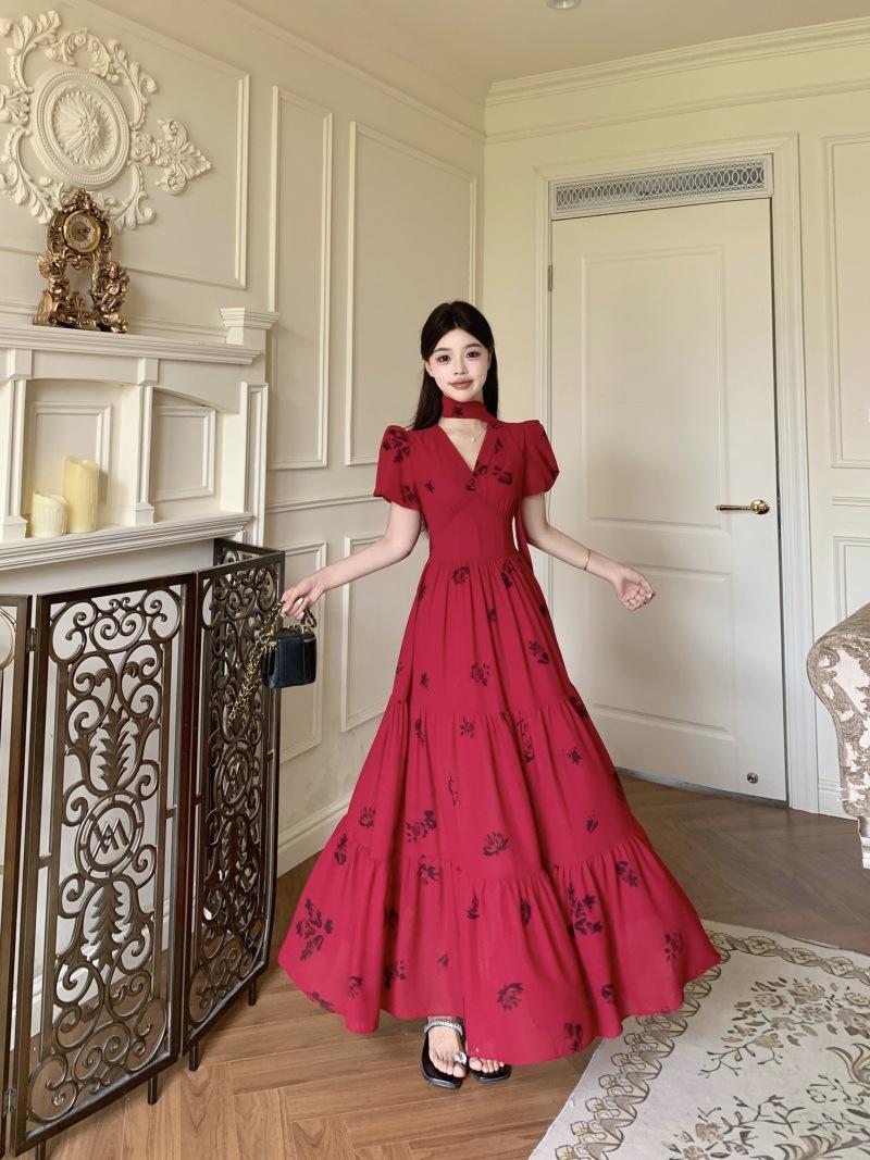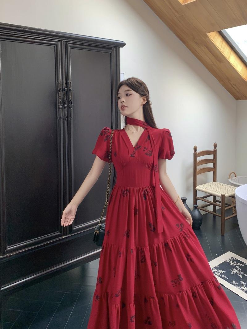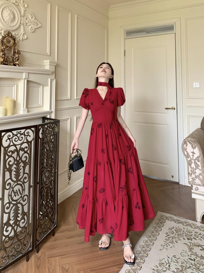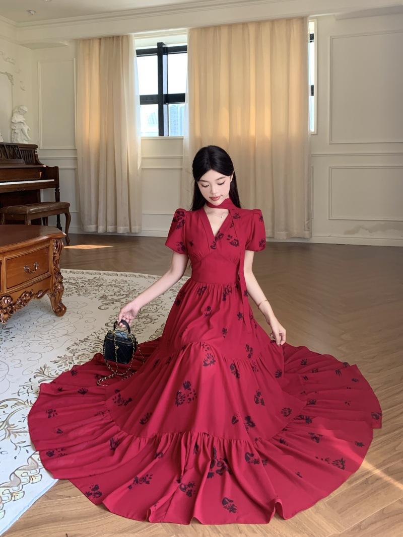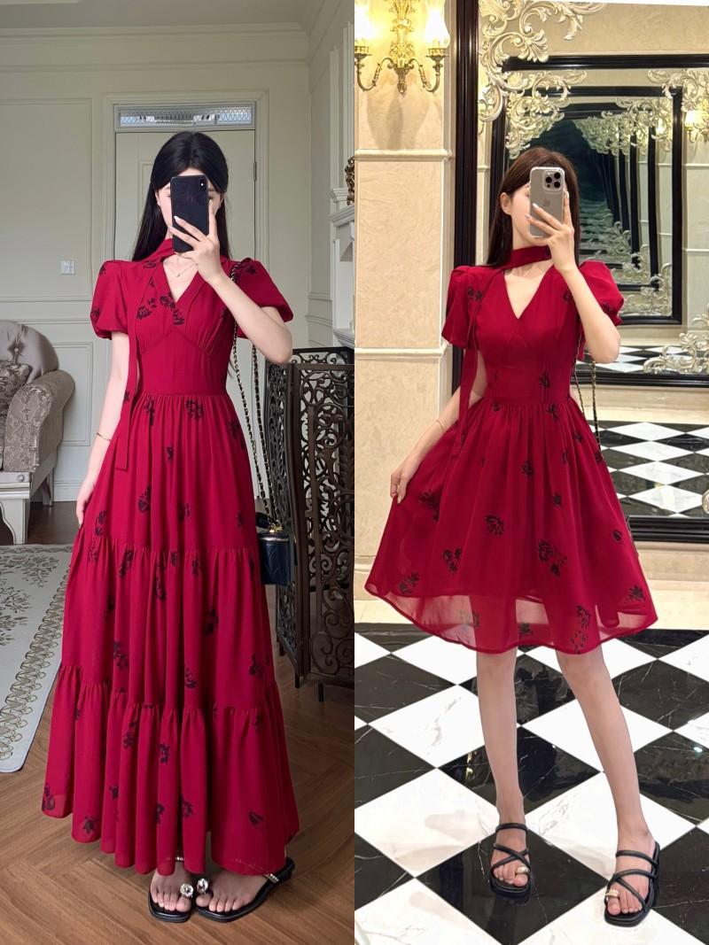 Vestido Retro Estilo Hepburn Francés Estampado Rojo Cuello en V Diseño Nuevo 2025 Look Adelgazante Falda Larga y Corta