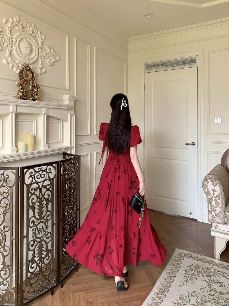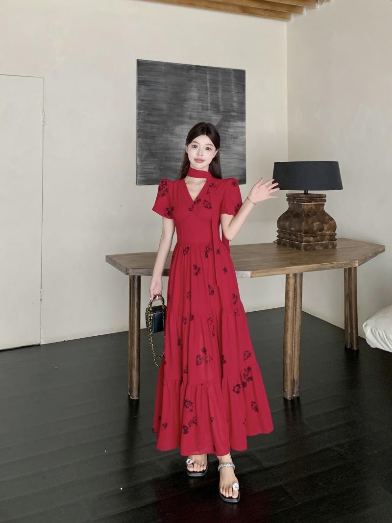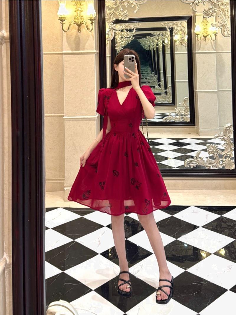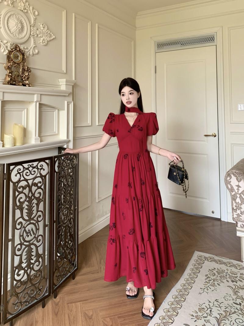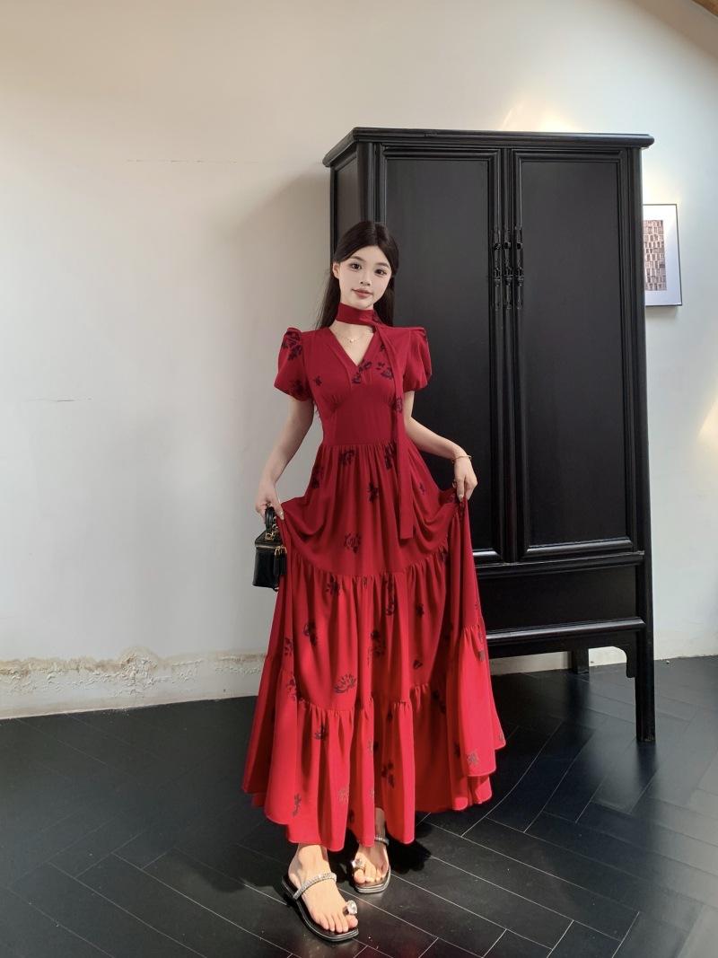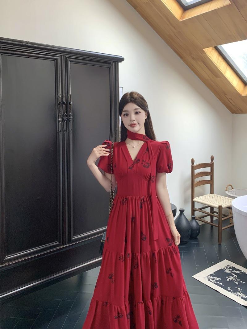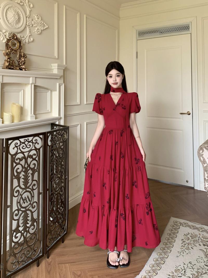 Vestido Retro Estilo Hepburn Francés Estampado Rojo Cuello en V Diseño Nuevo 2025 Look Adelgazante Falda Larga y Corta
