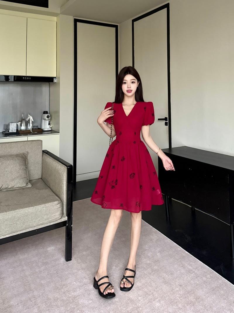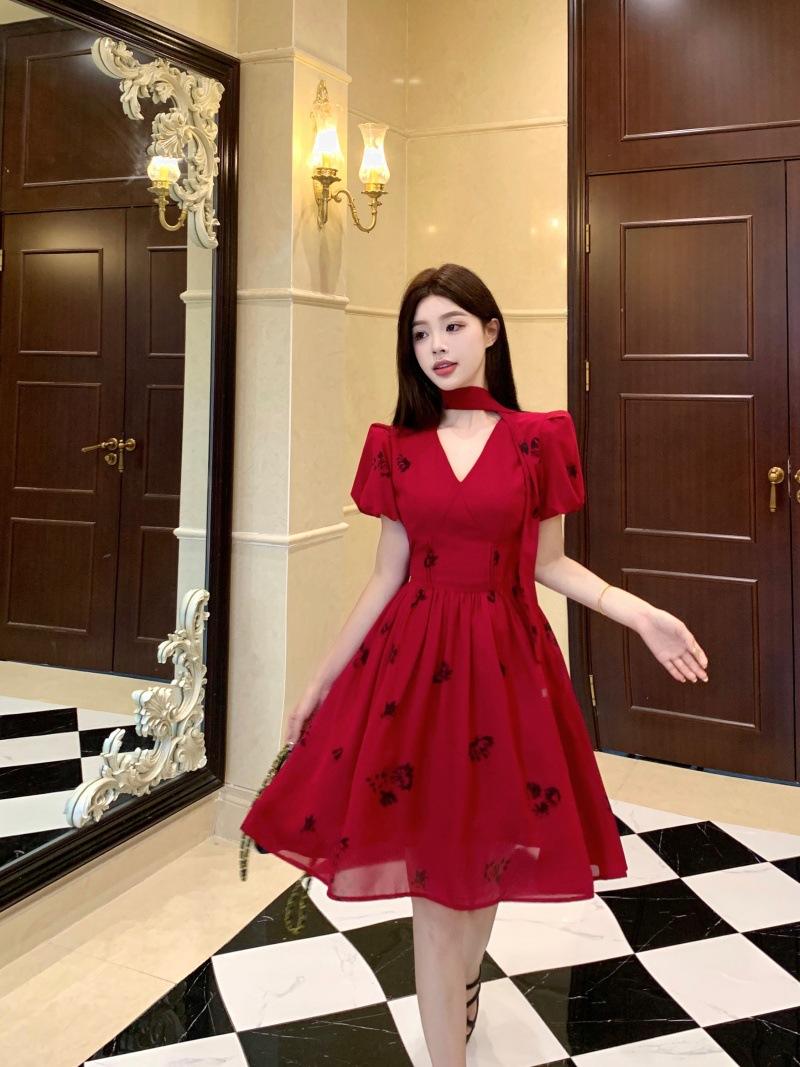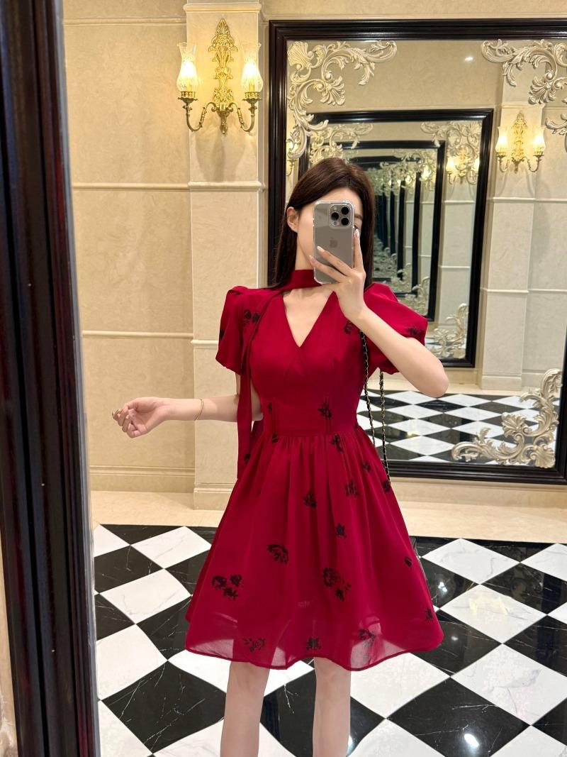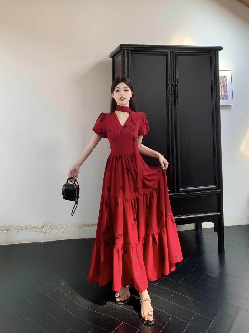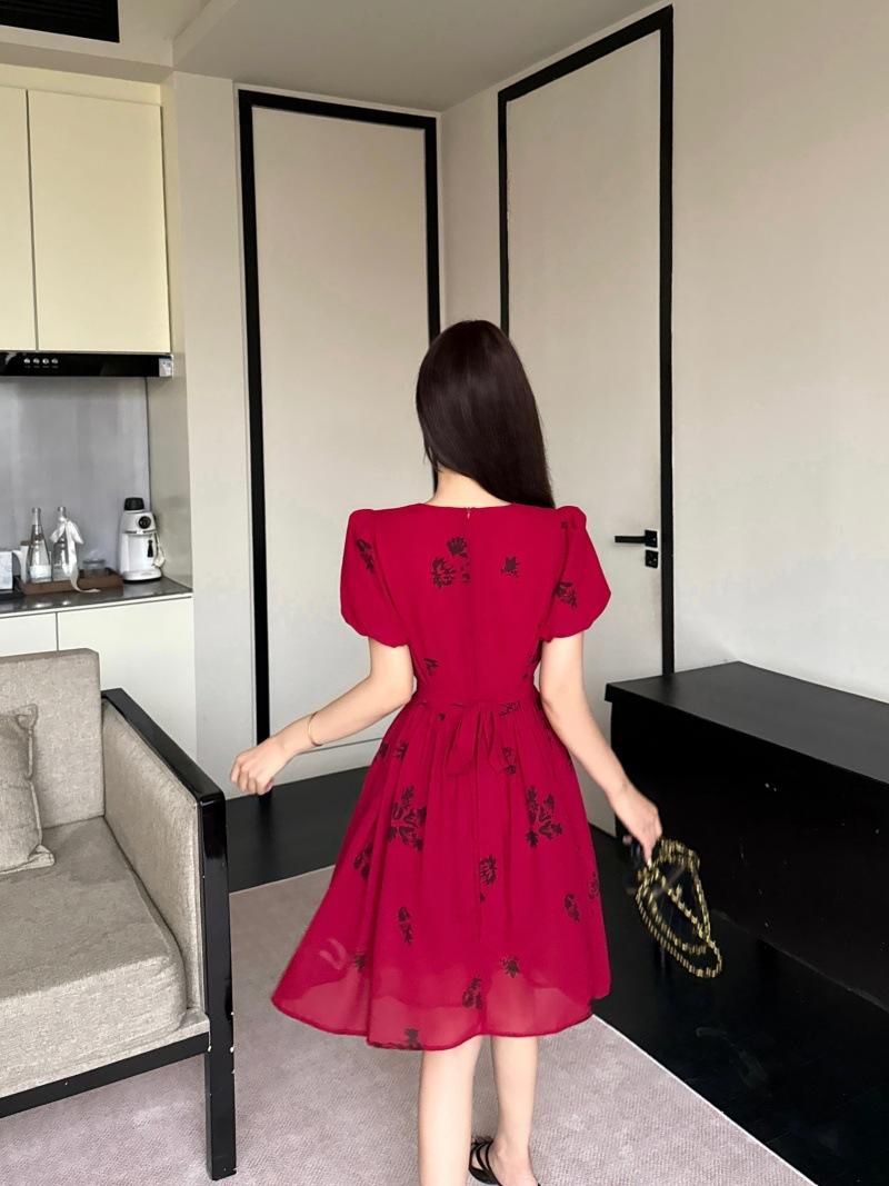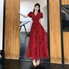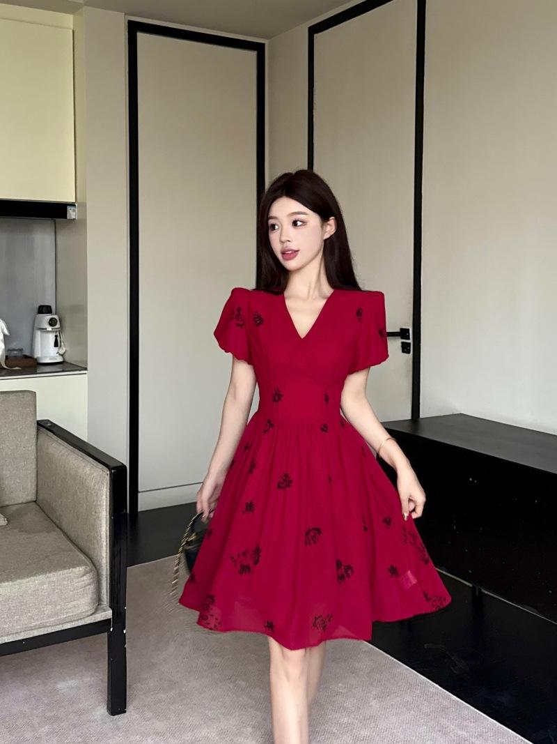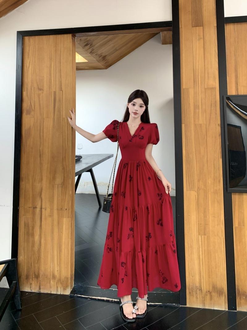 Vestido Retro Estilo Hepburn Francés Estampado Rojo Cuello en V Diseño Nuevo 2025 Look Adelgazante Falda Larga y Corta