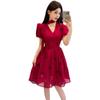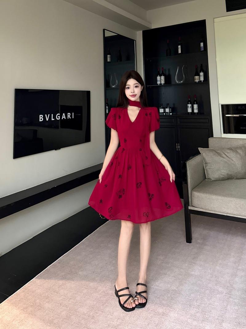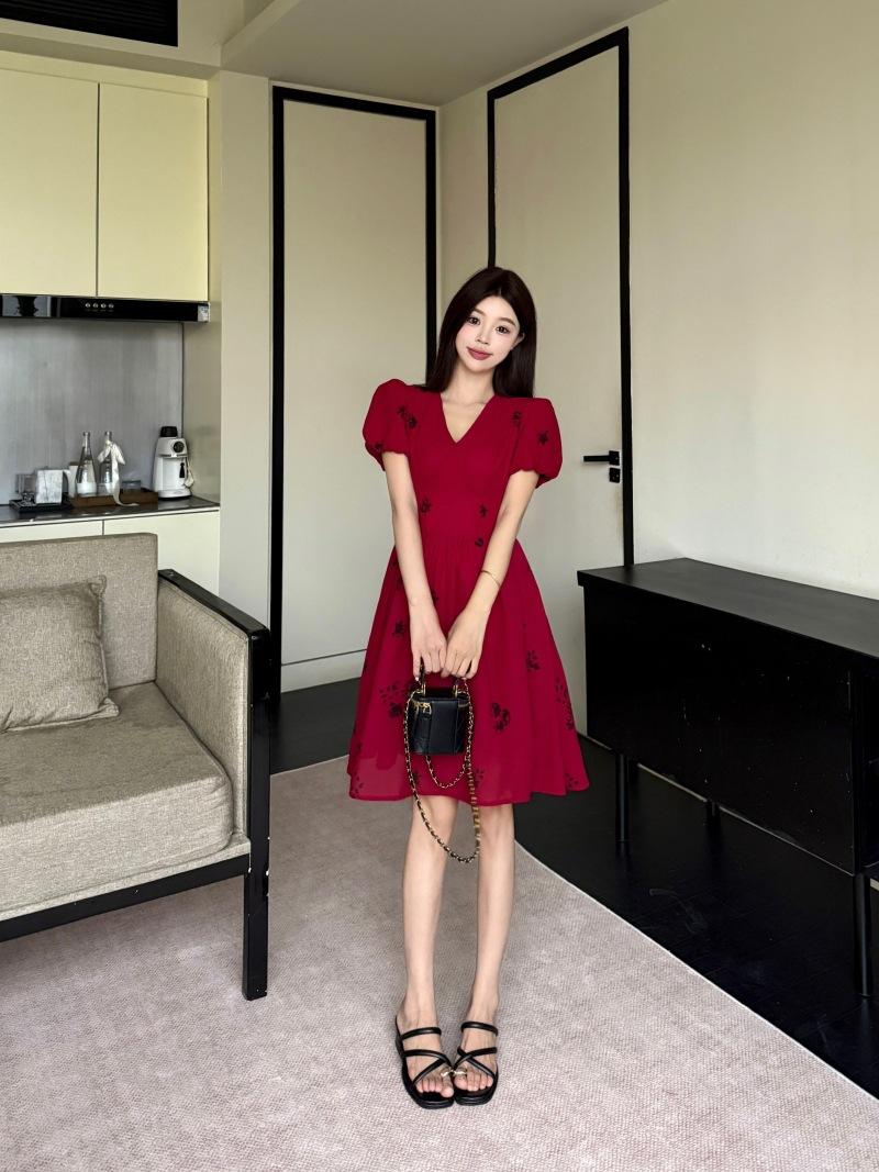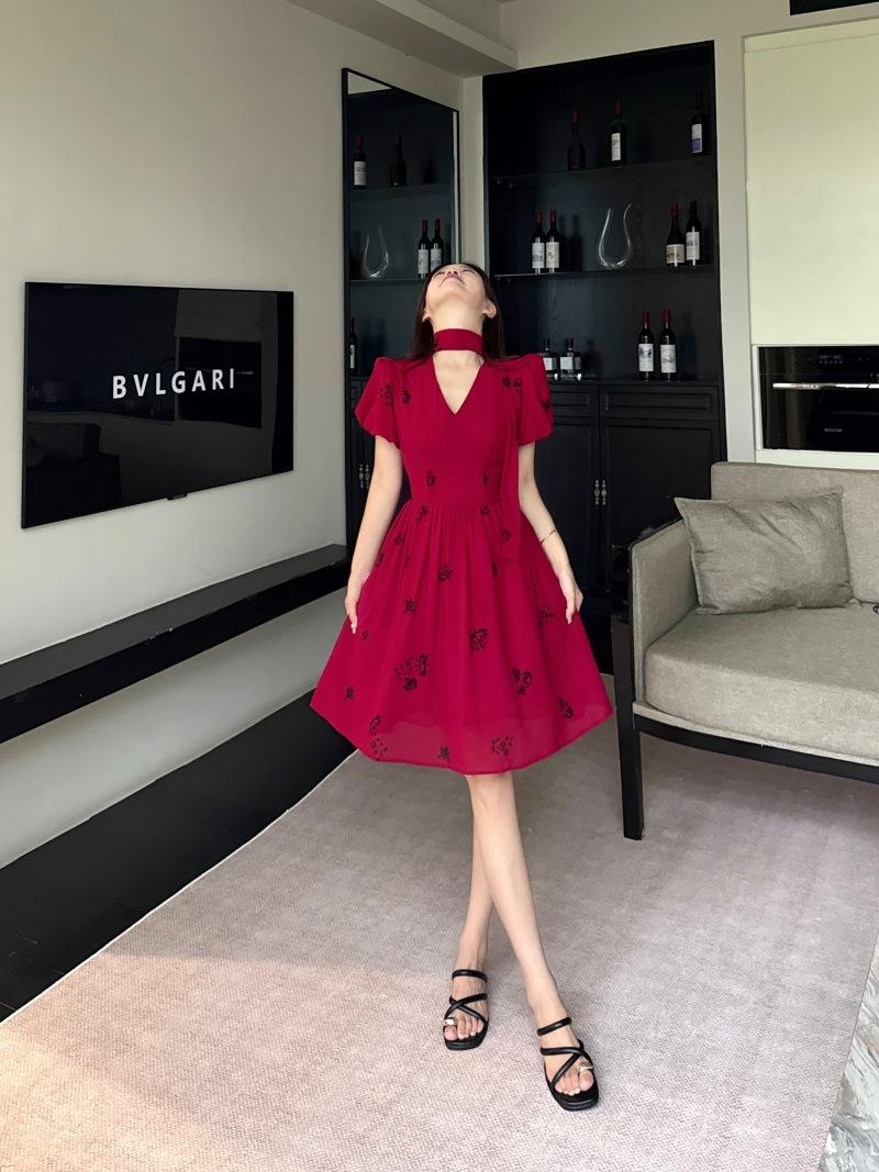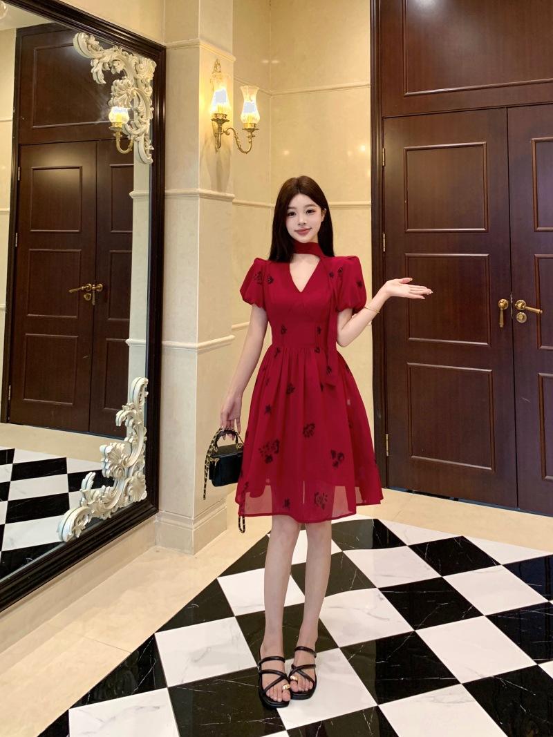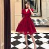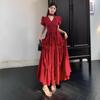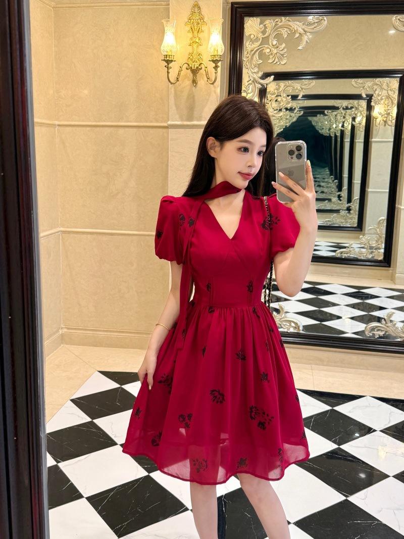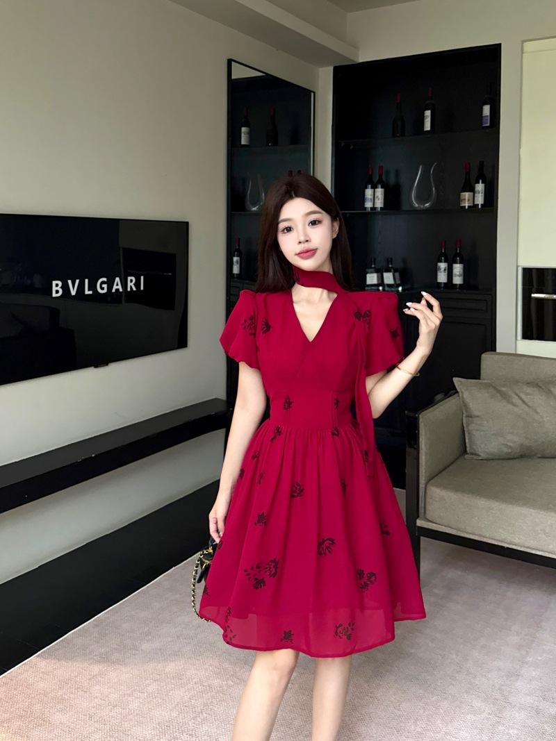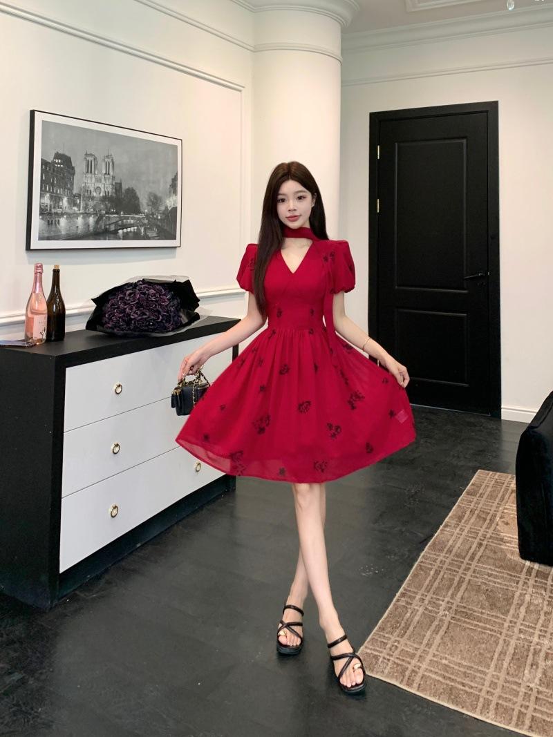 Vestido Retro Estilo Hepburn Francés Estampado Rojo Cuello en V Diseño Nuevo 2025 Look Adelgazante Falda Larga y Corta