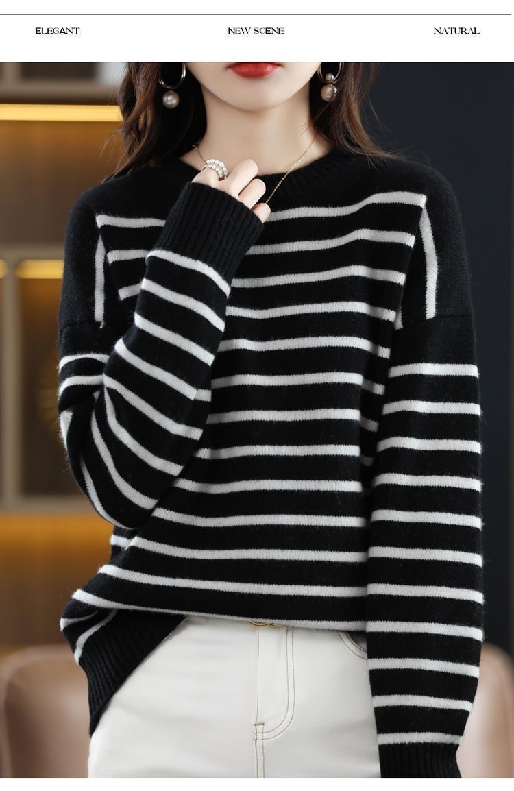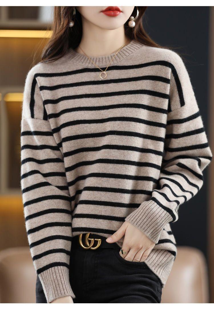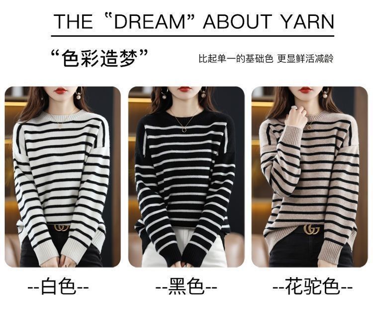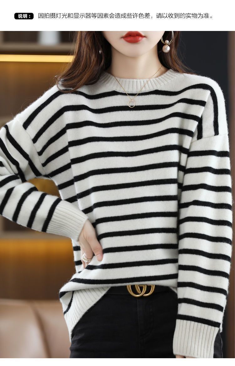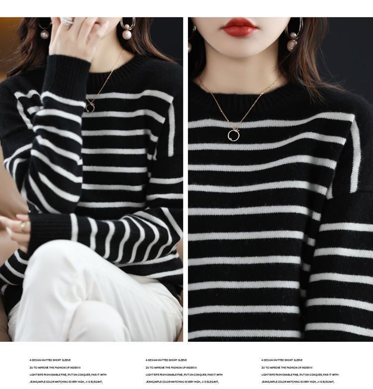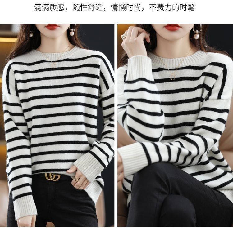 Suéter de Cuello Redondo a Rayas para Mujer Holgado Ropa Exterior Otoño e Invierno Nuevo Estilo Estilo Perezoso Top de Punto Moderno Combinable Básico
