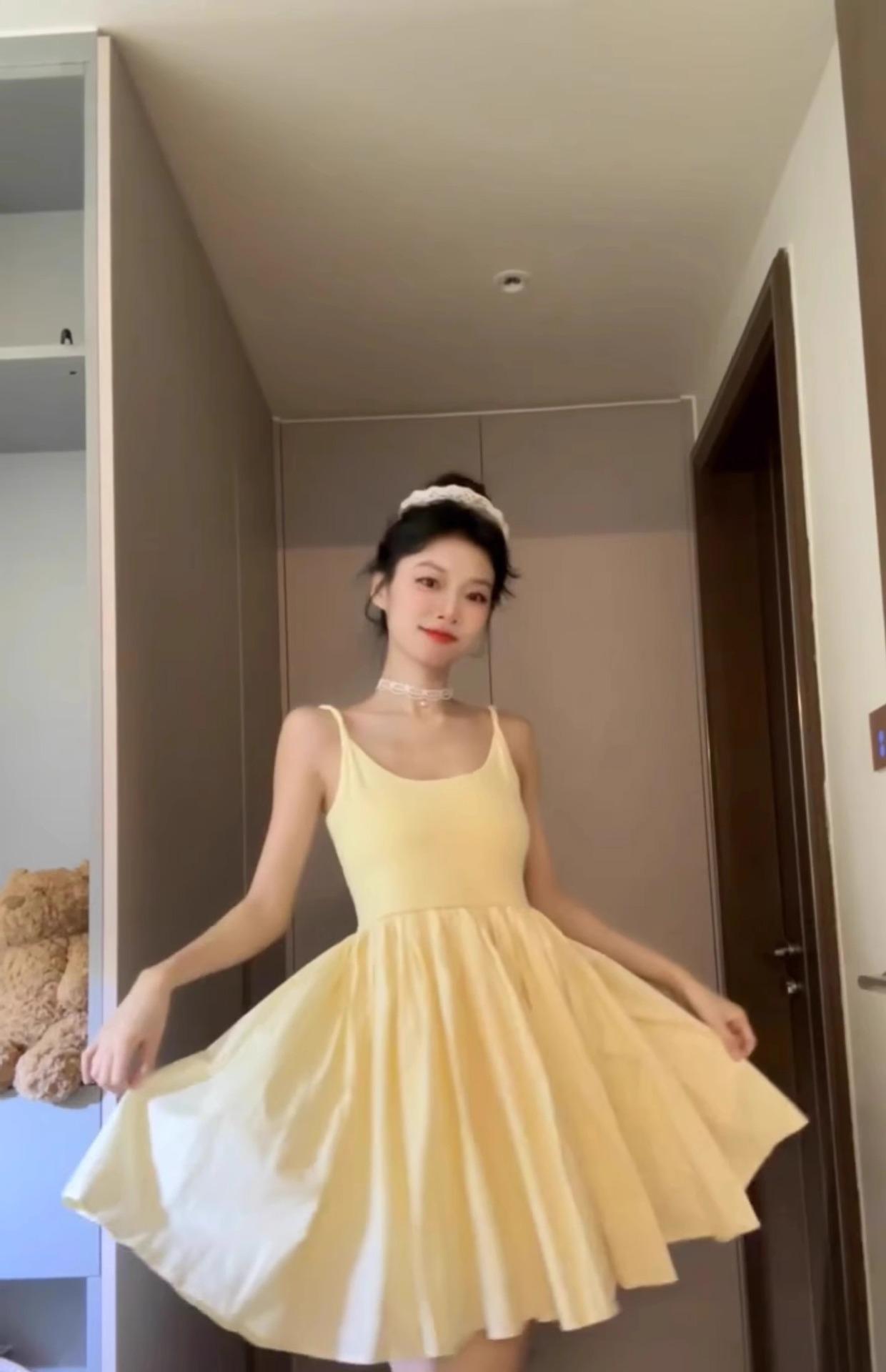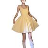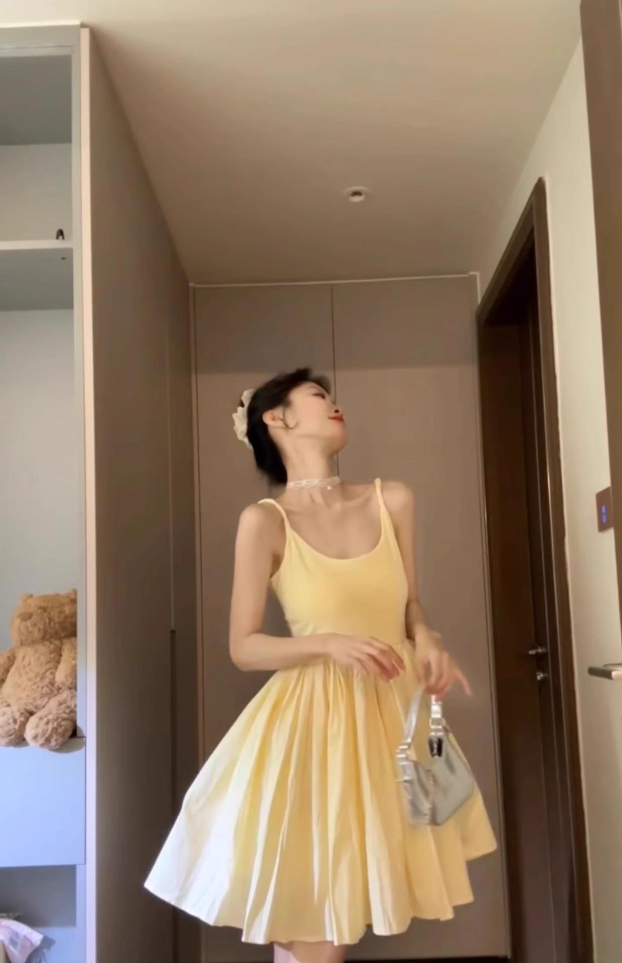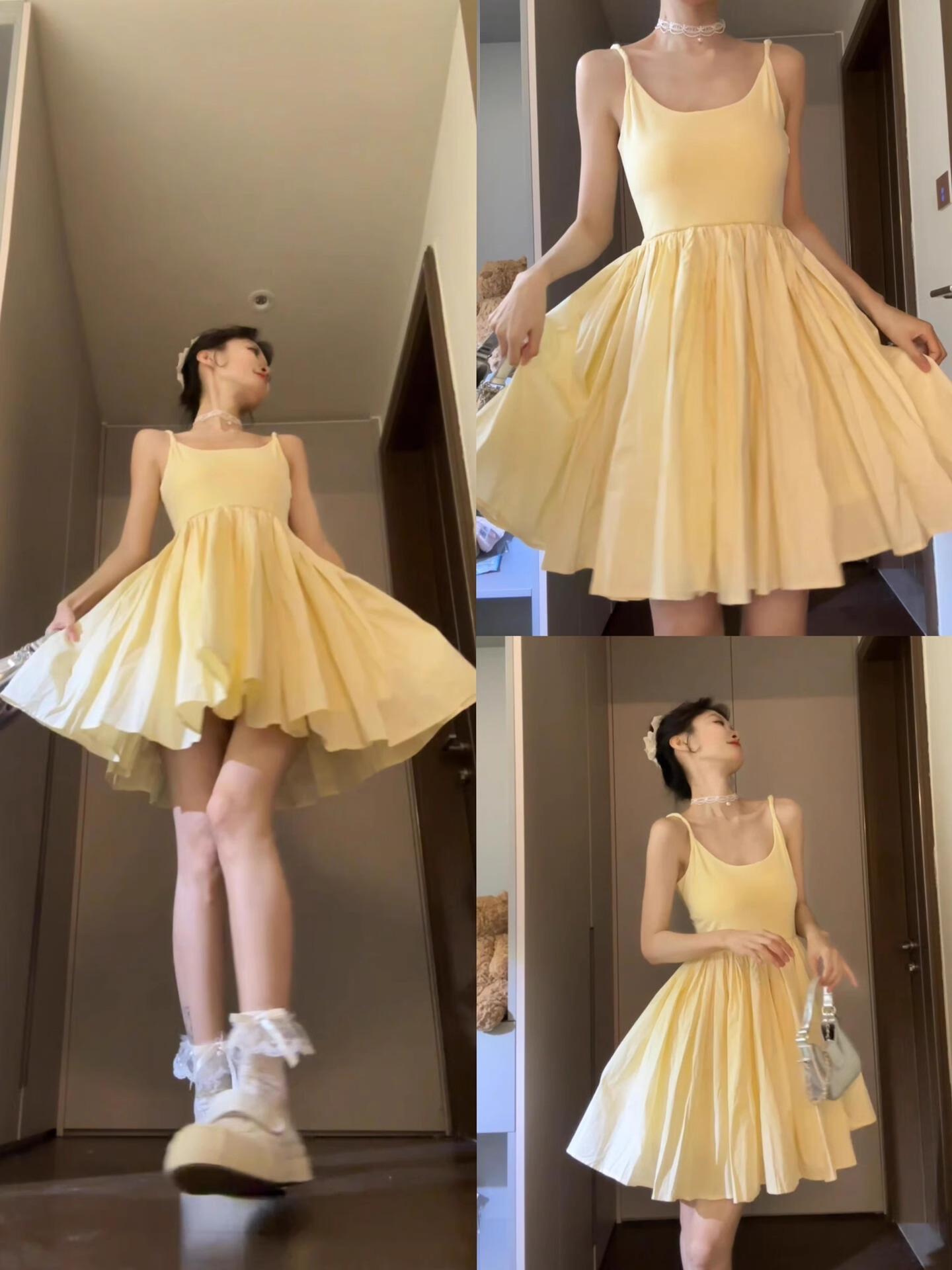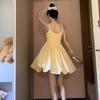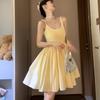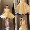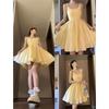 Vestido Amarillo de Tirantes Finos Estilo Francés para Mujer, Verano 2025 Nuevo Petite Vacación de Playa Elegante Vestido Corto Abullonado