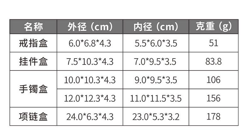 7x8 small pendant box, 7.5x10 large pendant box, 6x7 ring box, 6x24 necklace box, 12x12 large bracelet box, 10...