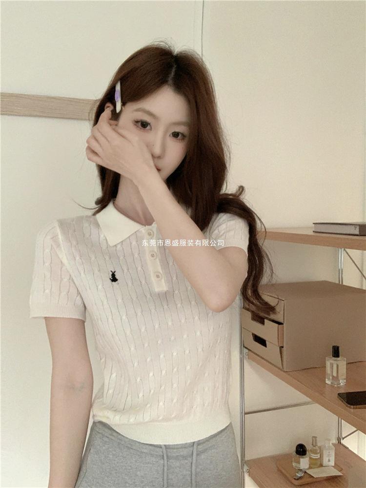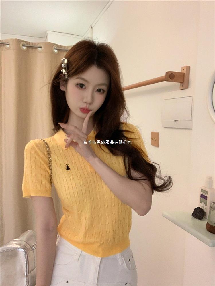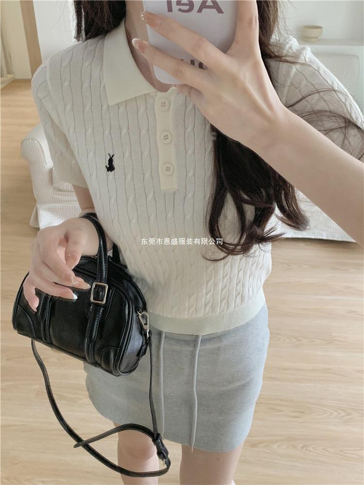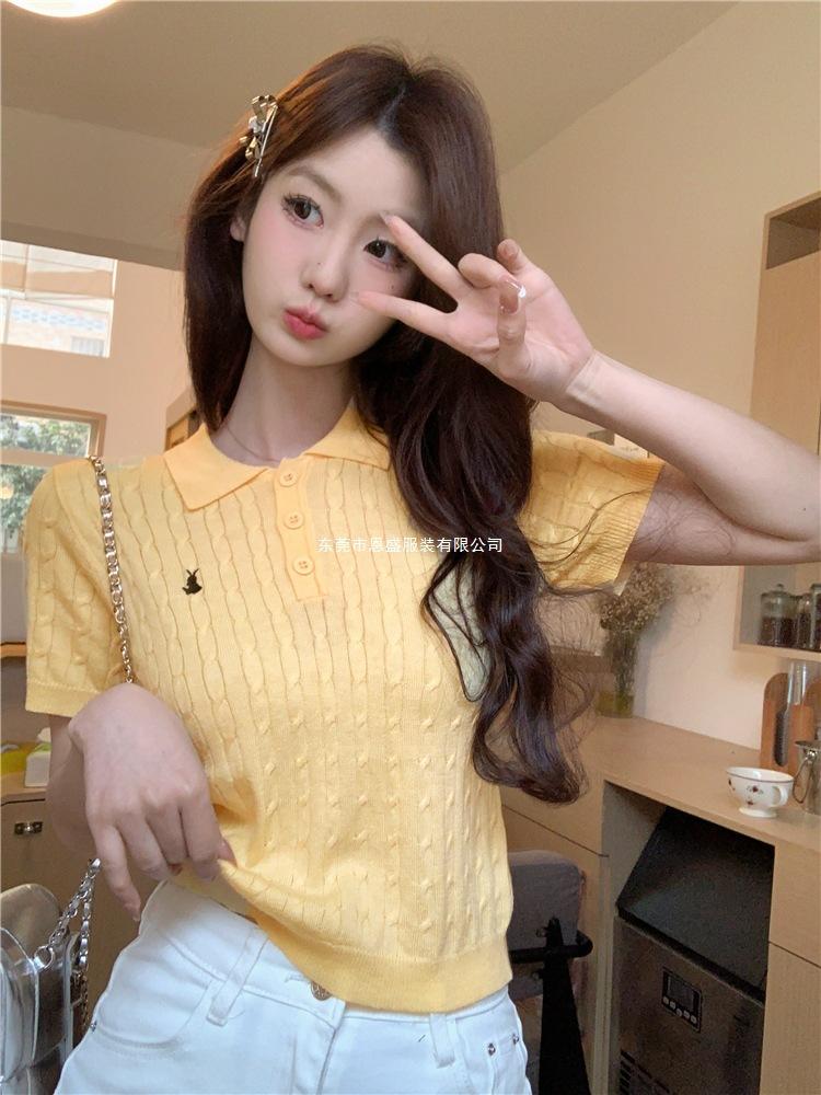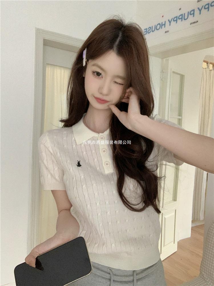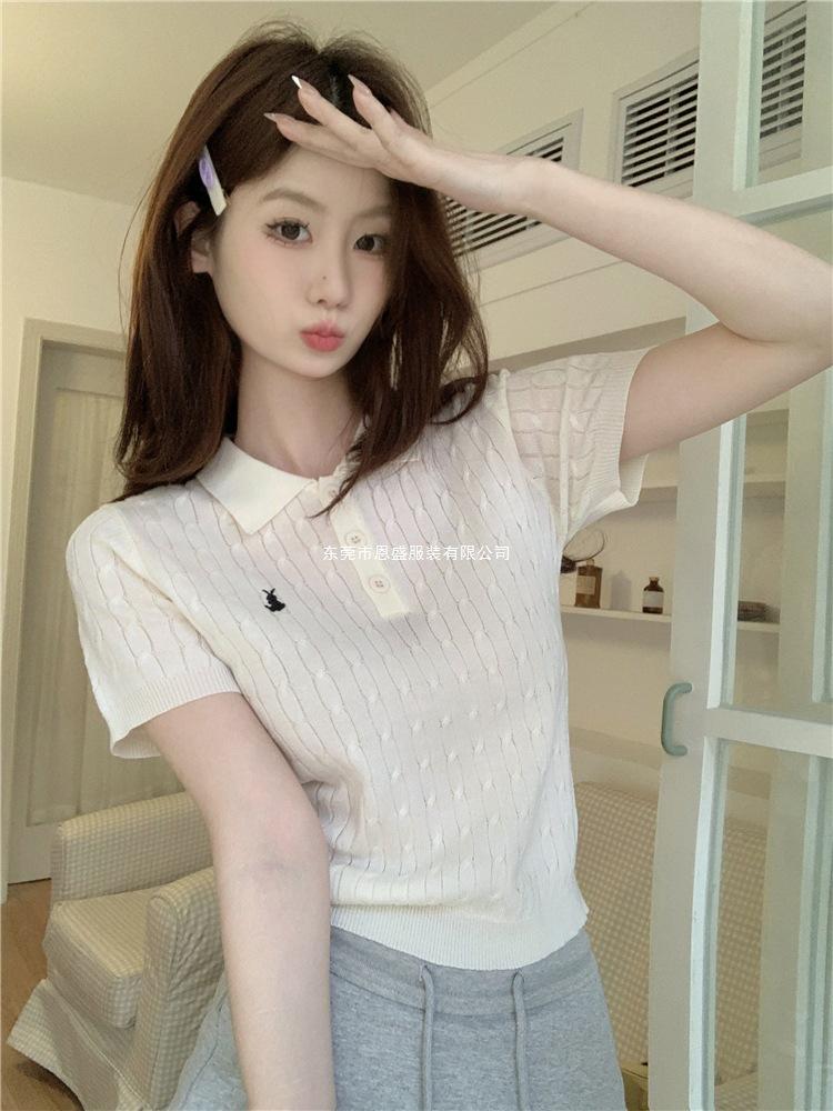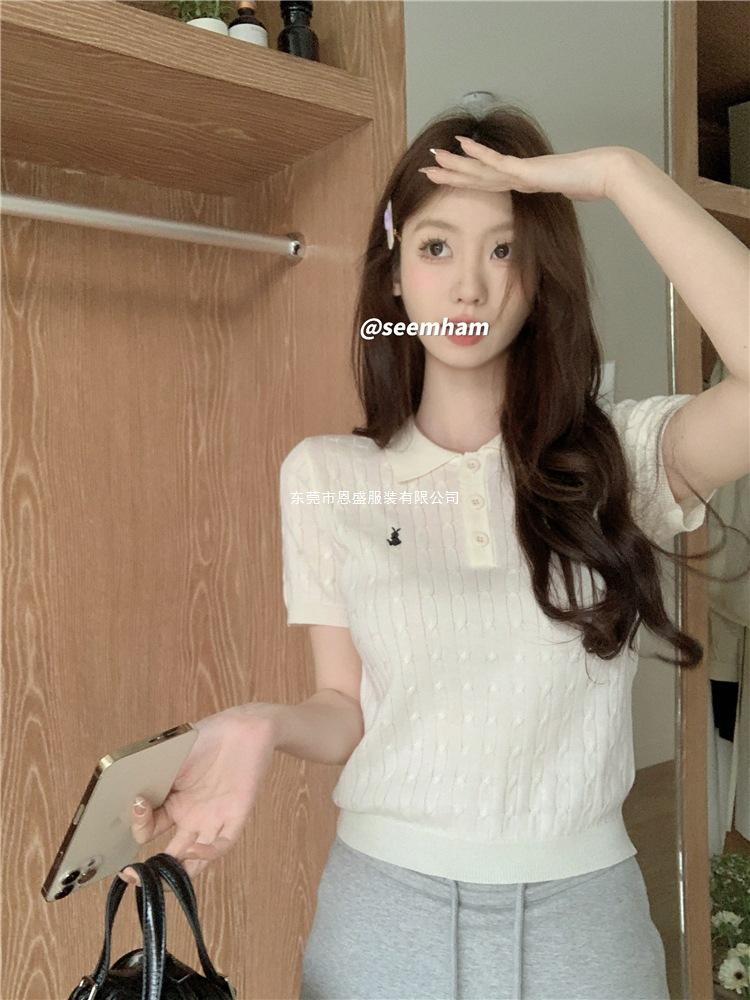Francés Único 2025 Nuevo Verano Estilo Coreano Camisa Cuello Polo Tejido Seda de Hielo Manga Corta Camiseta Top Corto de Mujer