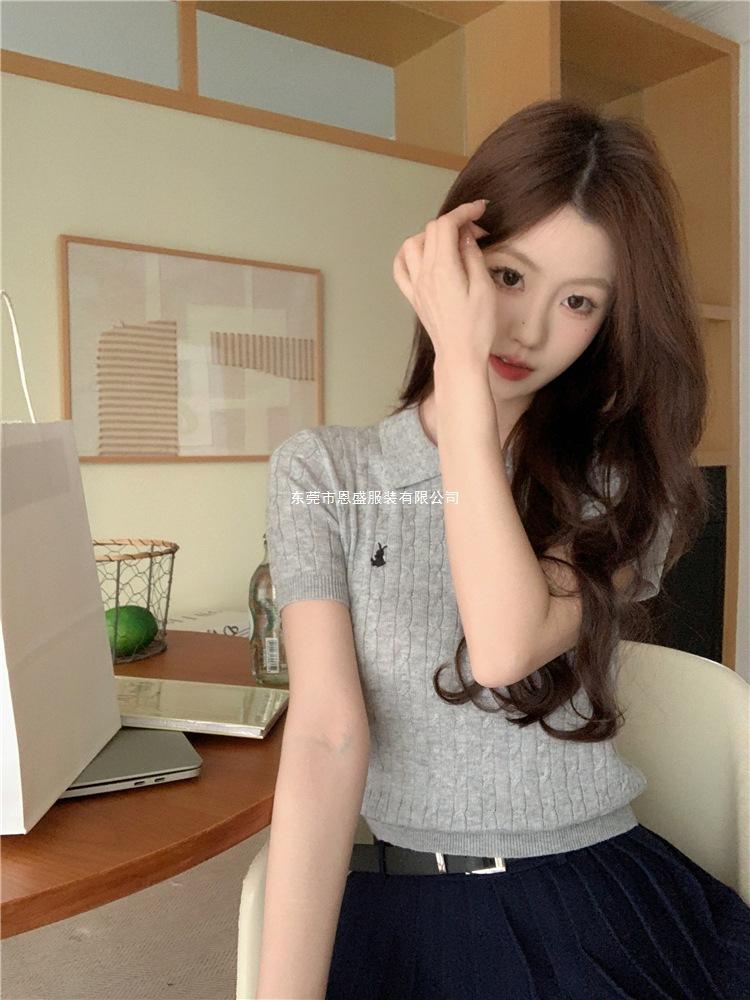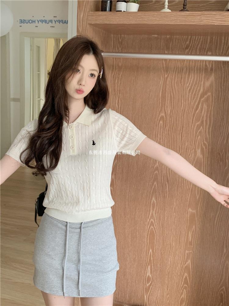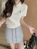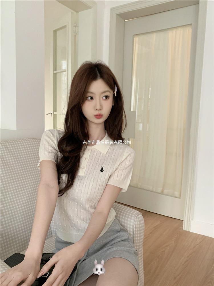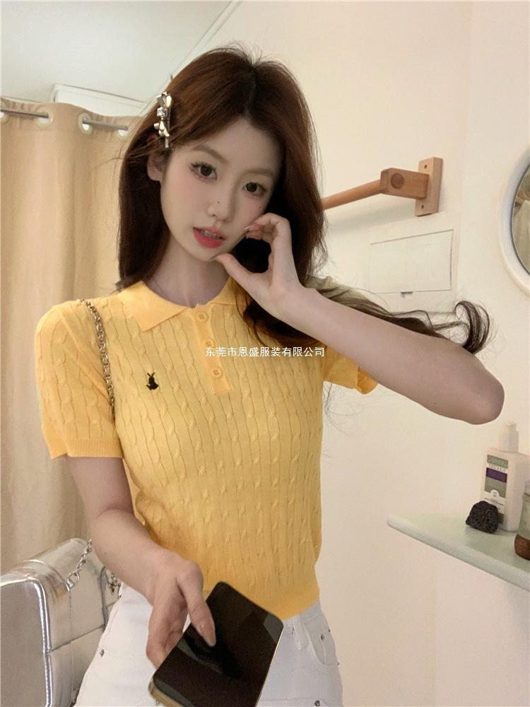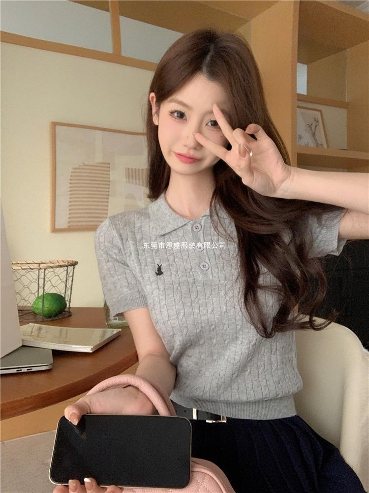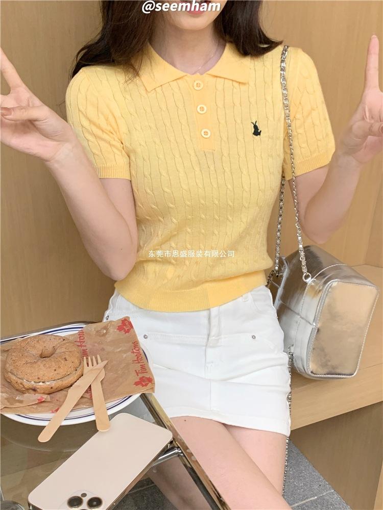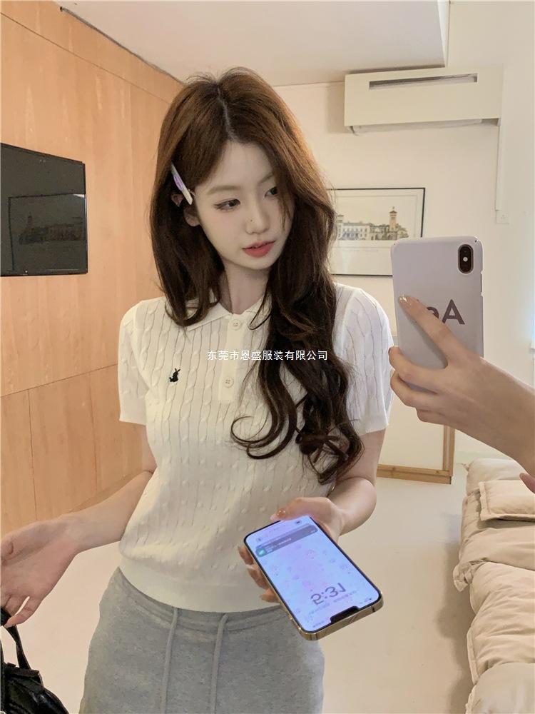 Francés Único 2025 Nuevo Verano Estilo Coreano Camisa Cuello Polo Tejido Seda de Hielo Manga Corta Camiseta Top Corto de Mujer
