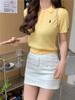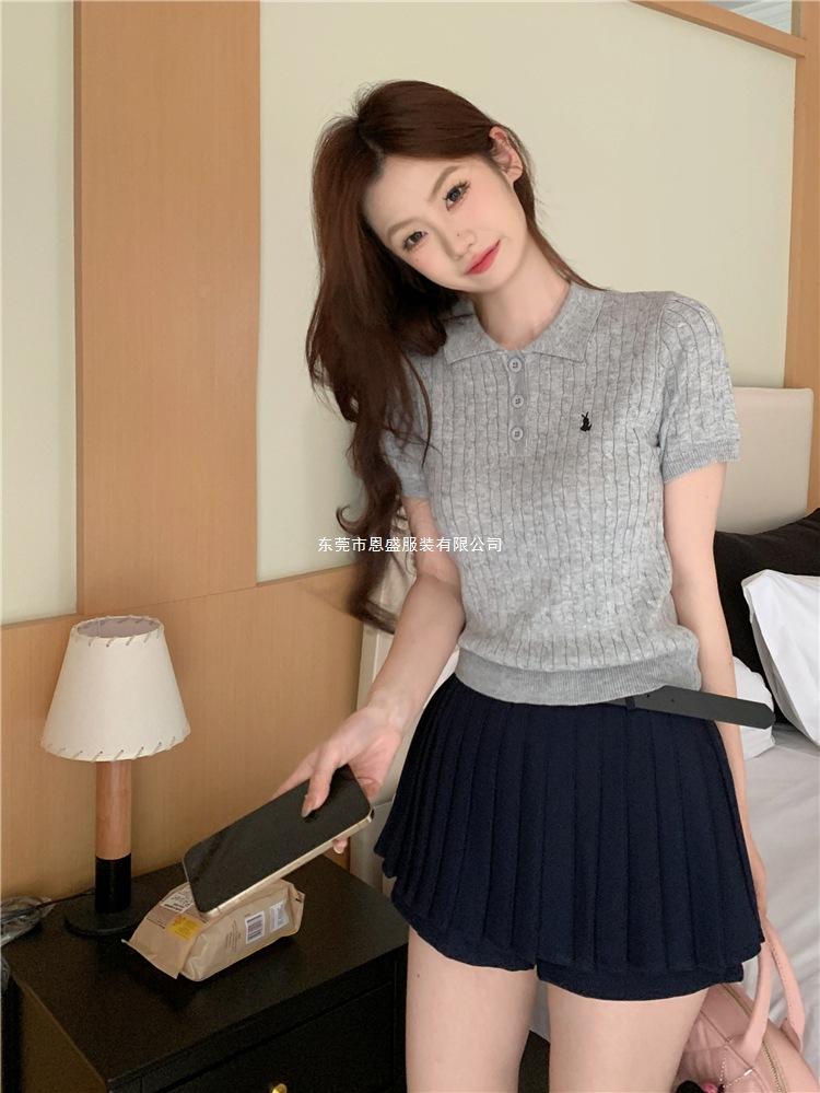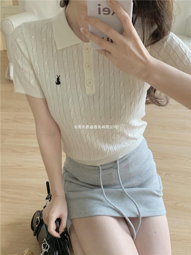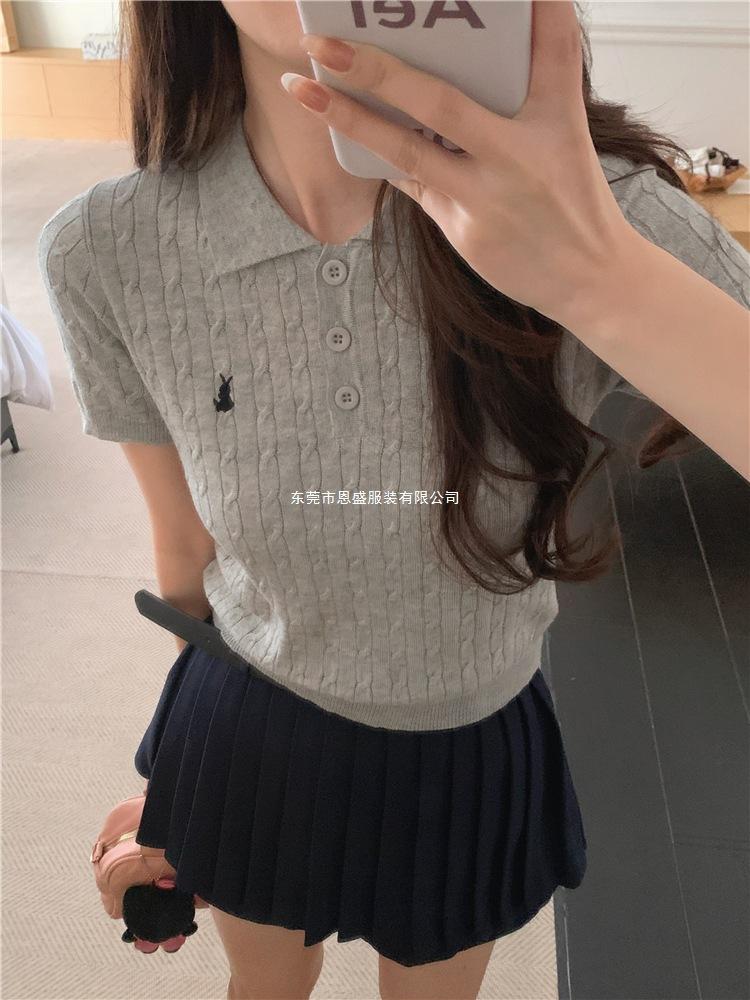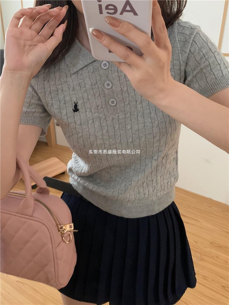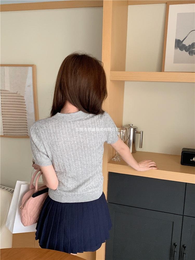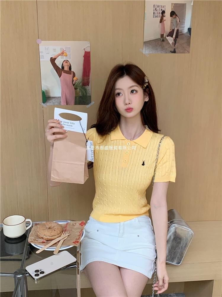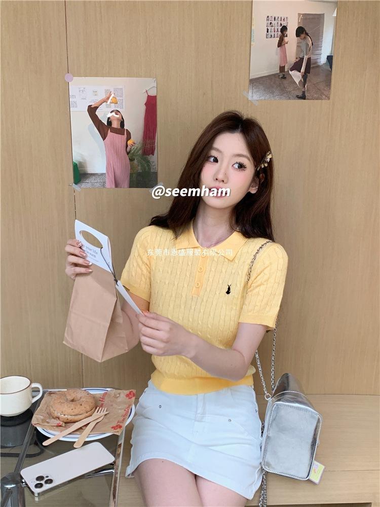 Francés Único 2025 Nuevo Verano Estilo Coreano Camisa Cuello Polo Tejido Seda de Hielo Manga Corta Camiseta Top Corto de Mujer