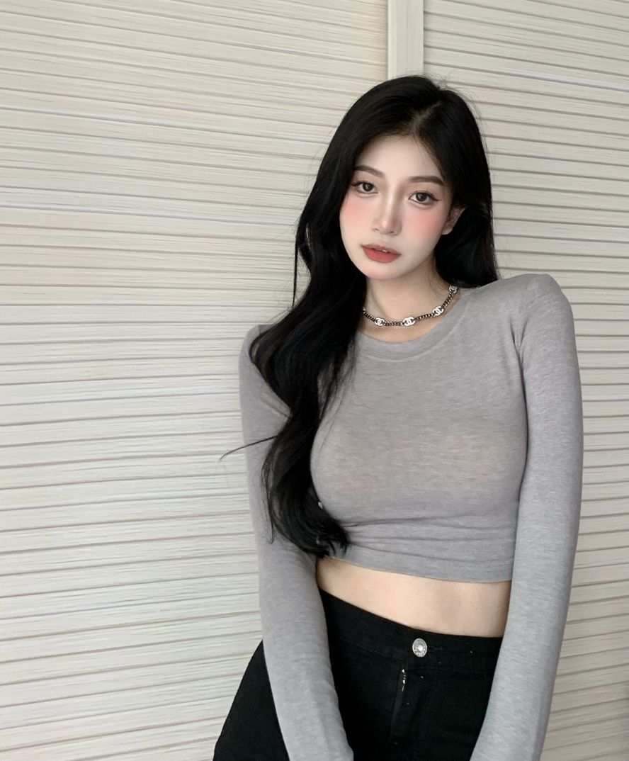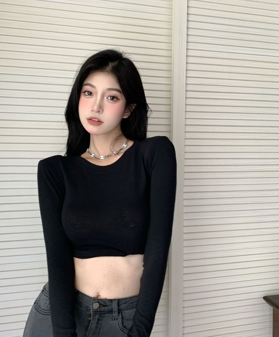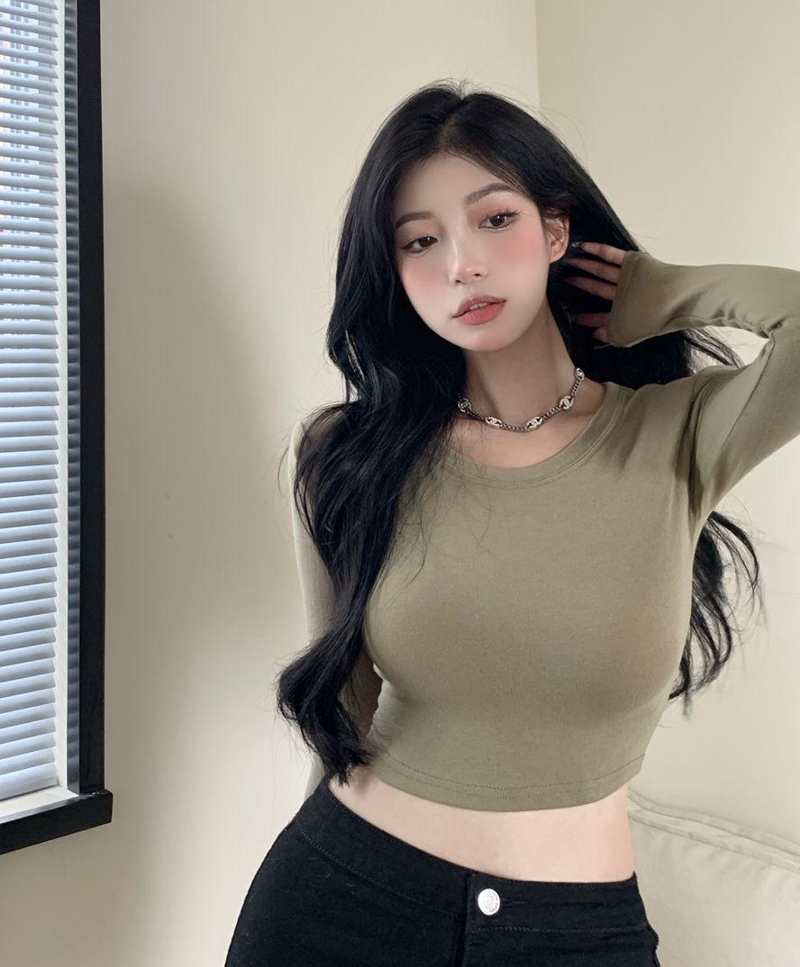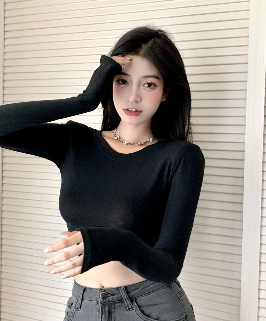 Camiseta de manga larga para mujer, estilo coreano, corta, ajustada, sexy, para chica, primavera y otoño, nueva, de color liso, fina, con cuello redondo.