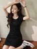 Vestido 150 Estilo Francés Corto Ajustado Cuello Cuadrado Diseño de Verano para Mujer Cintura Plisada Línea A Manga Corta Largo Medio