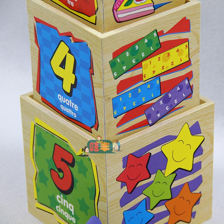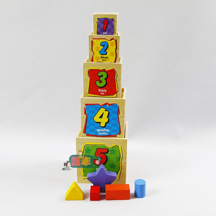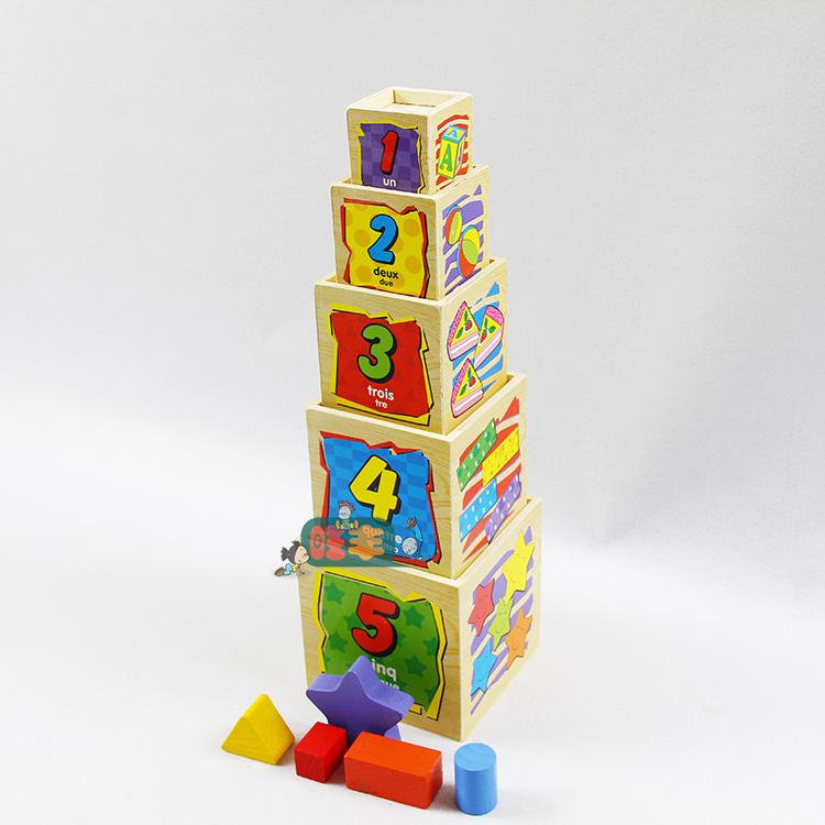 Función del juguete: El juguete consta de cinco cajas cúbicas que aumentan gradualmente de tamaño y cinco formas tridimensionales. Los cuatro lados de las cajas cúbicas presentan formas recortadas, números arábigos con traducciones al inglés, cantidades correspondientes de objetos y formas de varios colores con traducciones al inglés. Esto permite a los niños apilarlos capa por capa para comparar tamaños. Apilarlos en orden de menor a mayor o de mayor a menor creará diferentes efectos. Durante el proceso de apilamiento, los niños aprenden a reconocer formas, colores, números e inglés sencillo, lo que lo convierte en un juguete completamente funcional.