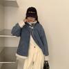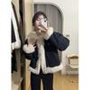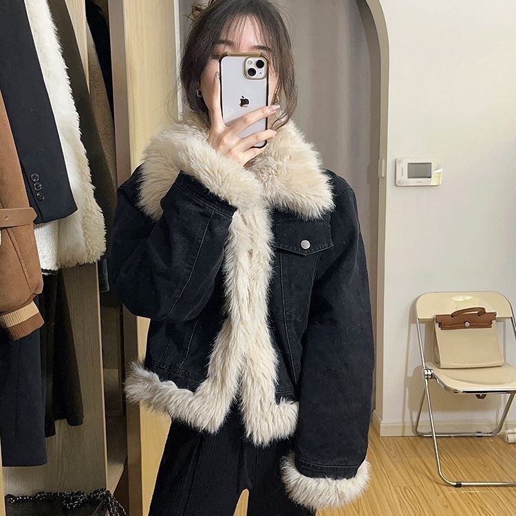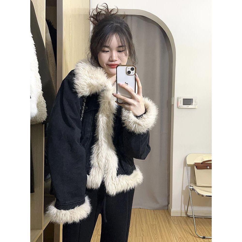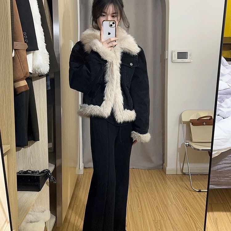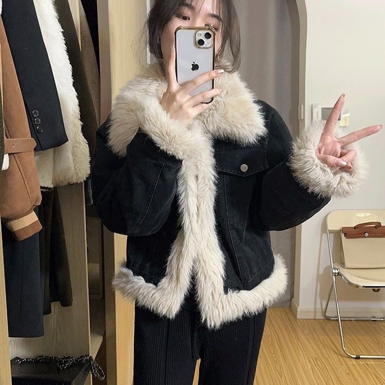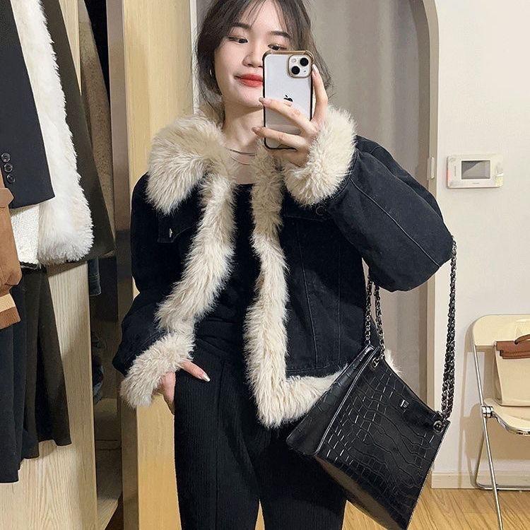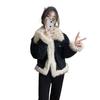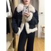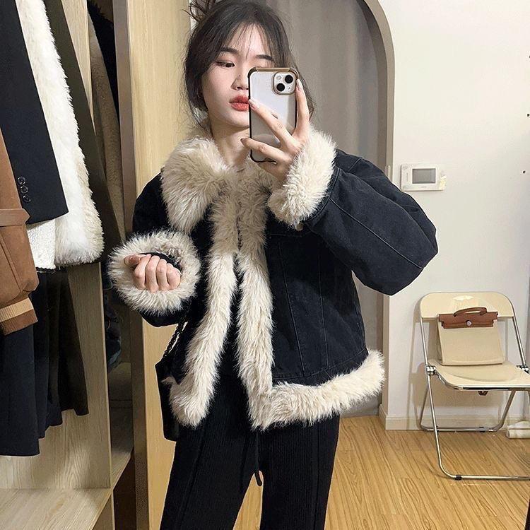 Otoño e Invierno 2024 Ropa de Algodón Nueva para Gente Pequeña, Ropa de Algodón Corta Acolchada, Chaquetas de Mezclilla Negras con Piel Empalmada para Mujer