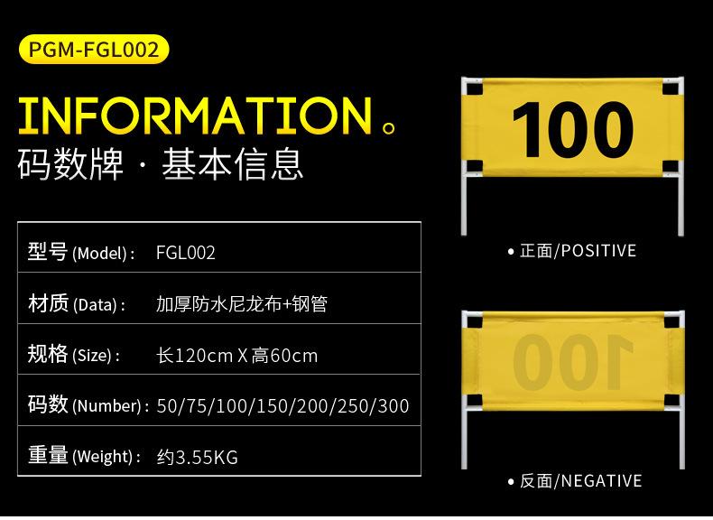 especificaciones del producto | 120cm de largo x 60cm de alto | Material | Tela de nailon amarilla + tubo de acero inoxidable, impreso con números negros extra grandes. | |