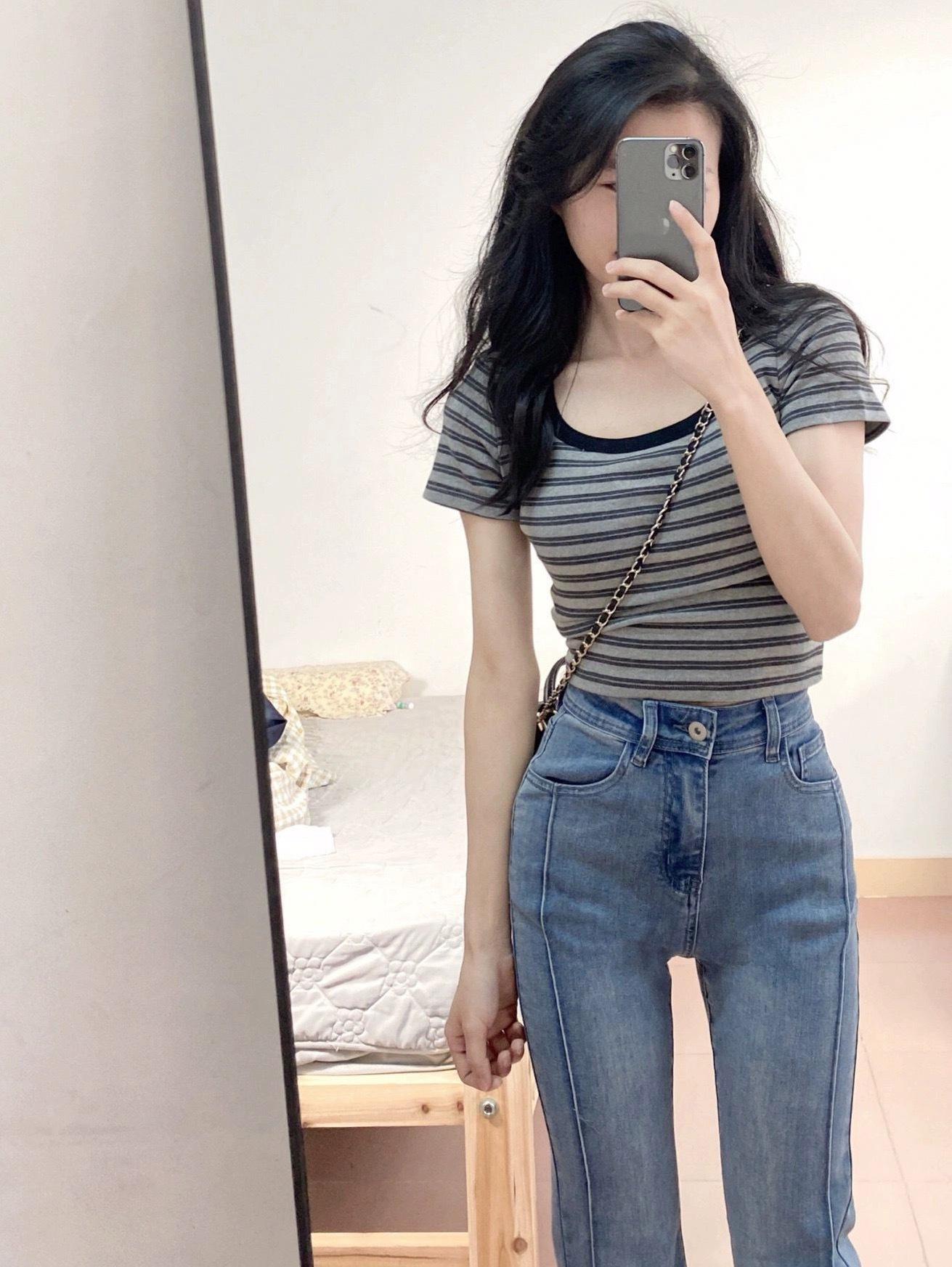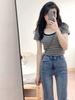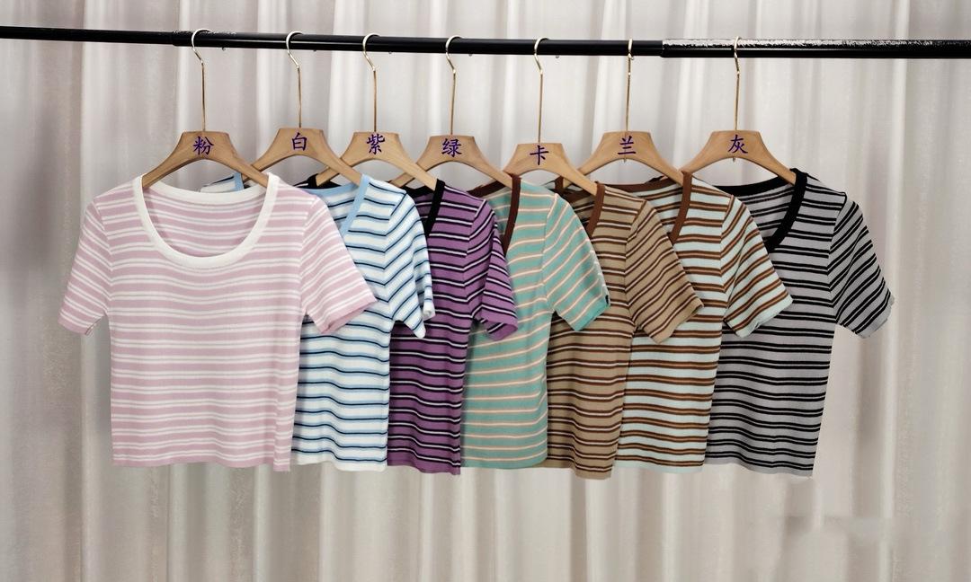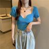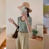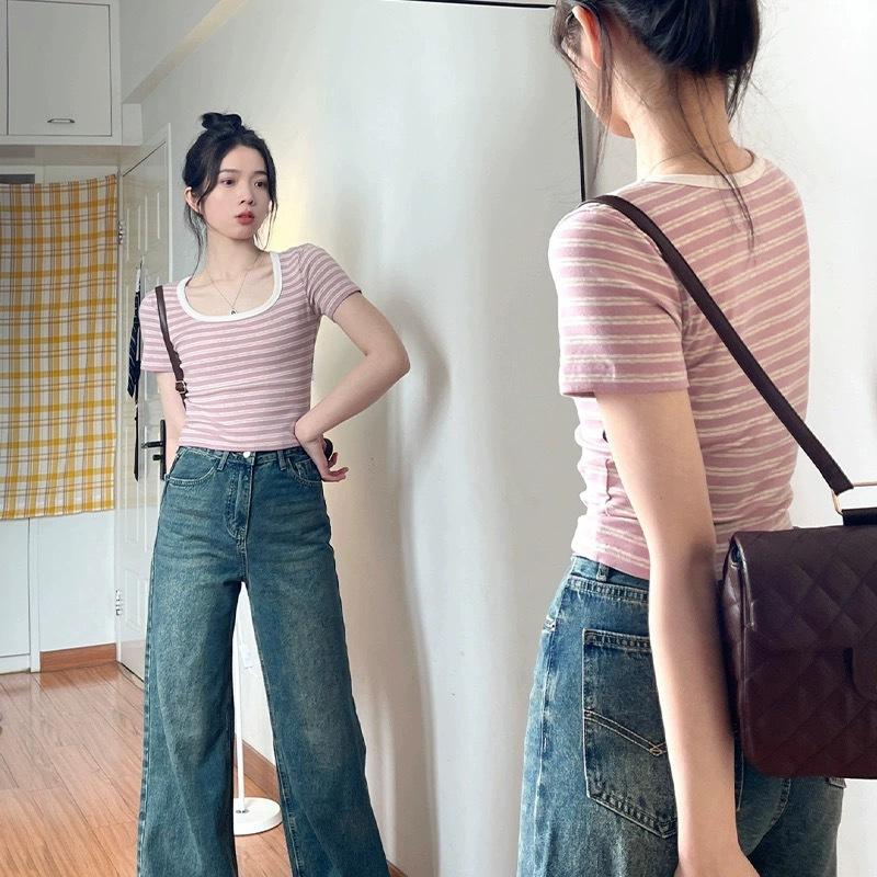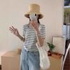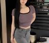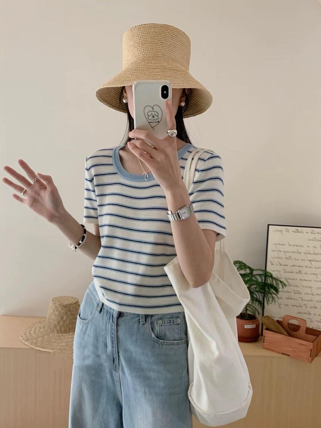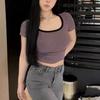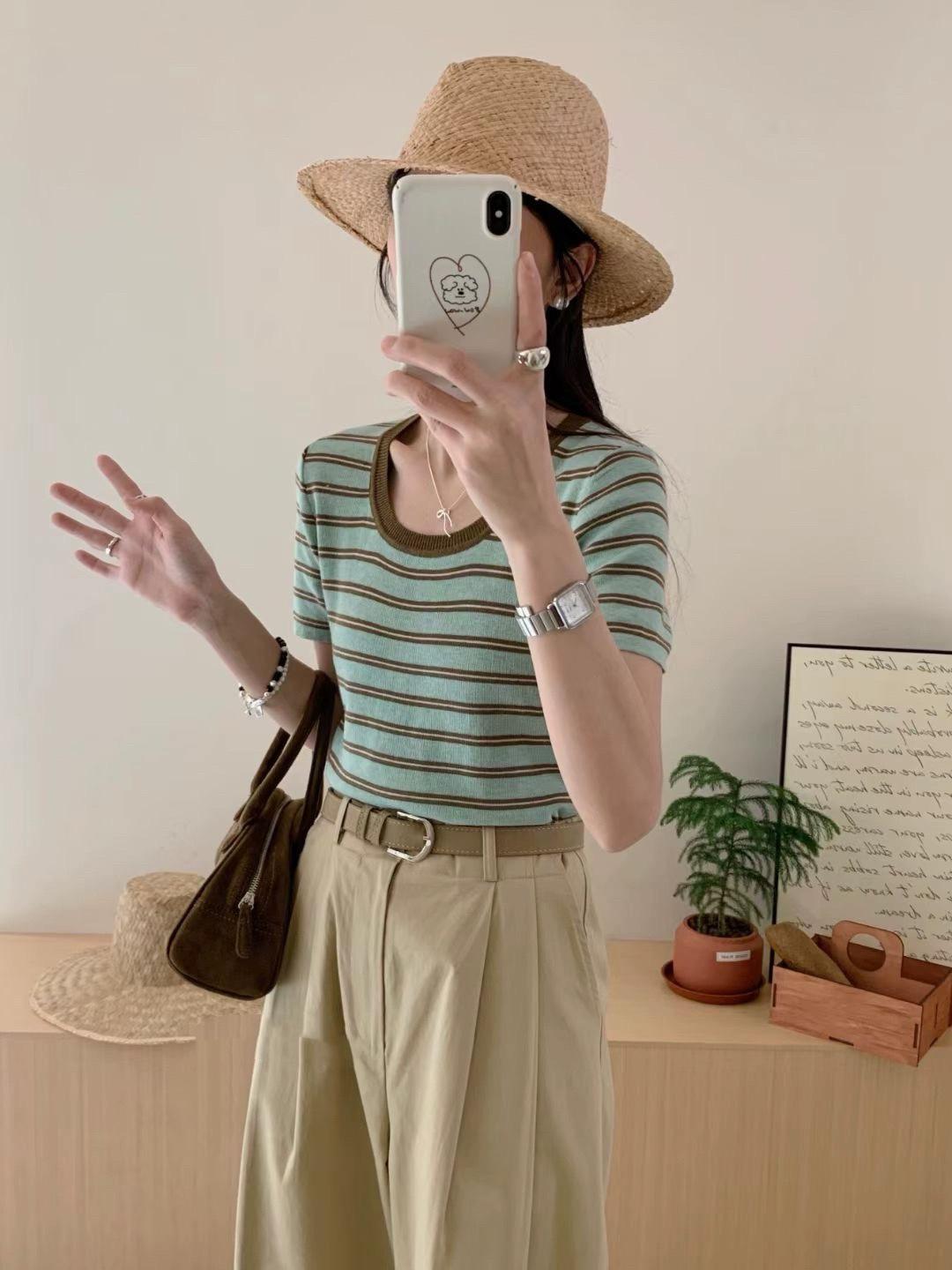 Estilo Americano Retro Rayado Cuello Cuadrado Manga Corta Tejido de Punto para Mujer Verano Sentido del Diseño Nicho Ajustado Corto Chica Picante Ajustado Top