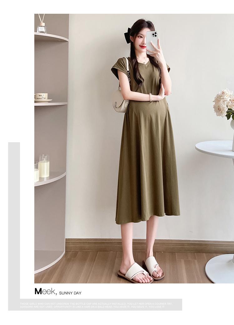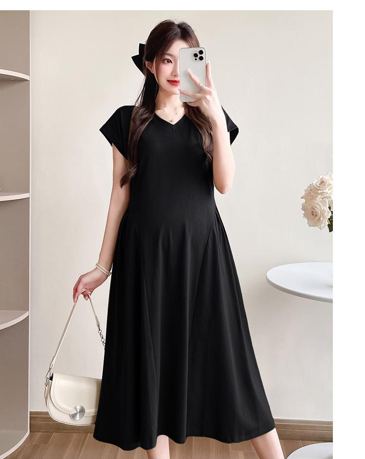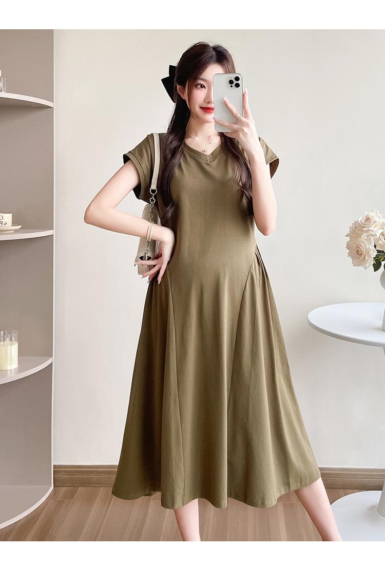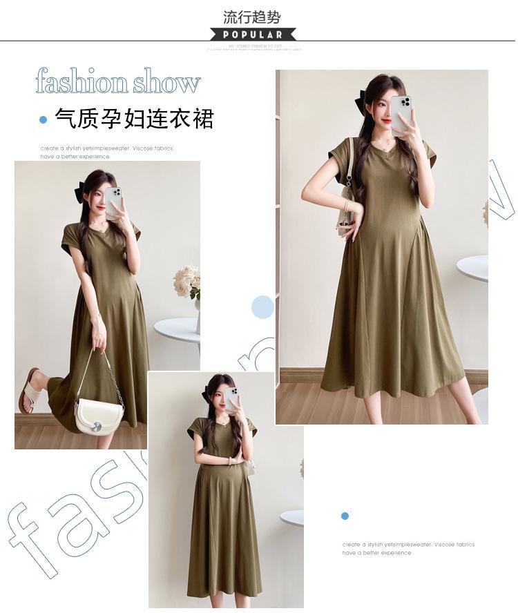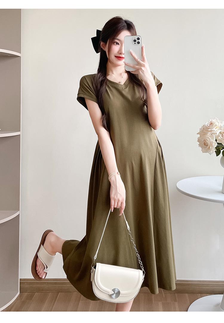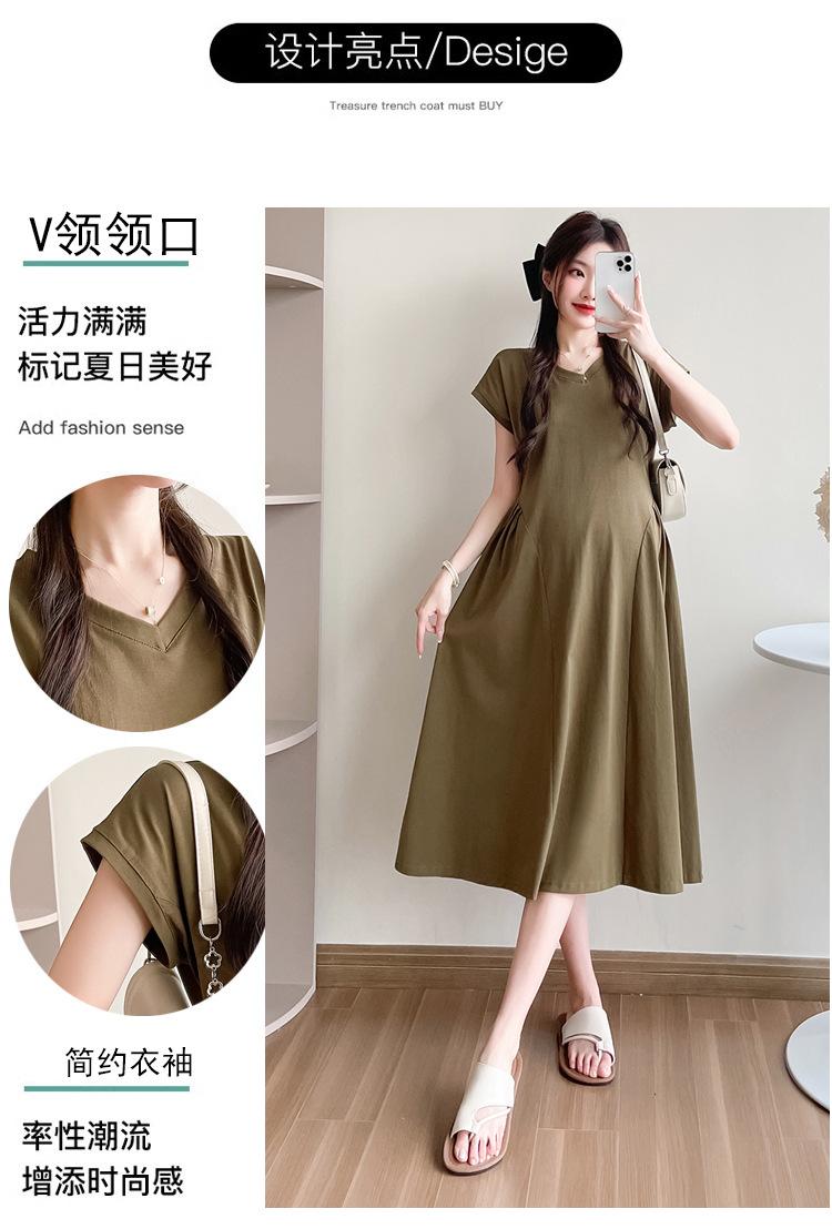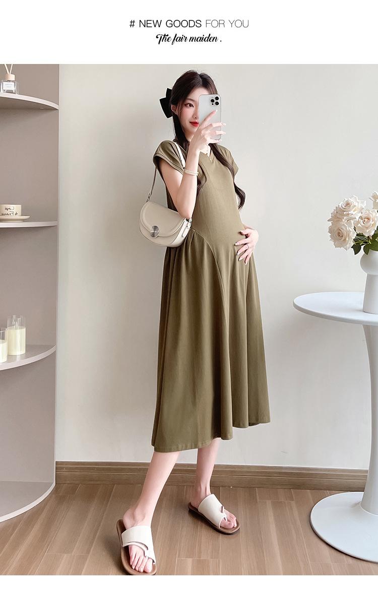 Vestido de maternidad de verano 2024, nuevo, estilo coreano, elegante, color sólido, adelgazante, con escote en V, largo medio, suelto, para embarazadas