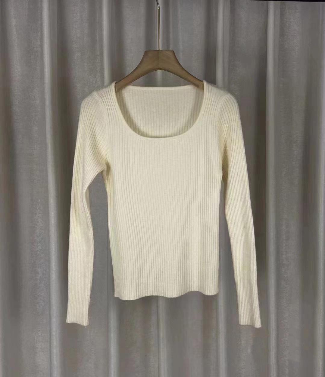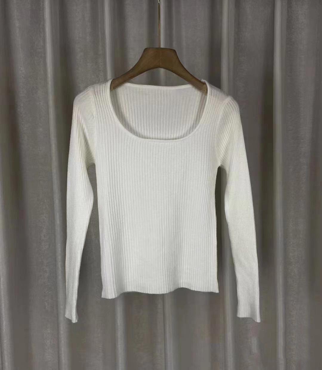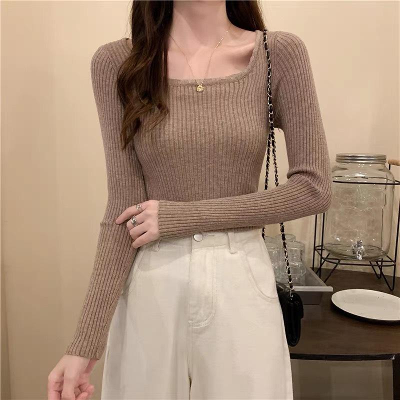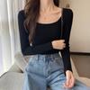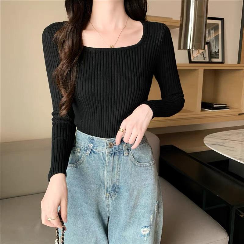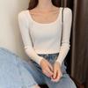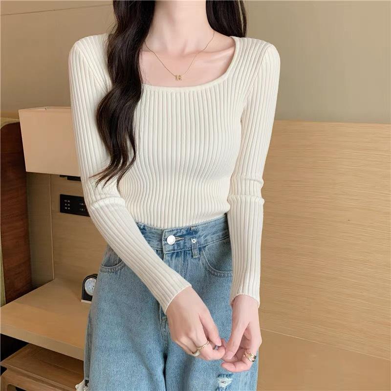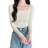 Sexy Camiseta Básica de Punto de Cuello Cuadrado para Mujer con Suéter 2025 Otoño e Invierno Nuevo Blanco Ajustado Corto Slim Fit Top