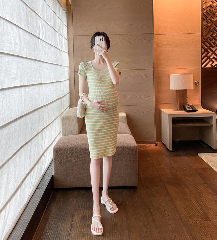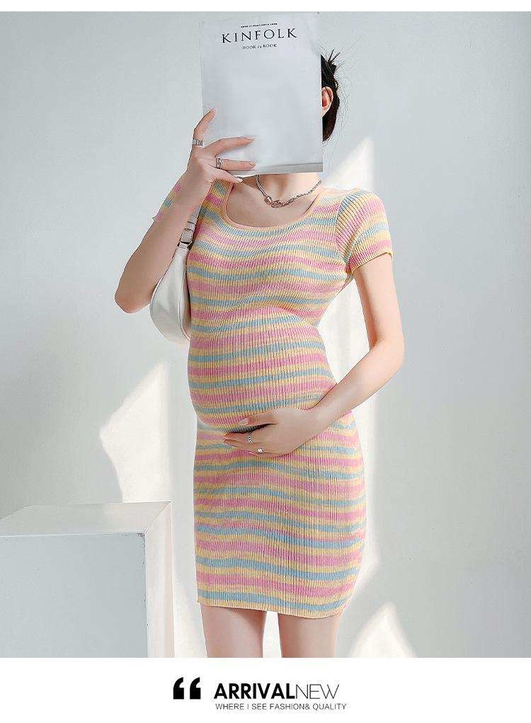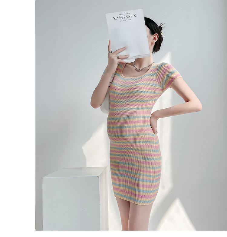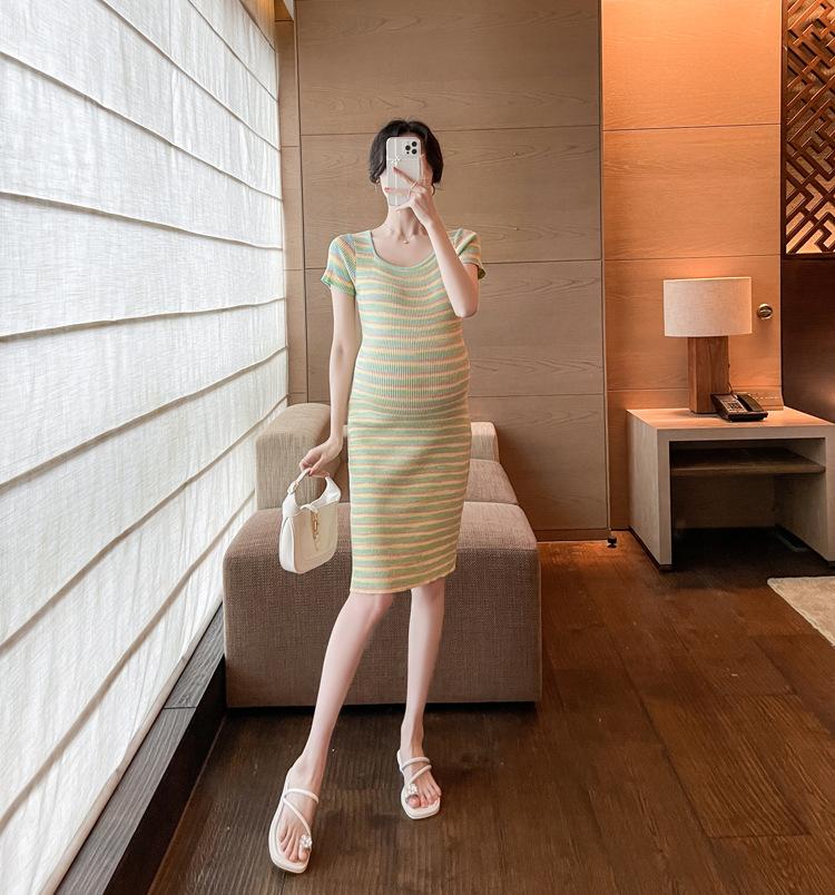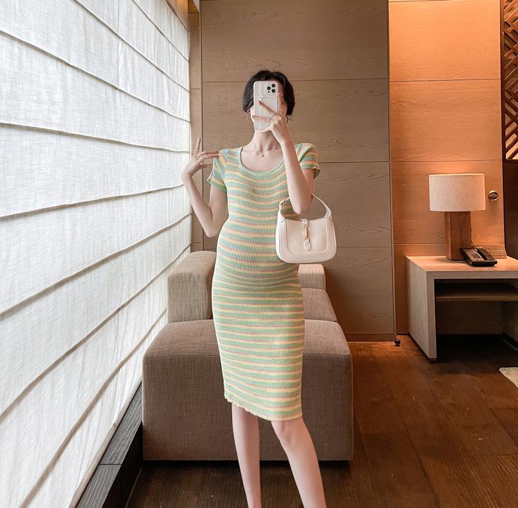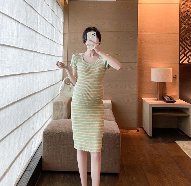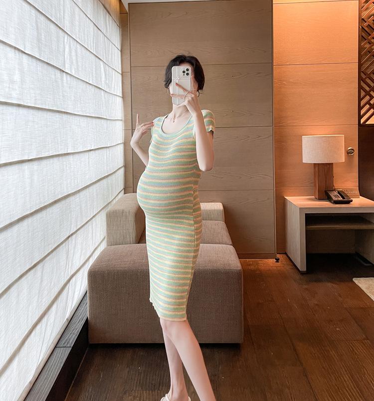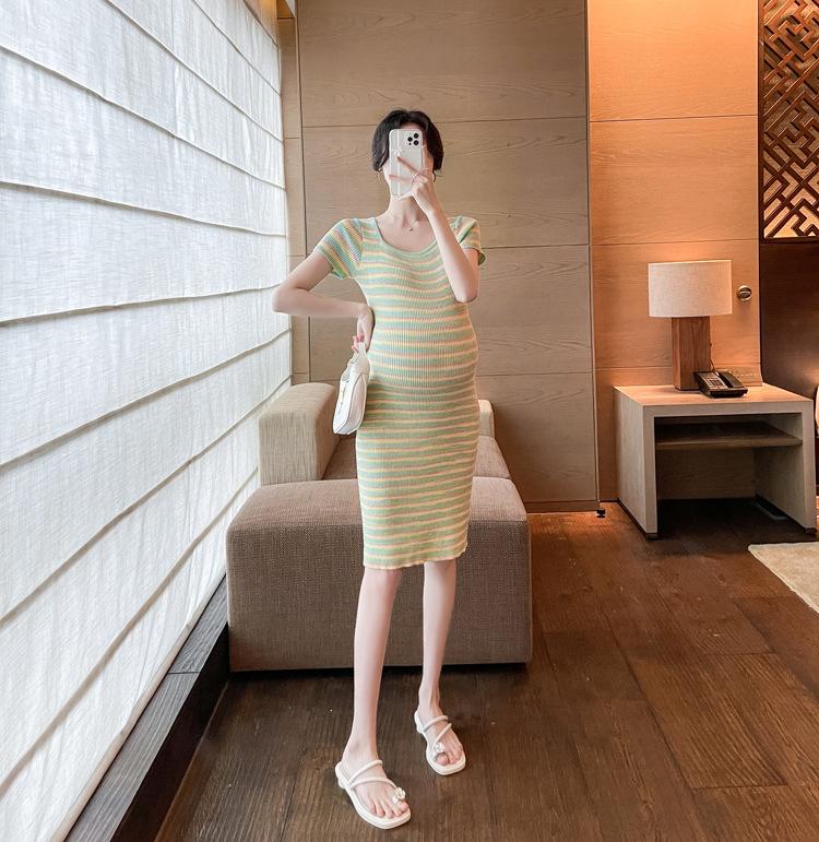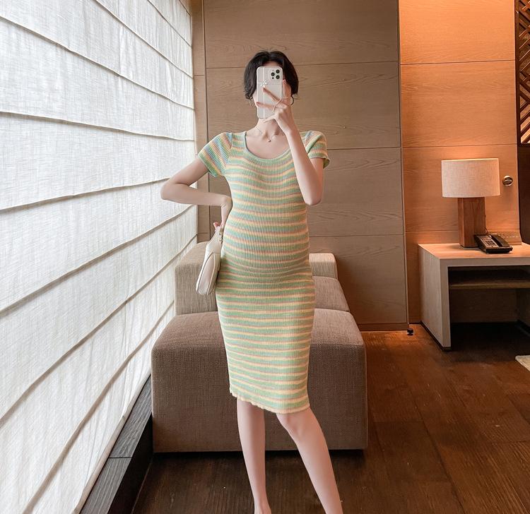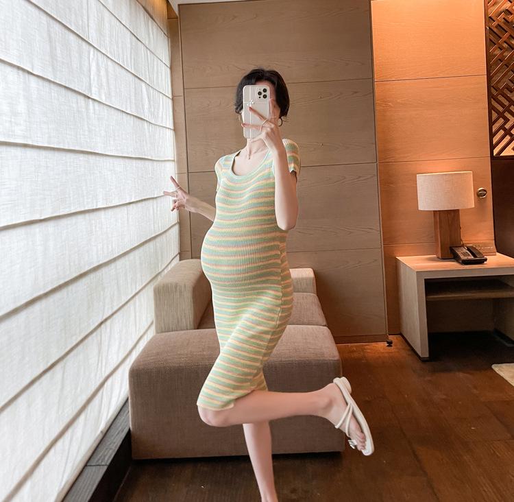 Maternidad 2024 Verano Nueva Moda Rayado Ajustado Adelgazante Tejido Suelto Talla Grande Vestido para Mujeres Embarazadas