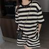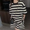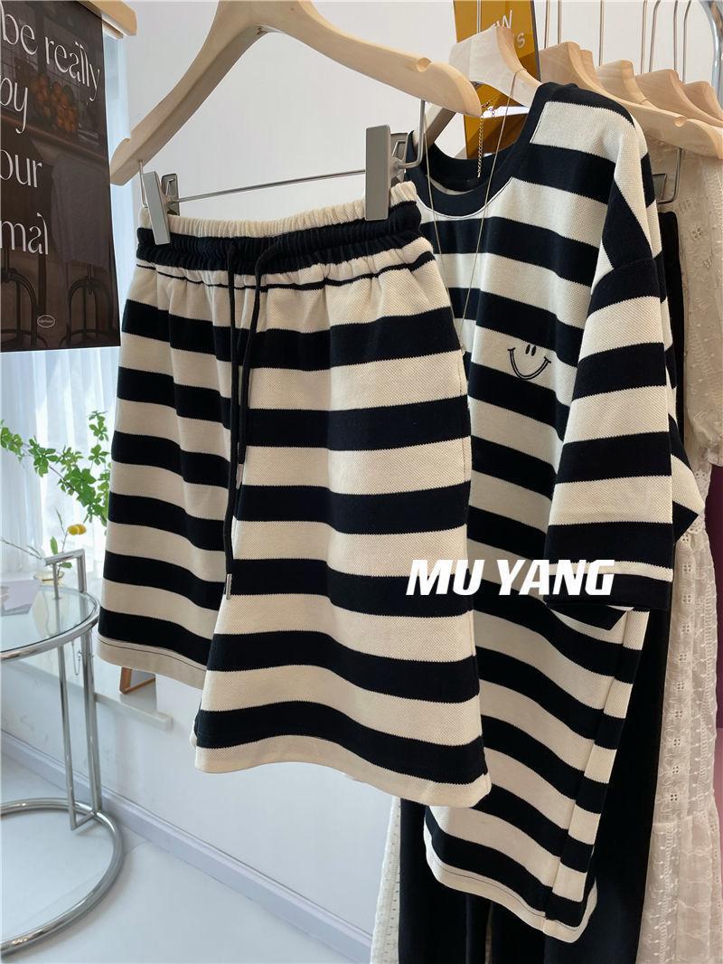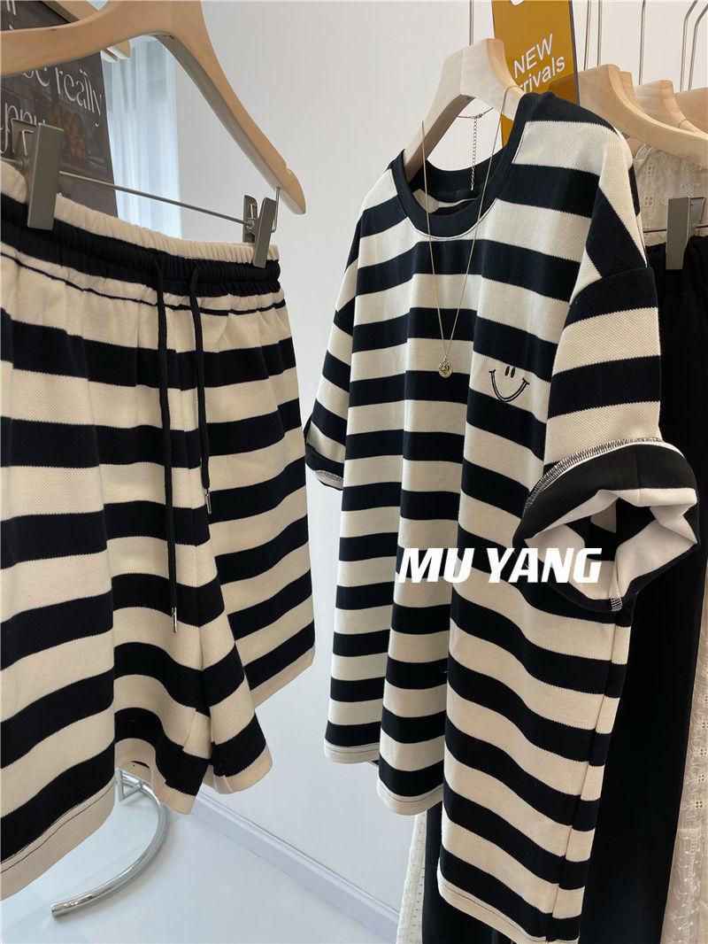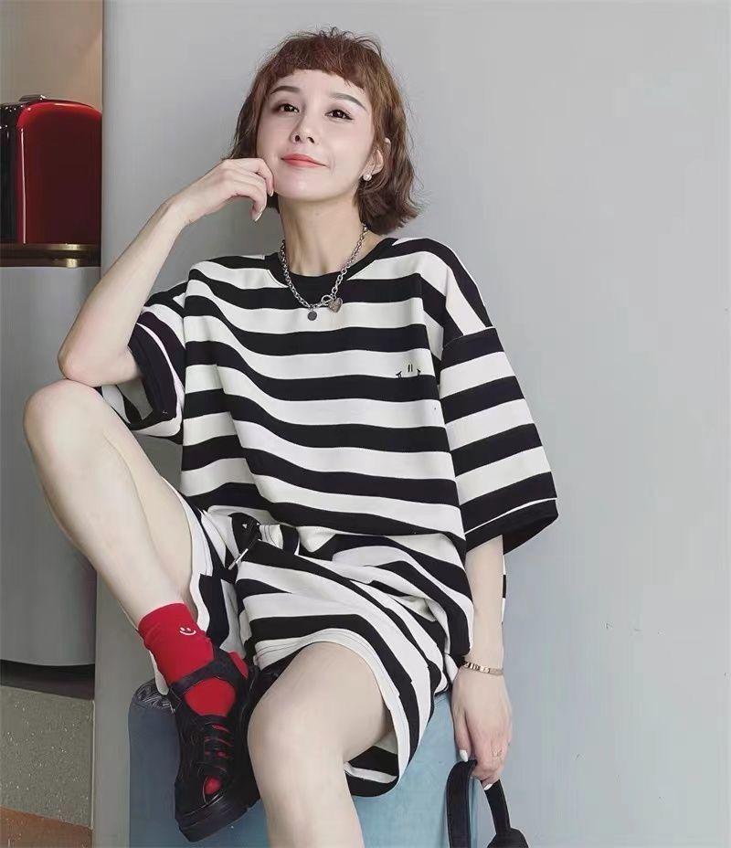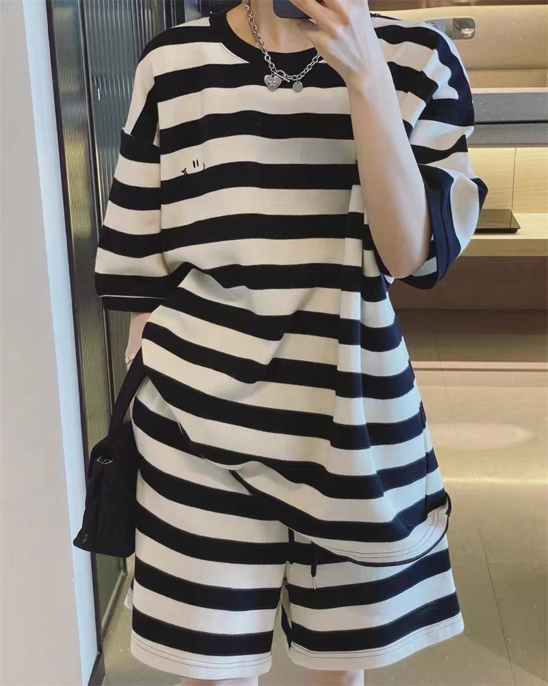 Traje Deportivo Casual de Moda a Rayas Transfronterizas para Mujer Verano Talla Extra Grande Camiseta Holgada para Mujer Shorts Conjunto de Dos Piezas Moderno