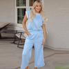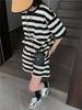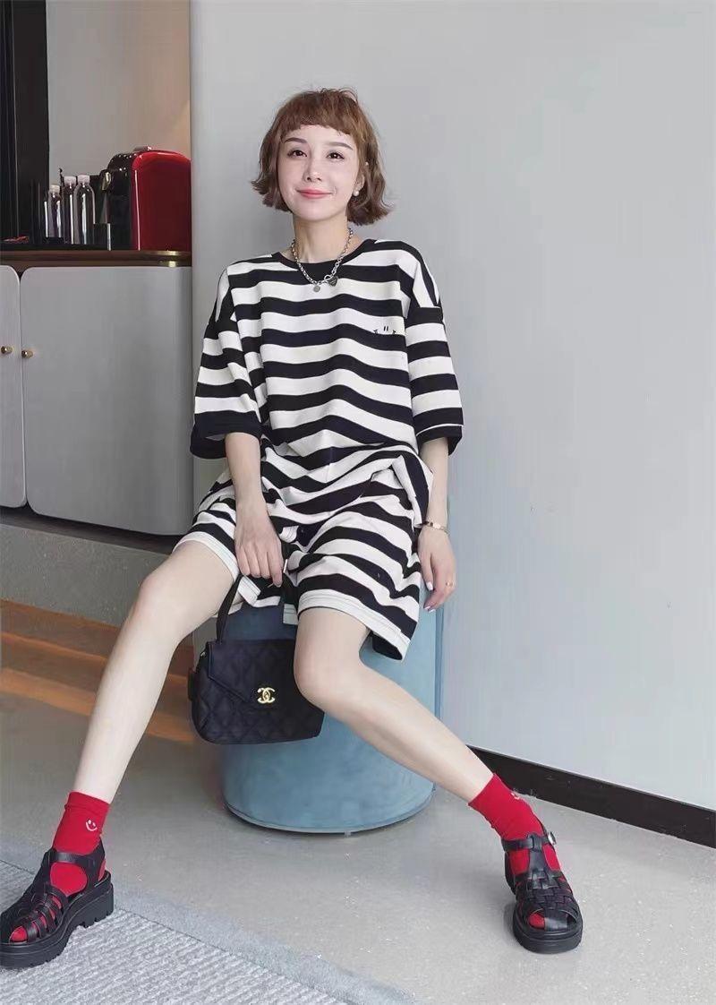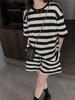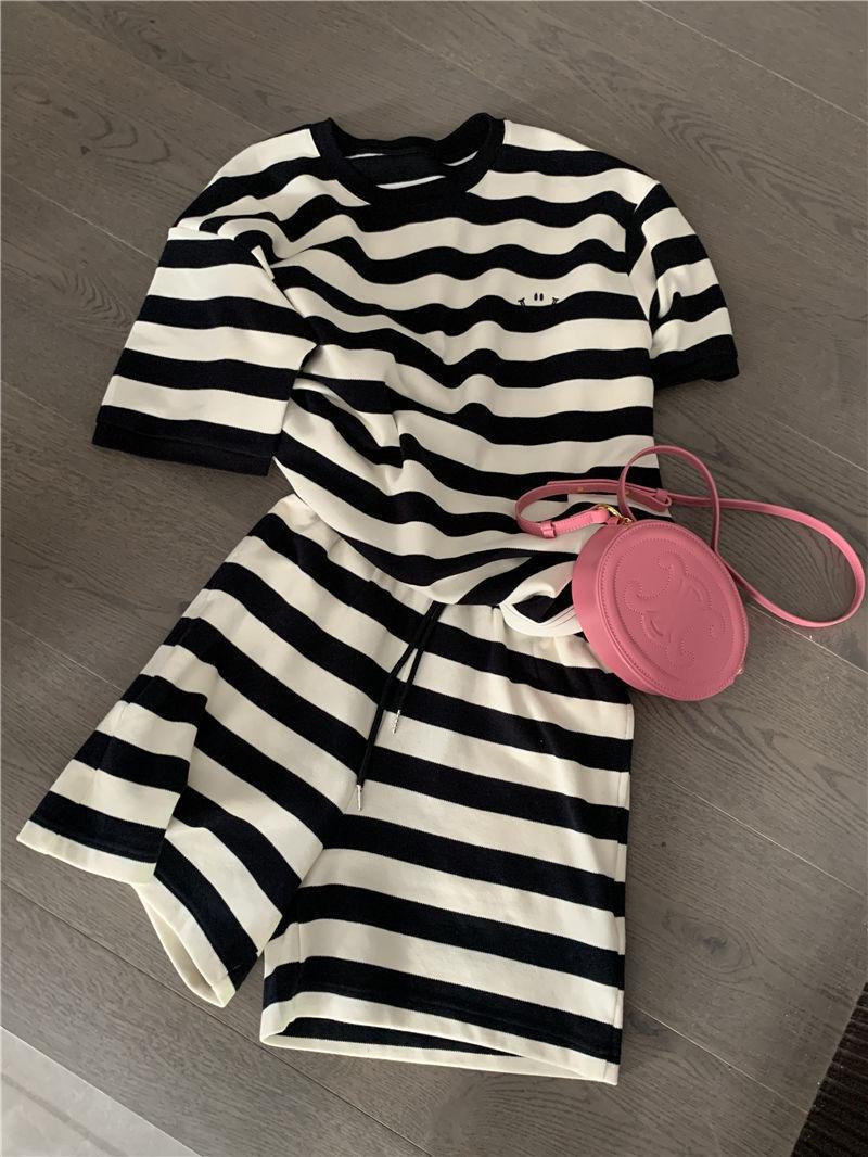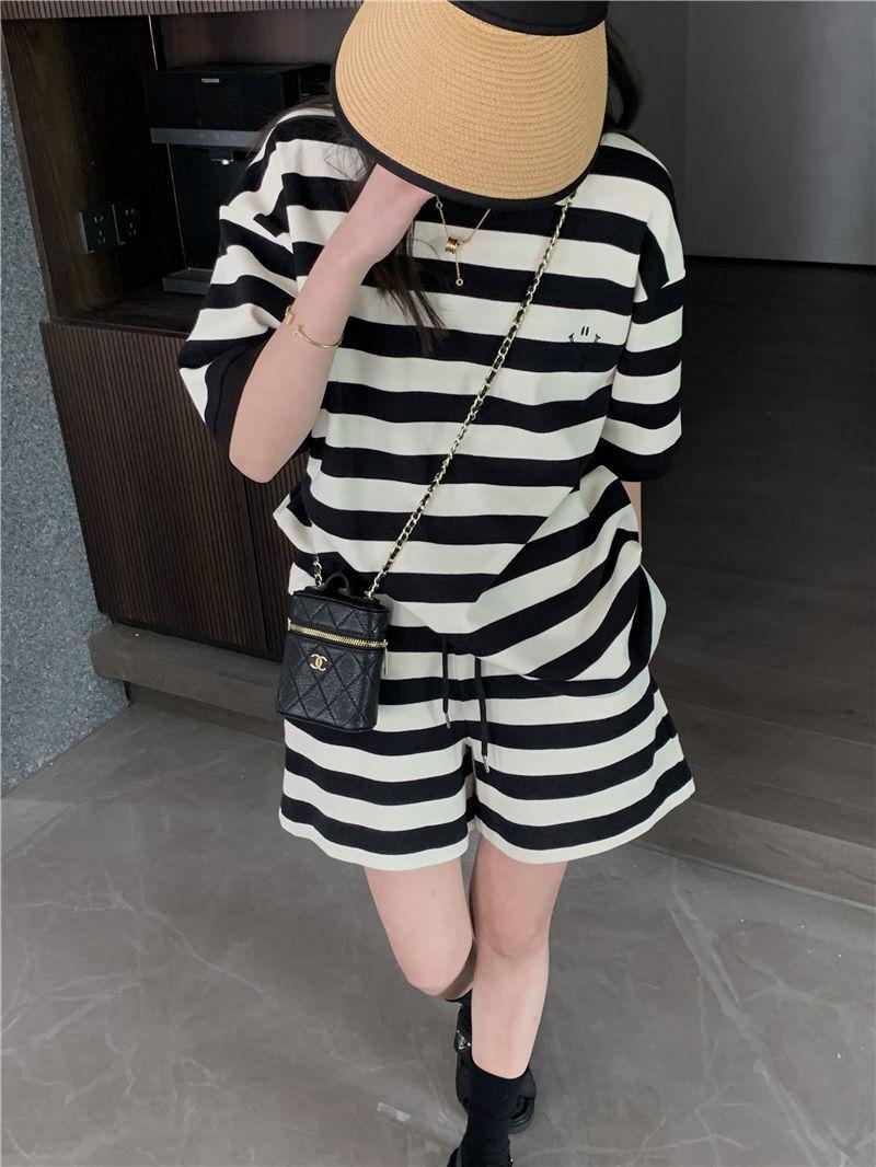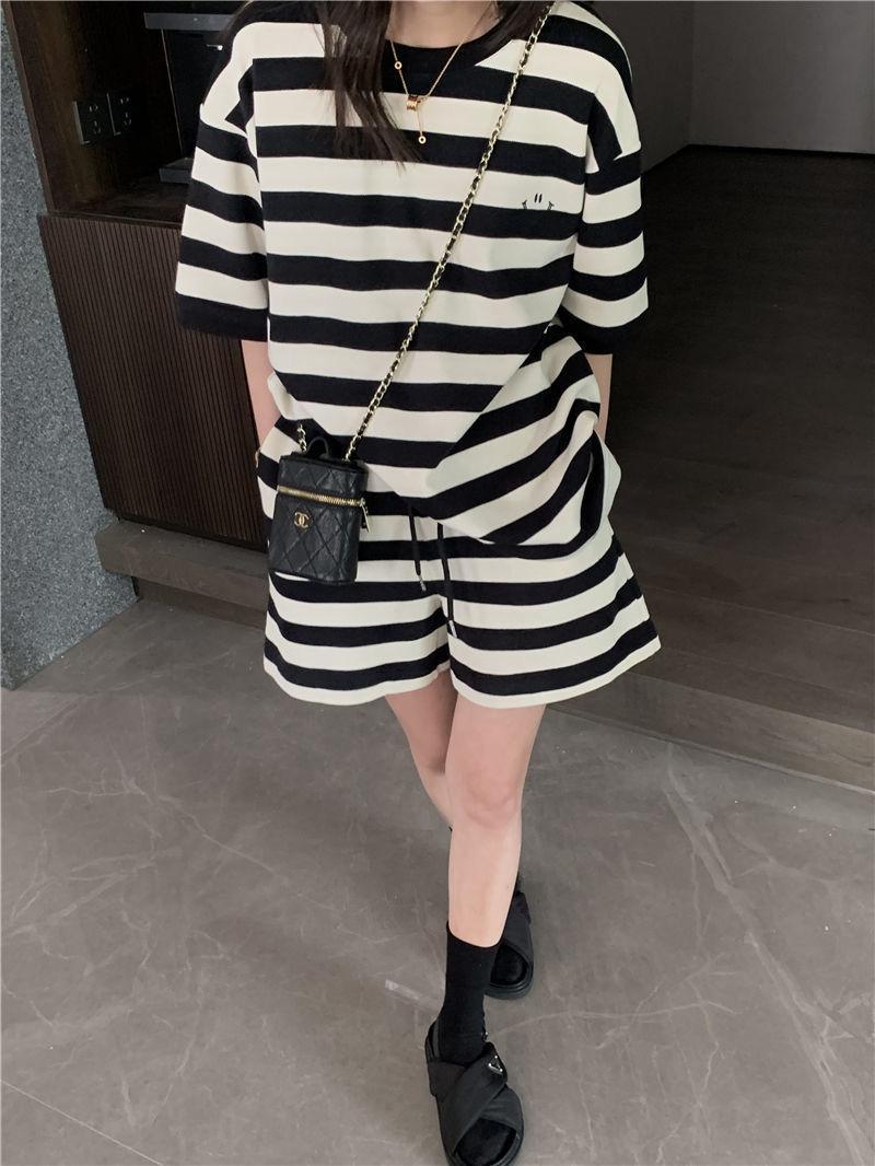 Traje Deportivo Casual de Moda a Rayas Transfronterizas para Mujer Verano Talla Extra Grande Camiseta Holgada para Mujer Shorts Conjunto de Dos Piezas Moderno