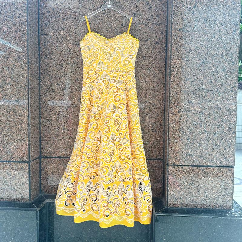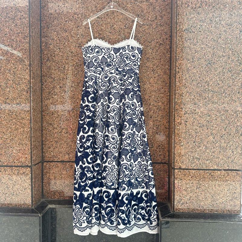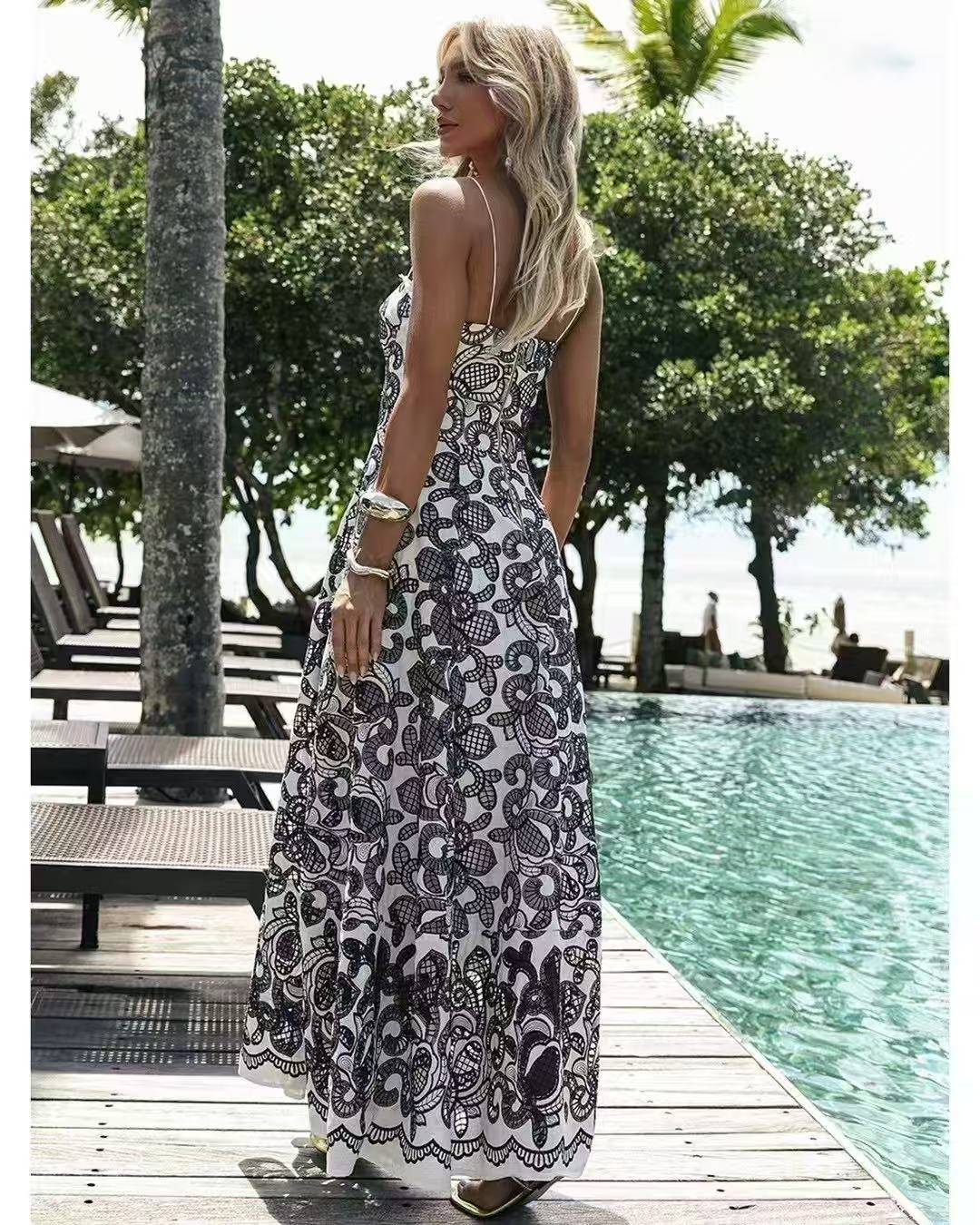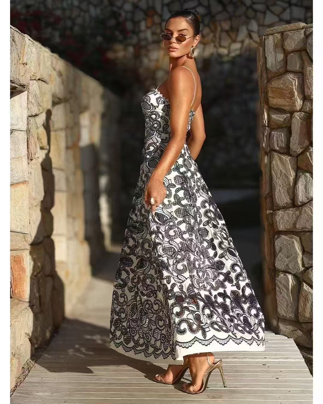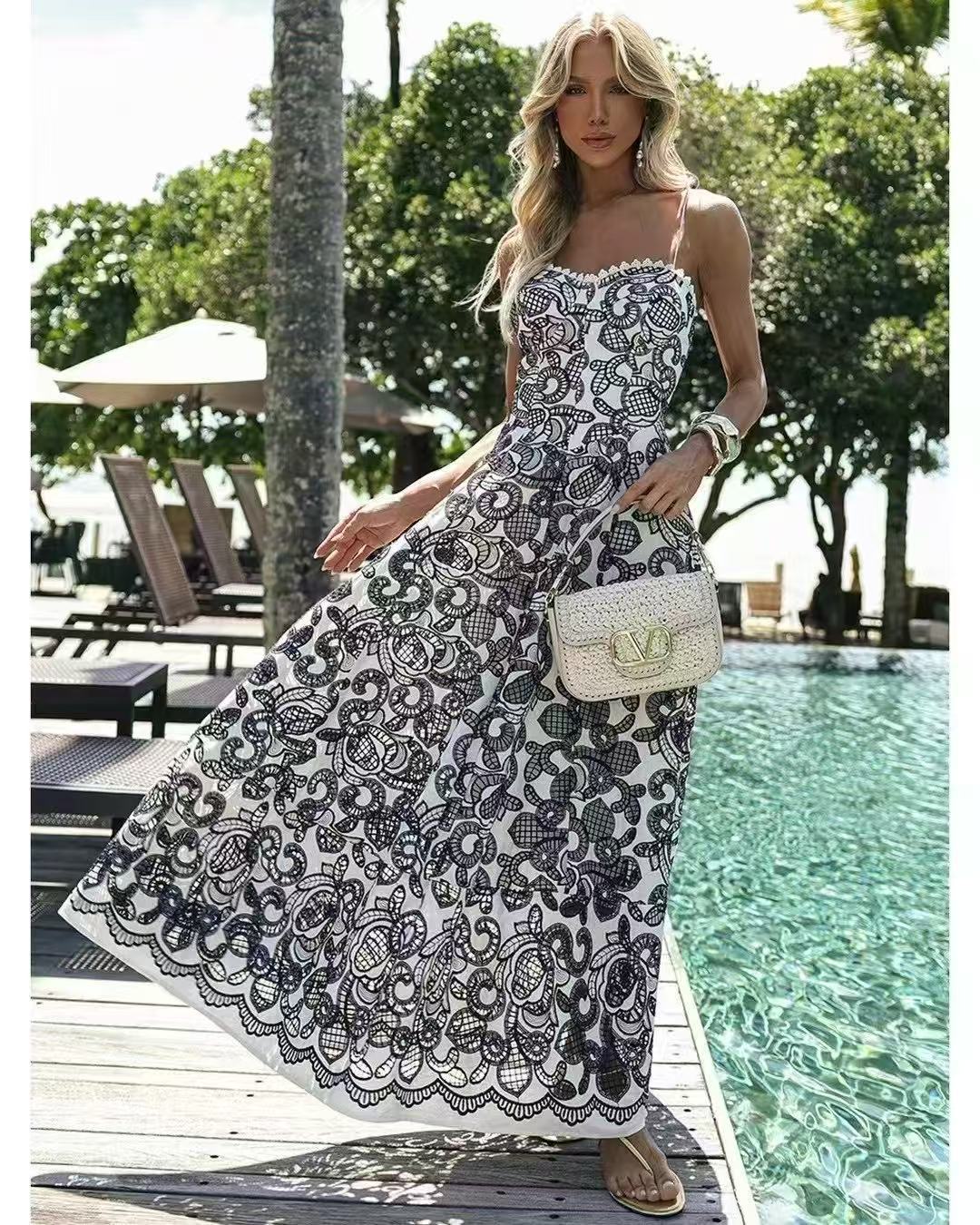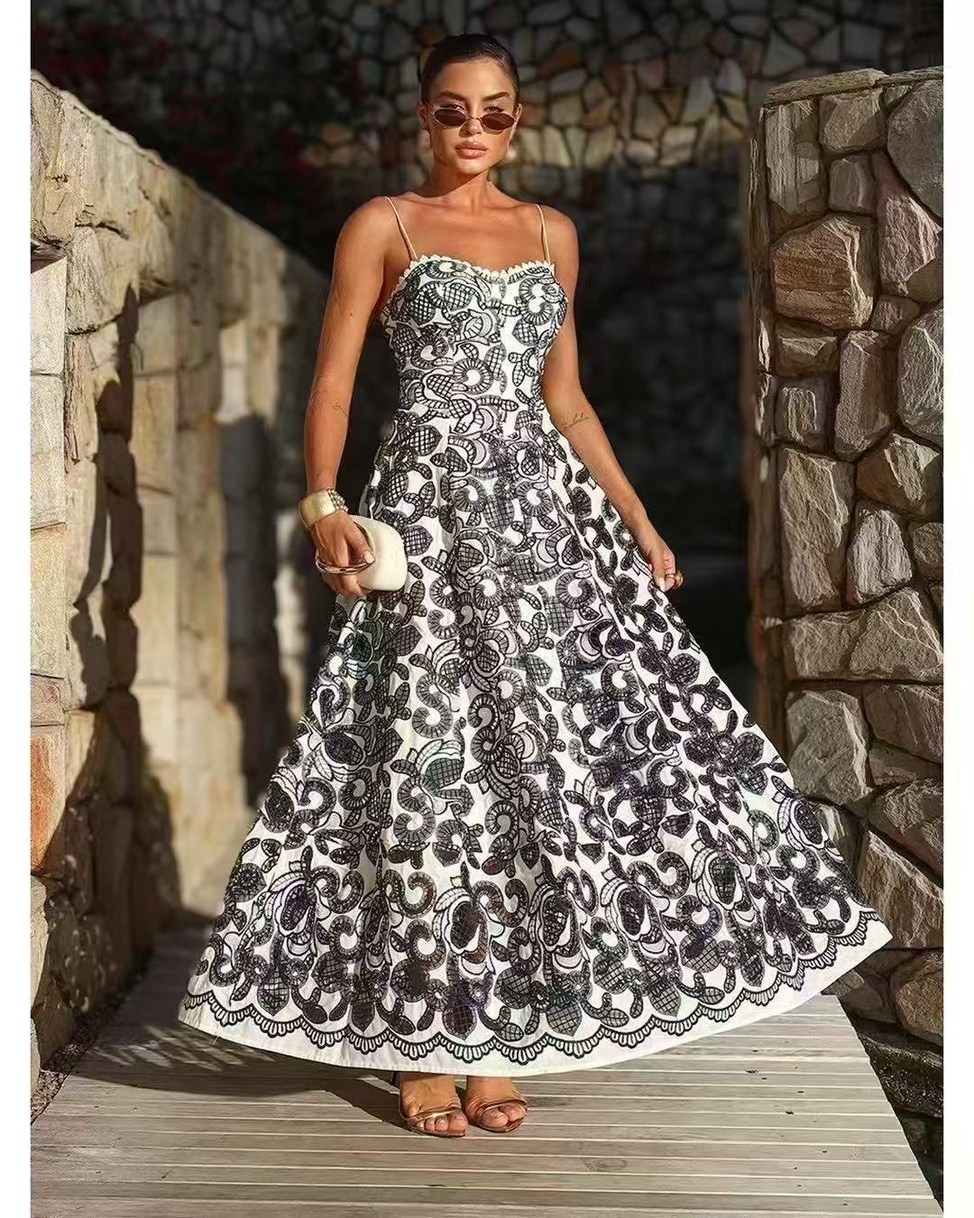 Vestido Europeo y Americano Transfronterizo con Tirantes 2025 Vacaciones en la Playa Bordado Pesado Cintura Alta Sexy Falda Larga