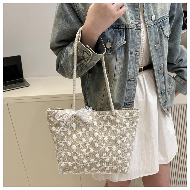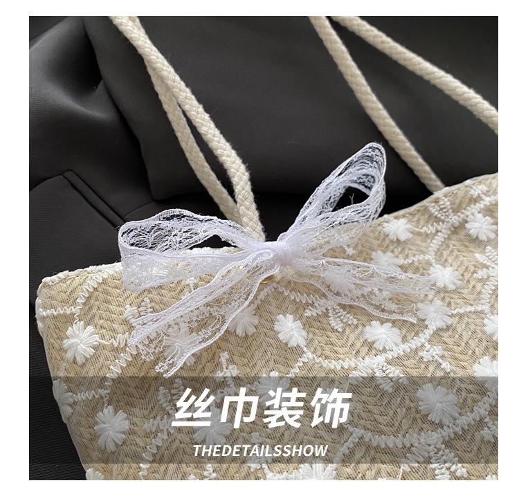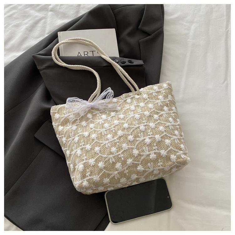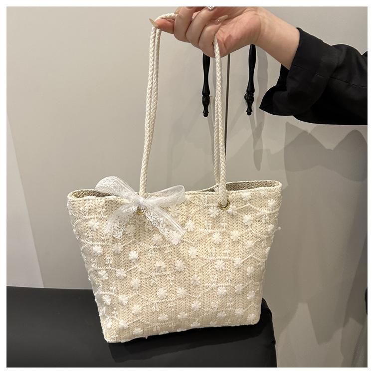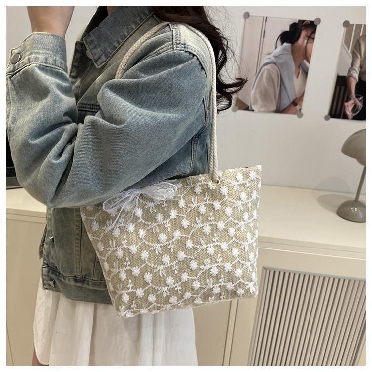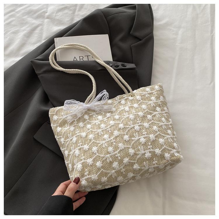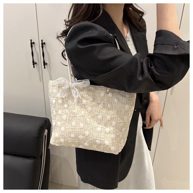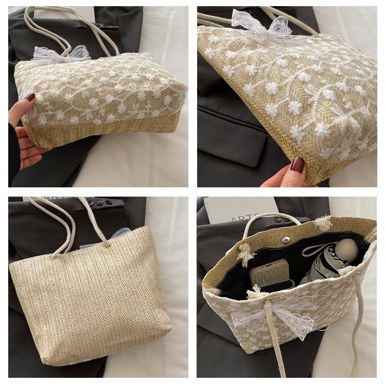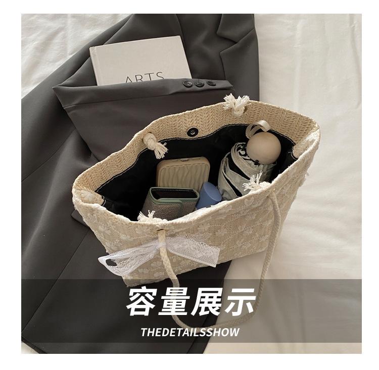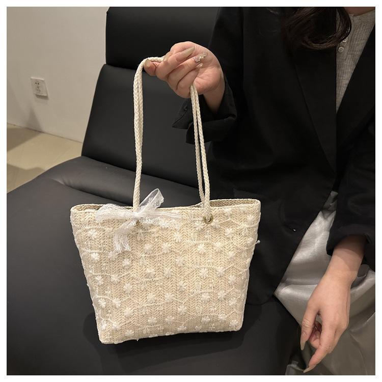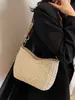 Bolso de Paja con Encaje Moda Femenina Simple Casual Portátil Tejido Hombro Axila Bolso Pequeño Fresco para Chica